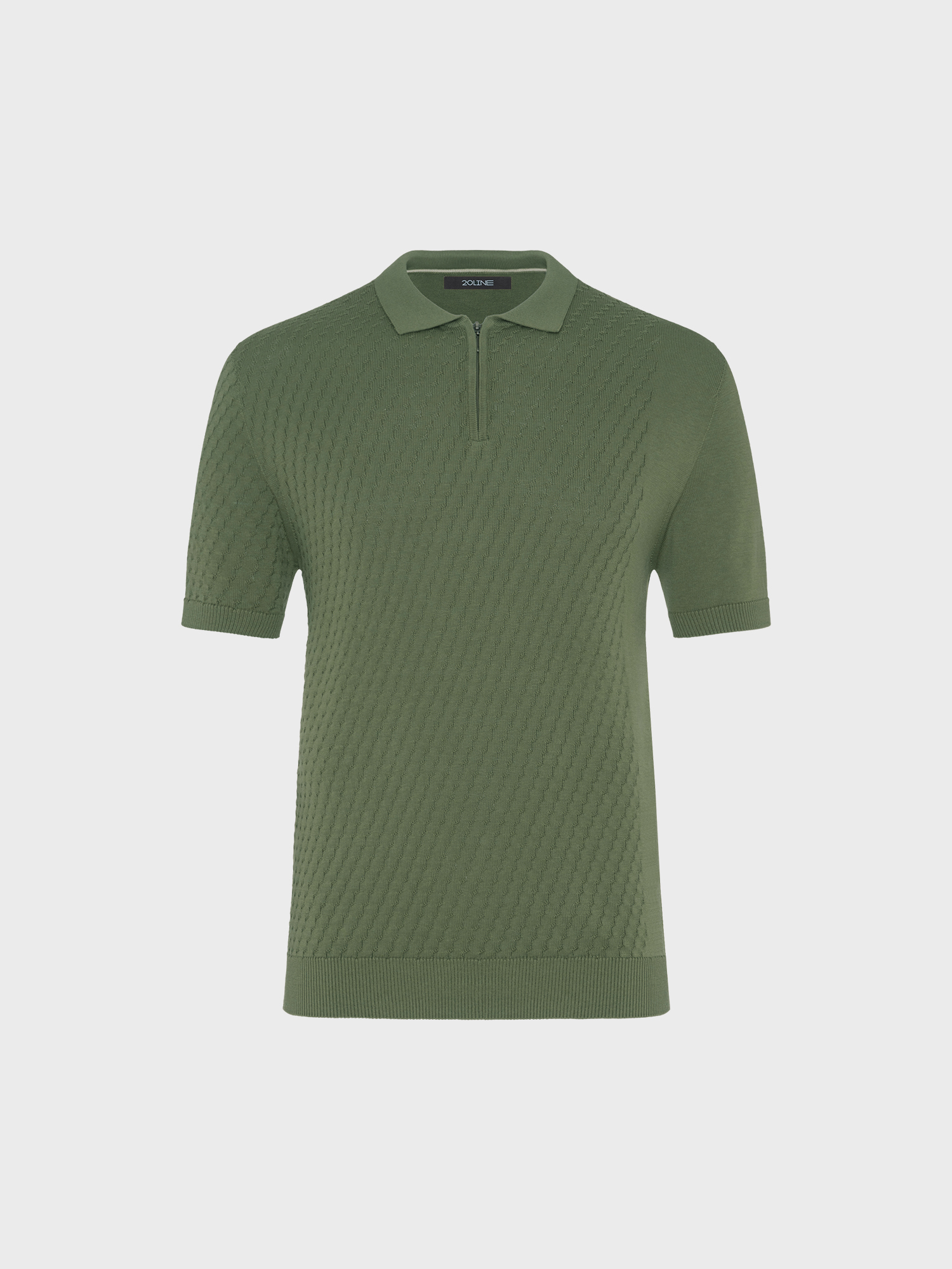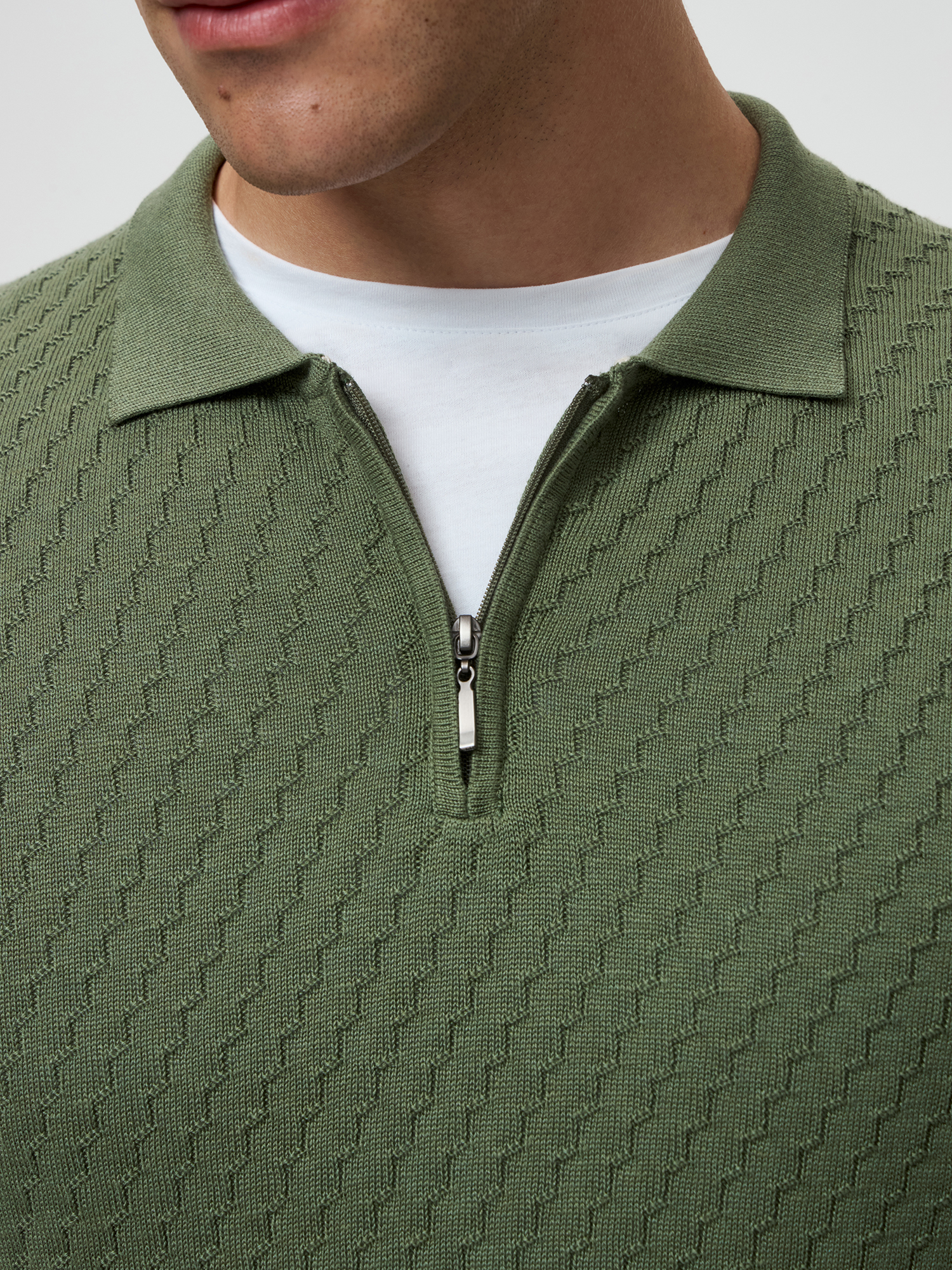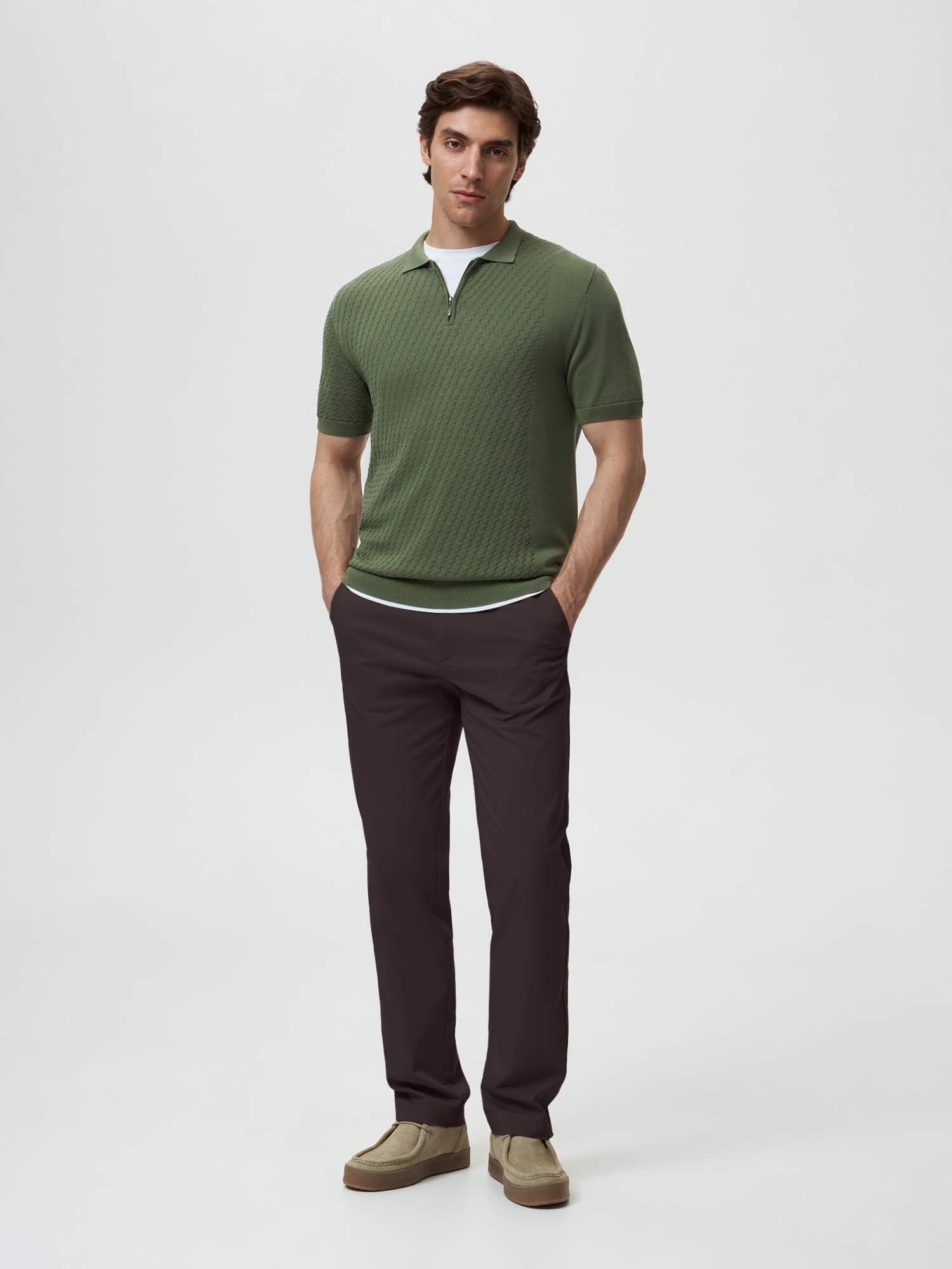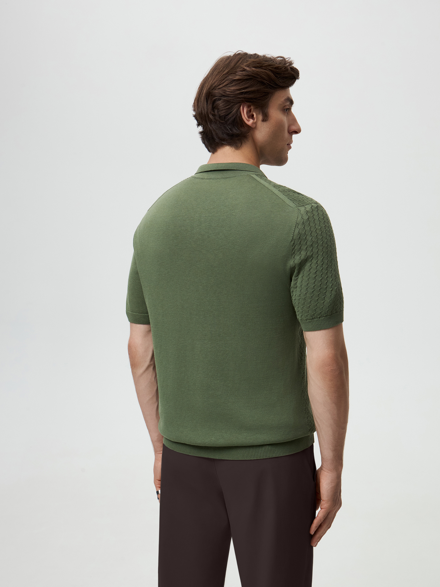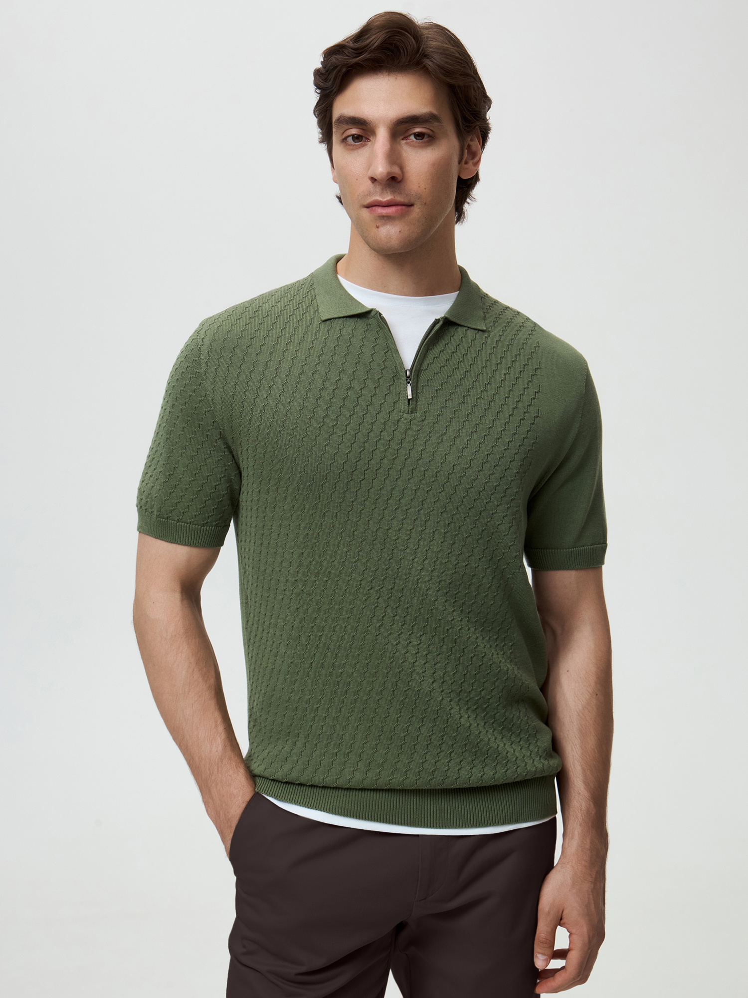Вязаная рубашка-поло в благородном оттенке хаки гармонично сочетает комфорт и стиль. Использование премиальной пряжи, состоящей из волокон шелка и хлопка, обеспечивает невероятную мягкость и приятные тактильные ощущения при носке. Шелк добавляет легкость и блеск, а хлопок — воздухопроницаемость и комфорт. Поло оснащено отложным воротником и застежкой на молнии, что придает ему современный и элегантный вид.