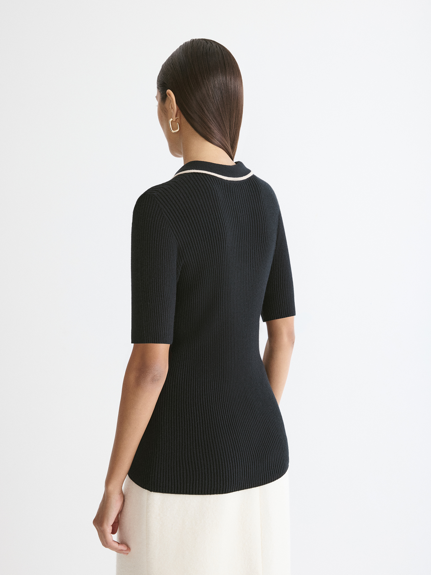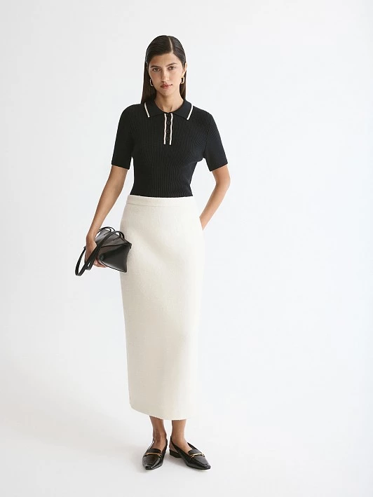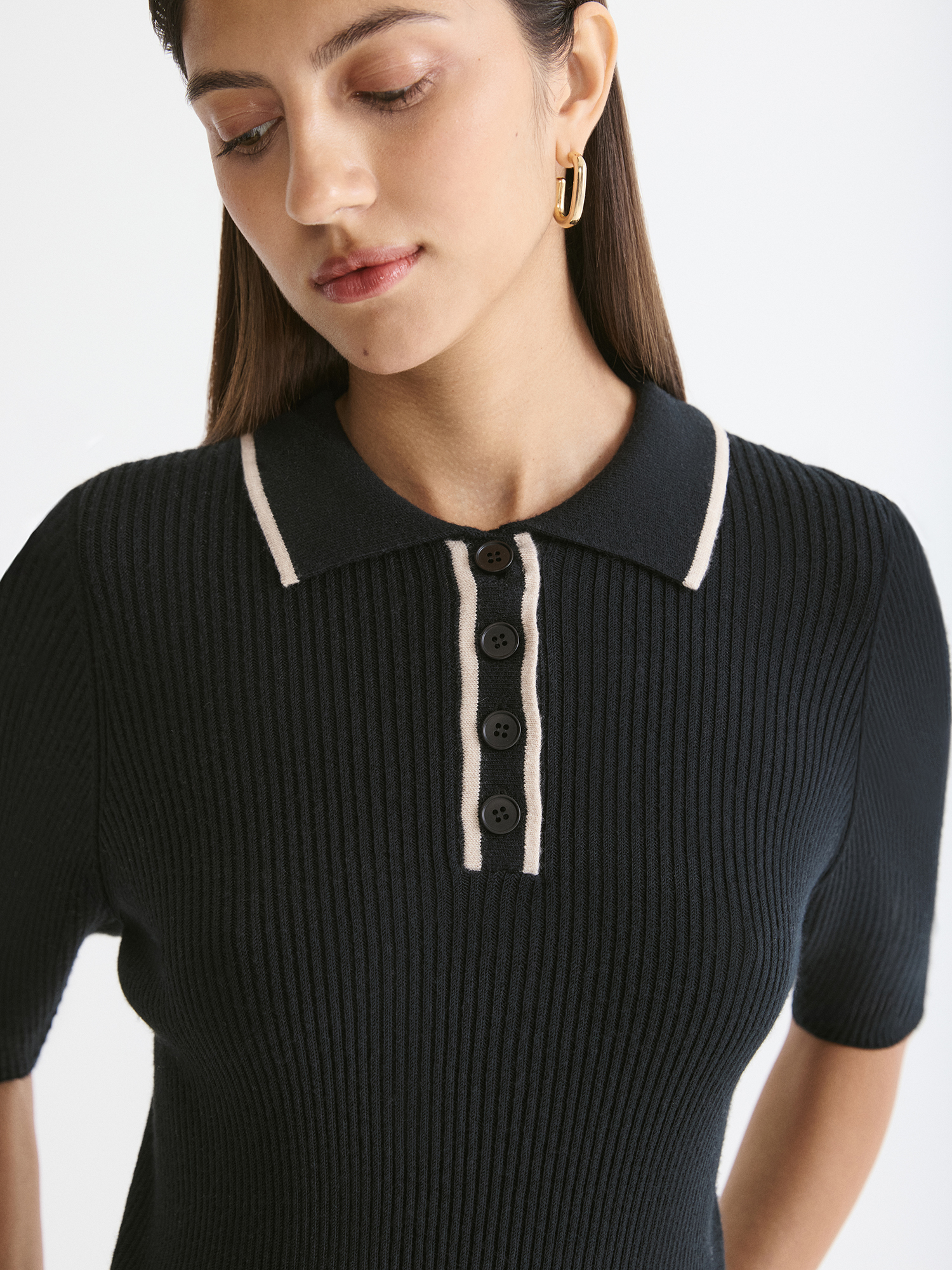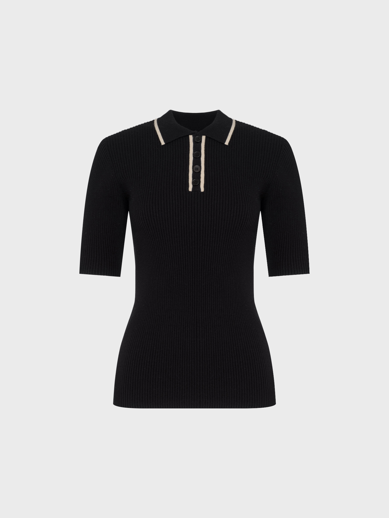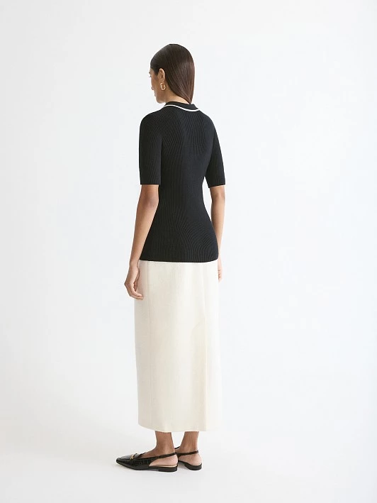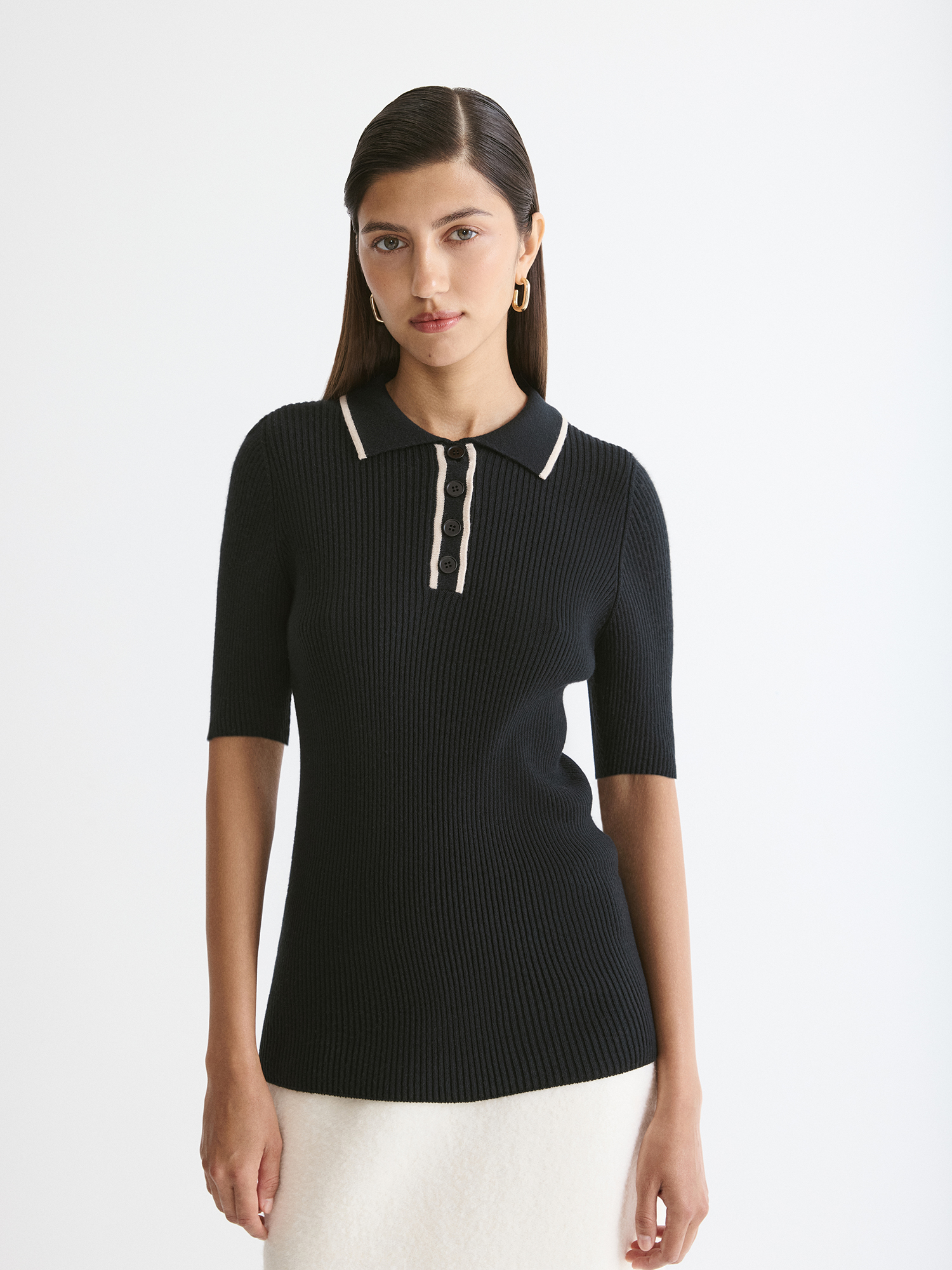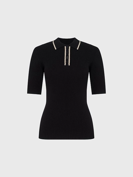 Поло, связанное по бесшовной технологии - актуальный гибрид джемпера и классической рубашки. Модель подчеркивает силуэт, а короткие рукава и отложной воротник с планкой и пуговицами добавляют узнаваемые черты поло.