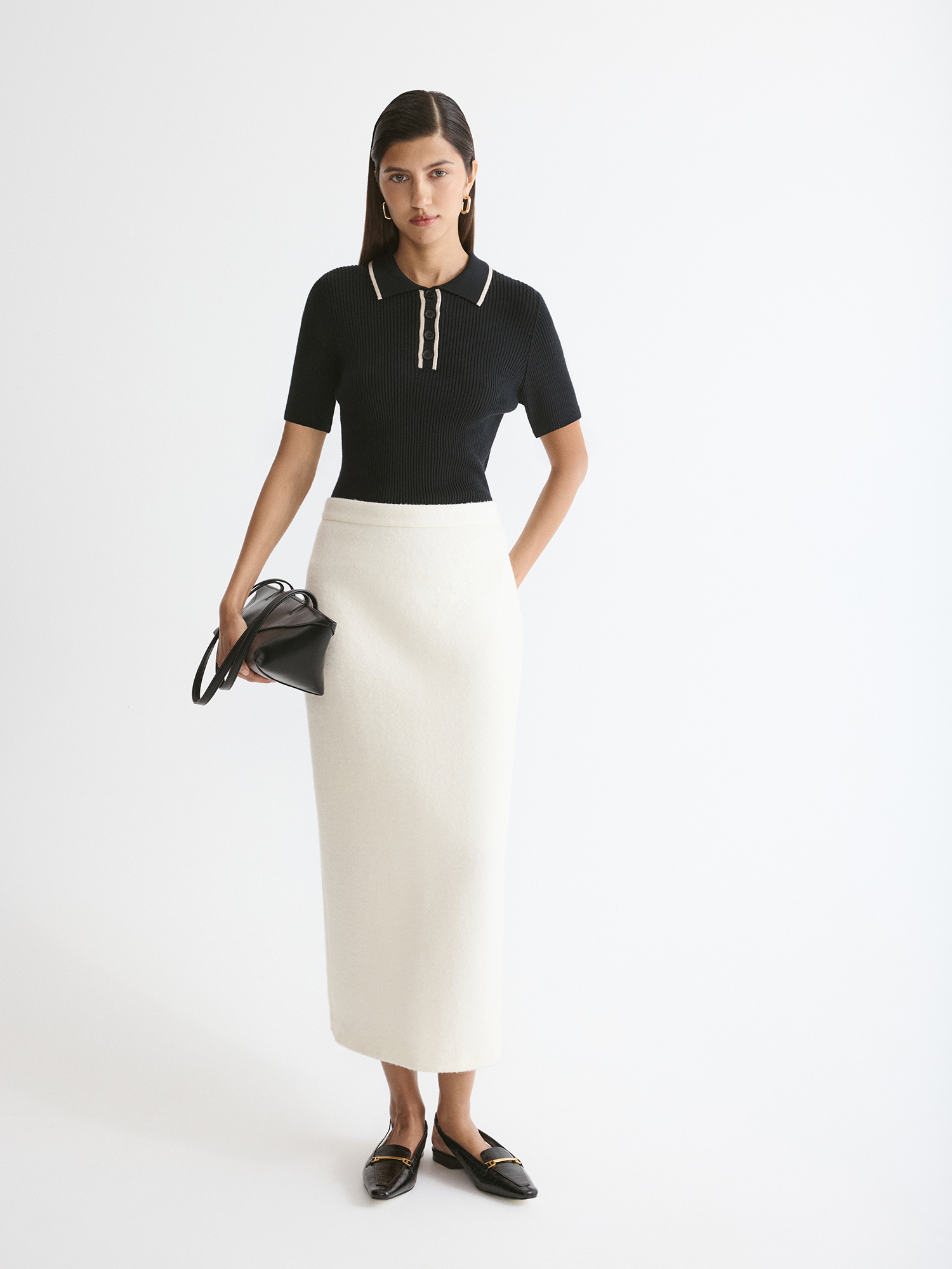 Универсальный черный цвет с бежевым кантом, комплементарным основным цветам коллекции, подойдет к классическому дениму, брюкам черным и в оттенке кэмел.