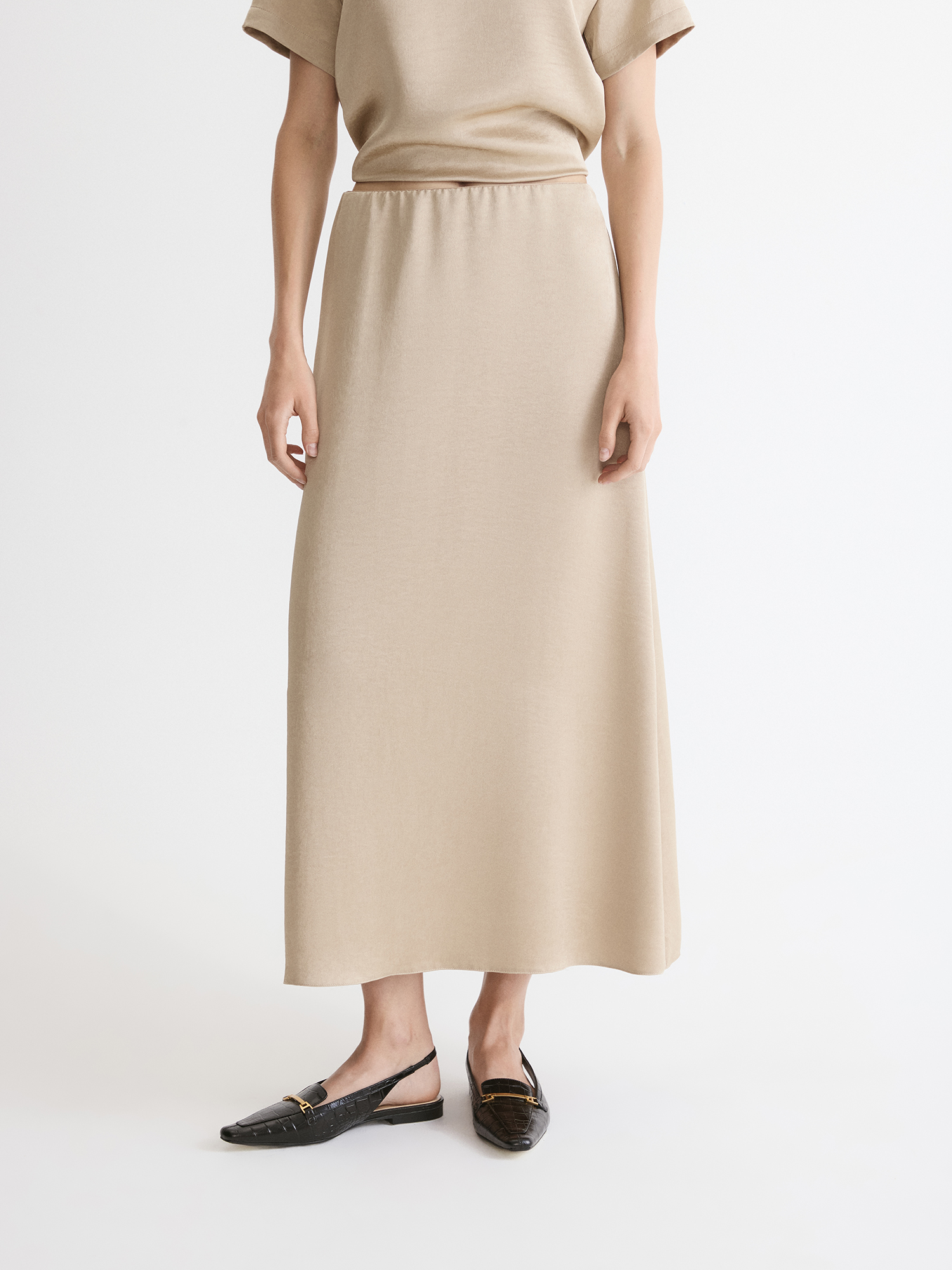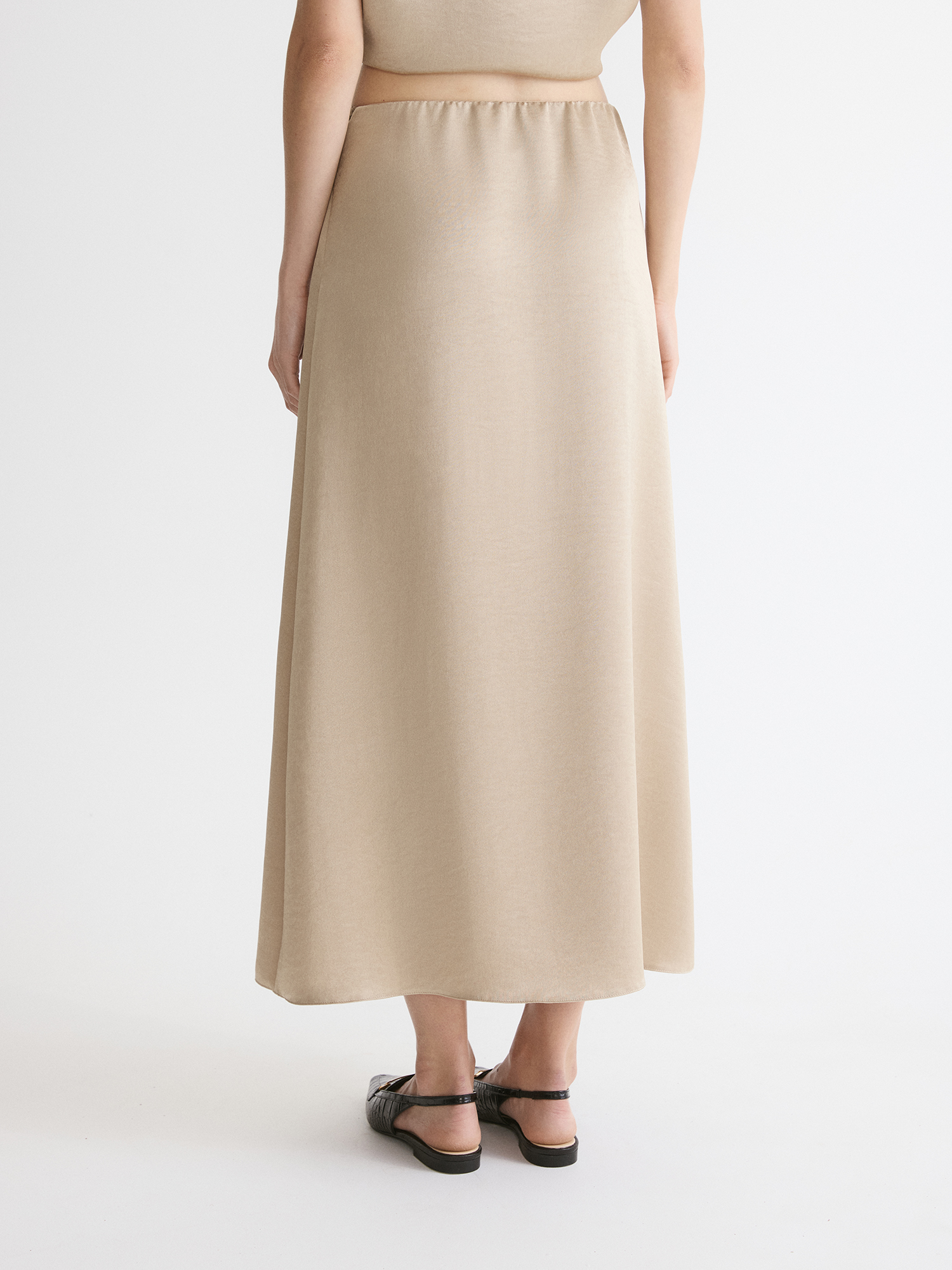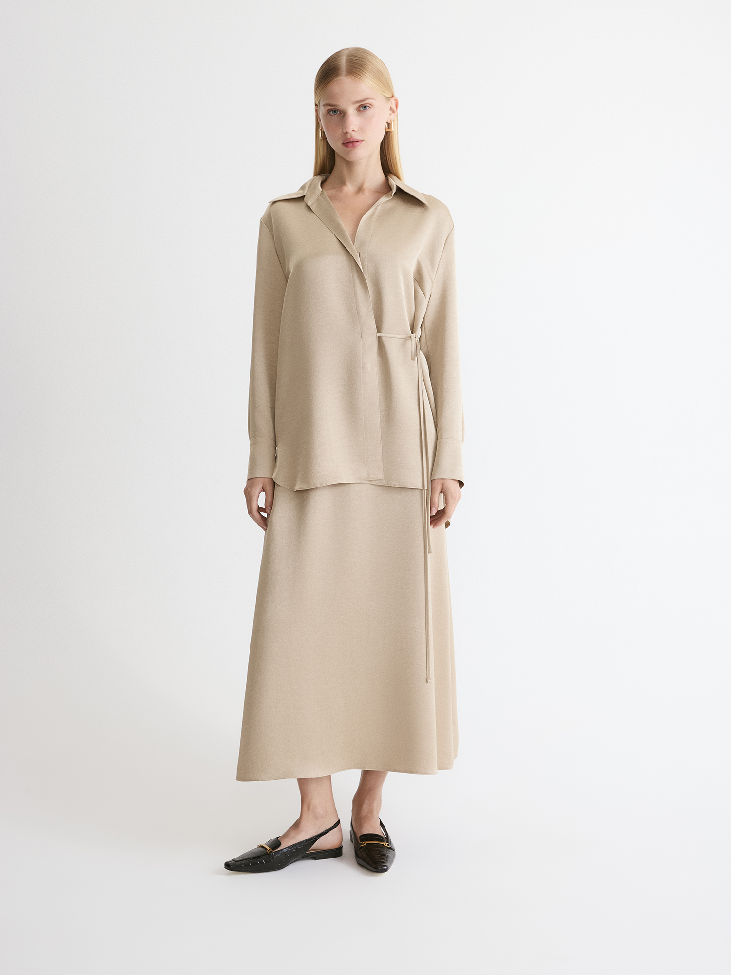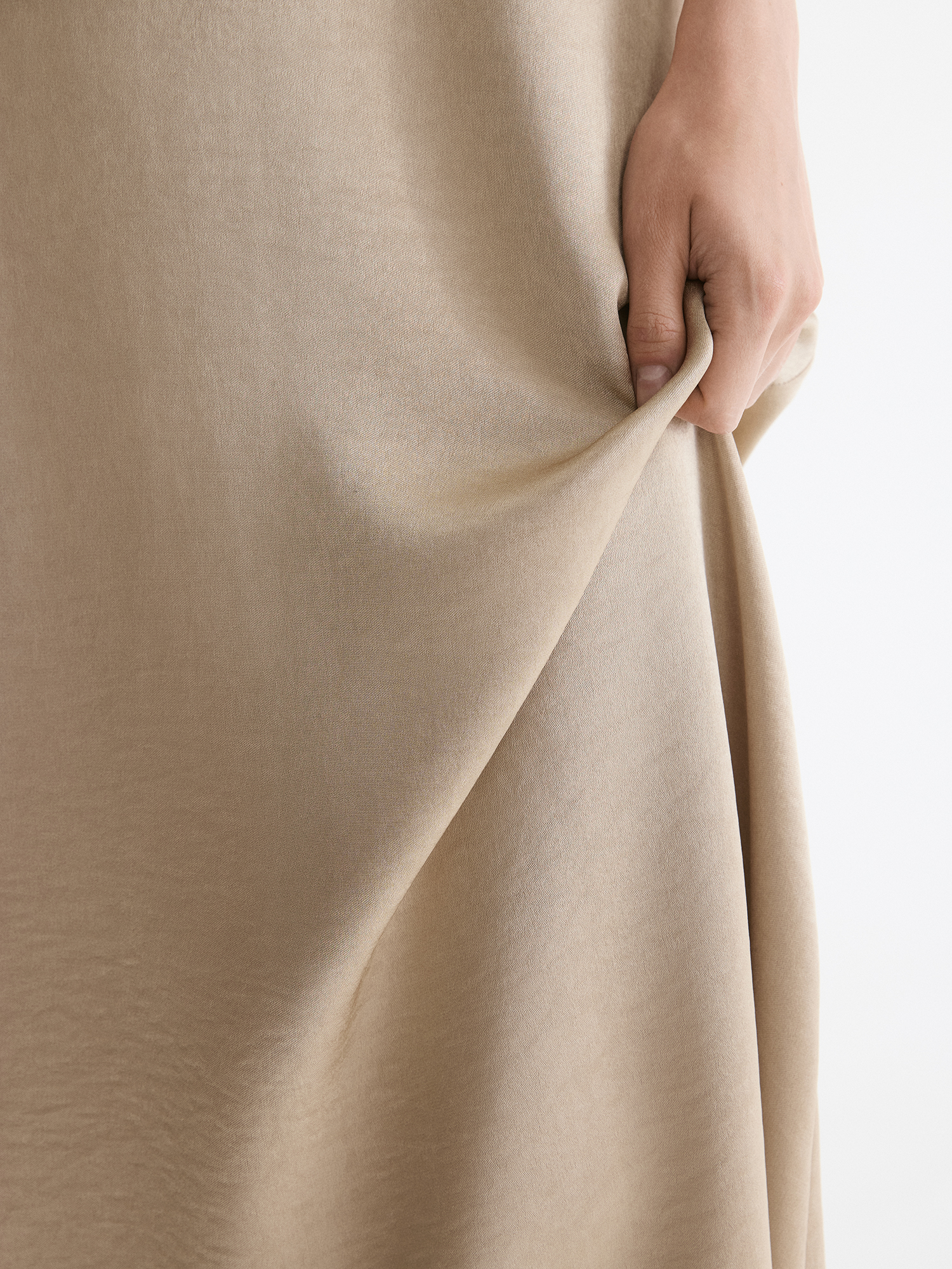 Выбрали для модели высокотехнологичный полиэстер с благородным золотым отливом и эффектом крэш. Такая жатая ткань не мнется, сохраняя форму весь день и не требуя особого ухода. Светло-бежевый с золотистым подтоном комплементарен к темным, светлым и ярким оттенкам.