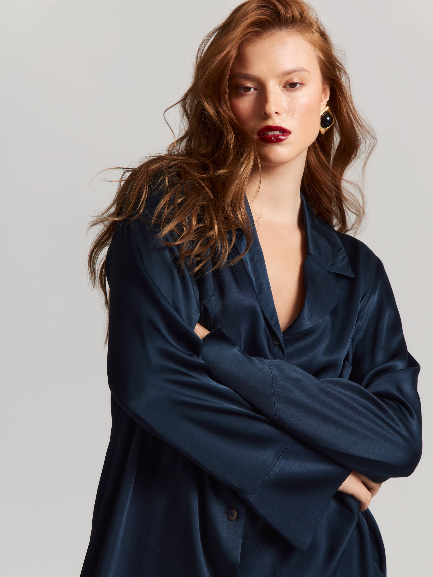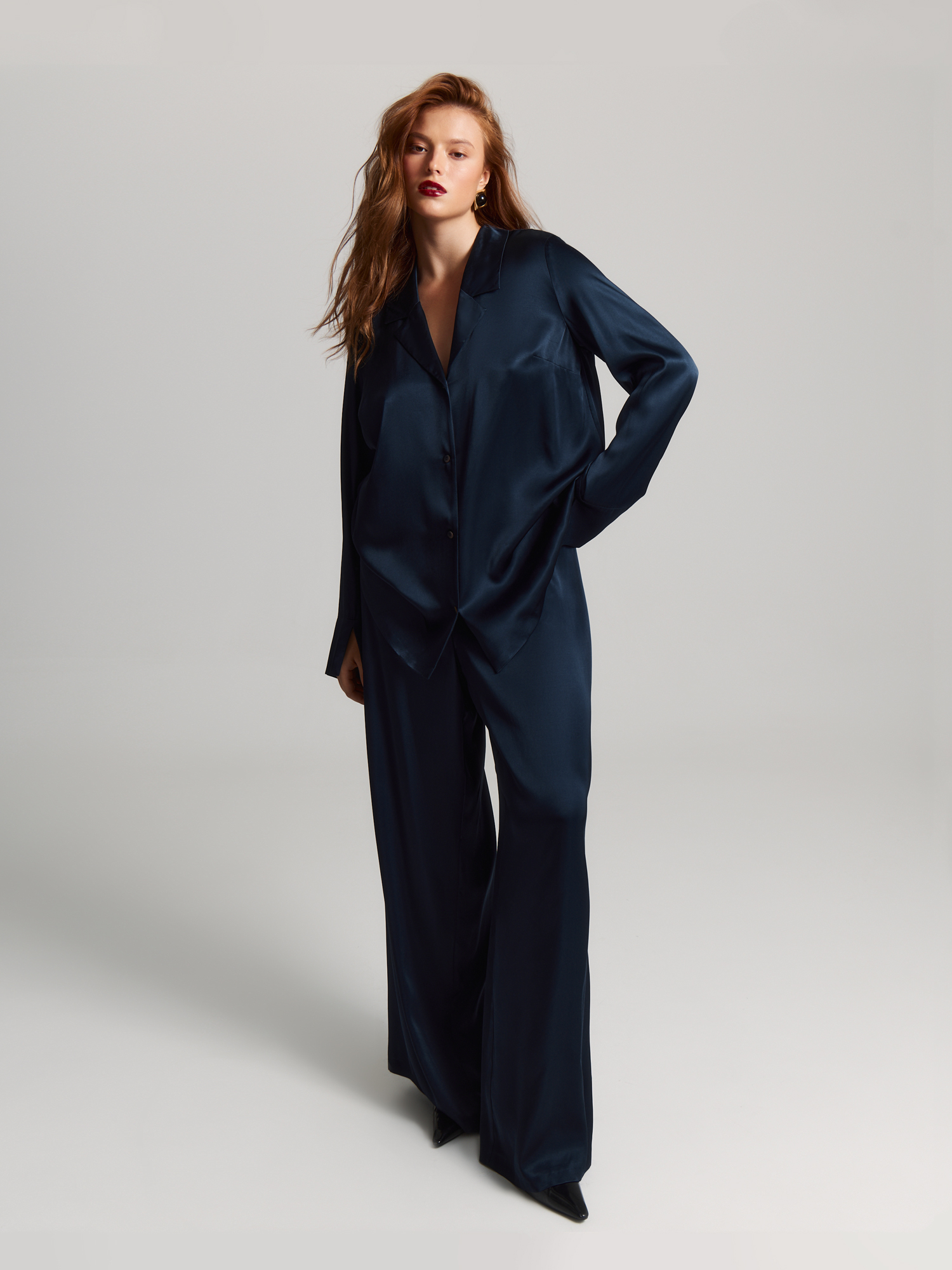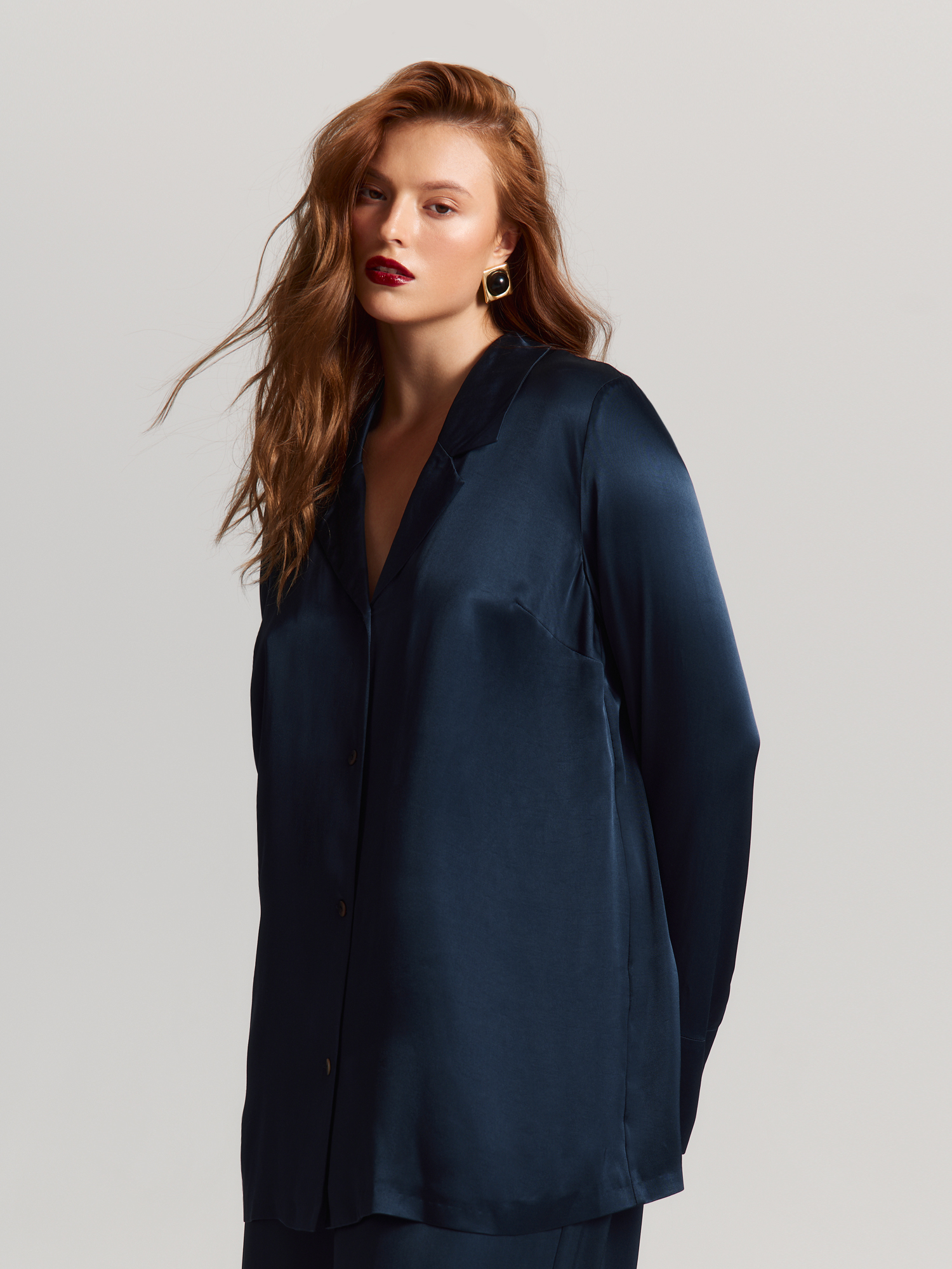 Блуза в пижамном стиле - вне трендов, а потому инвестиционная вещь. Сшитая из вискозной ткани с атласным блеском, она хорошо дышит, приятна на ощупь и красиво переливается на свету.