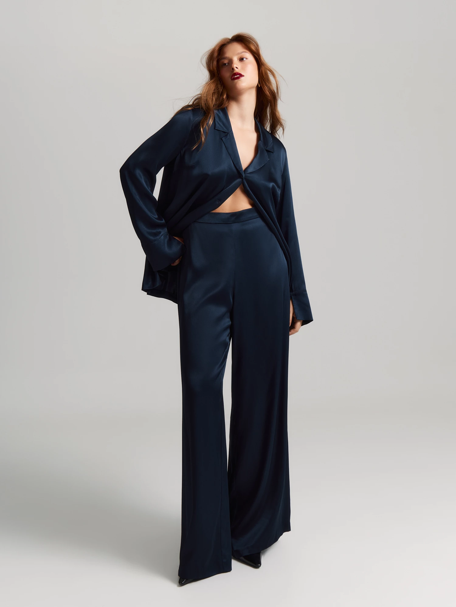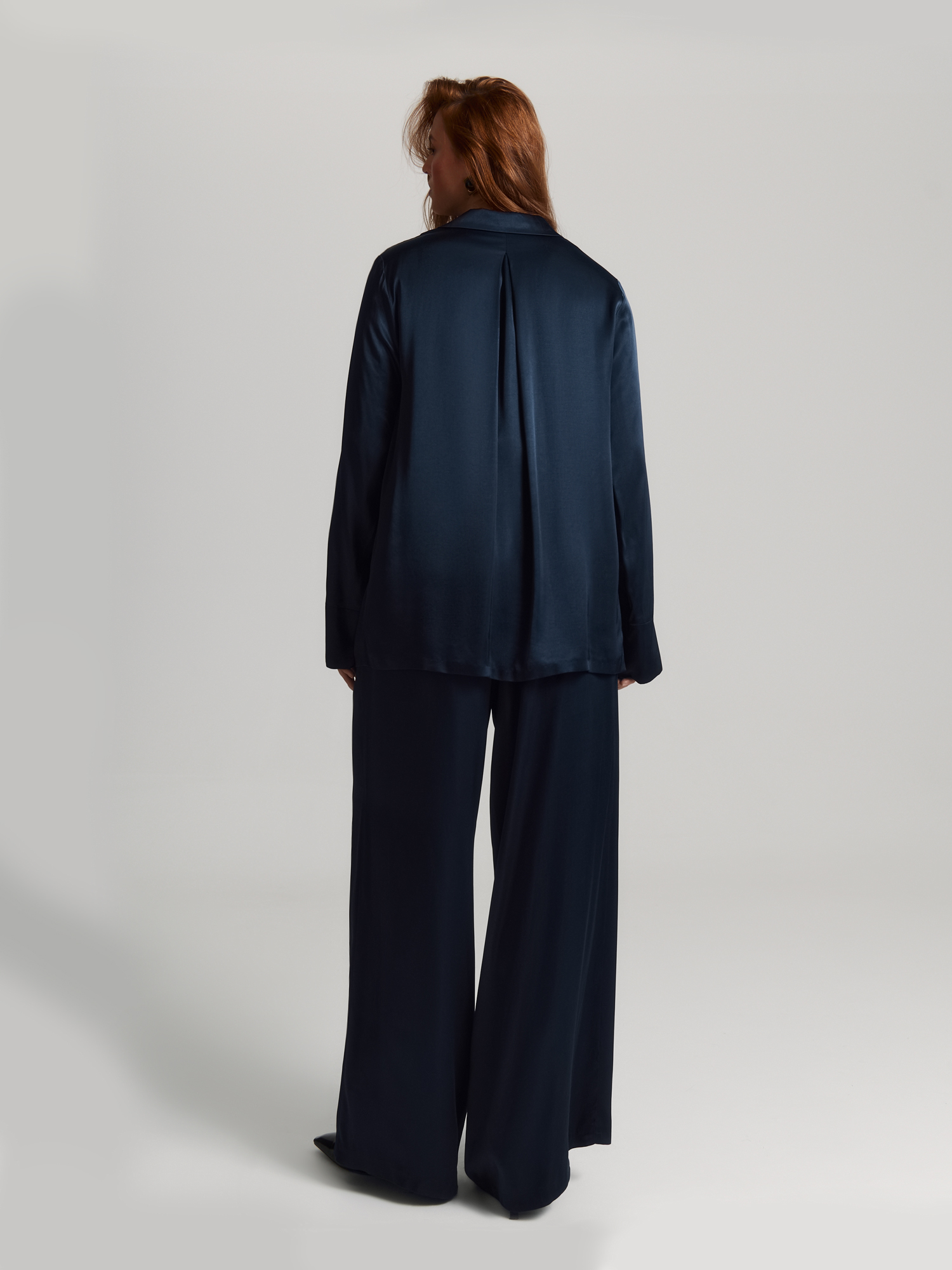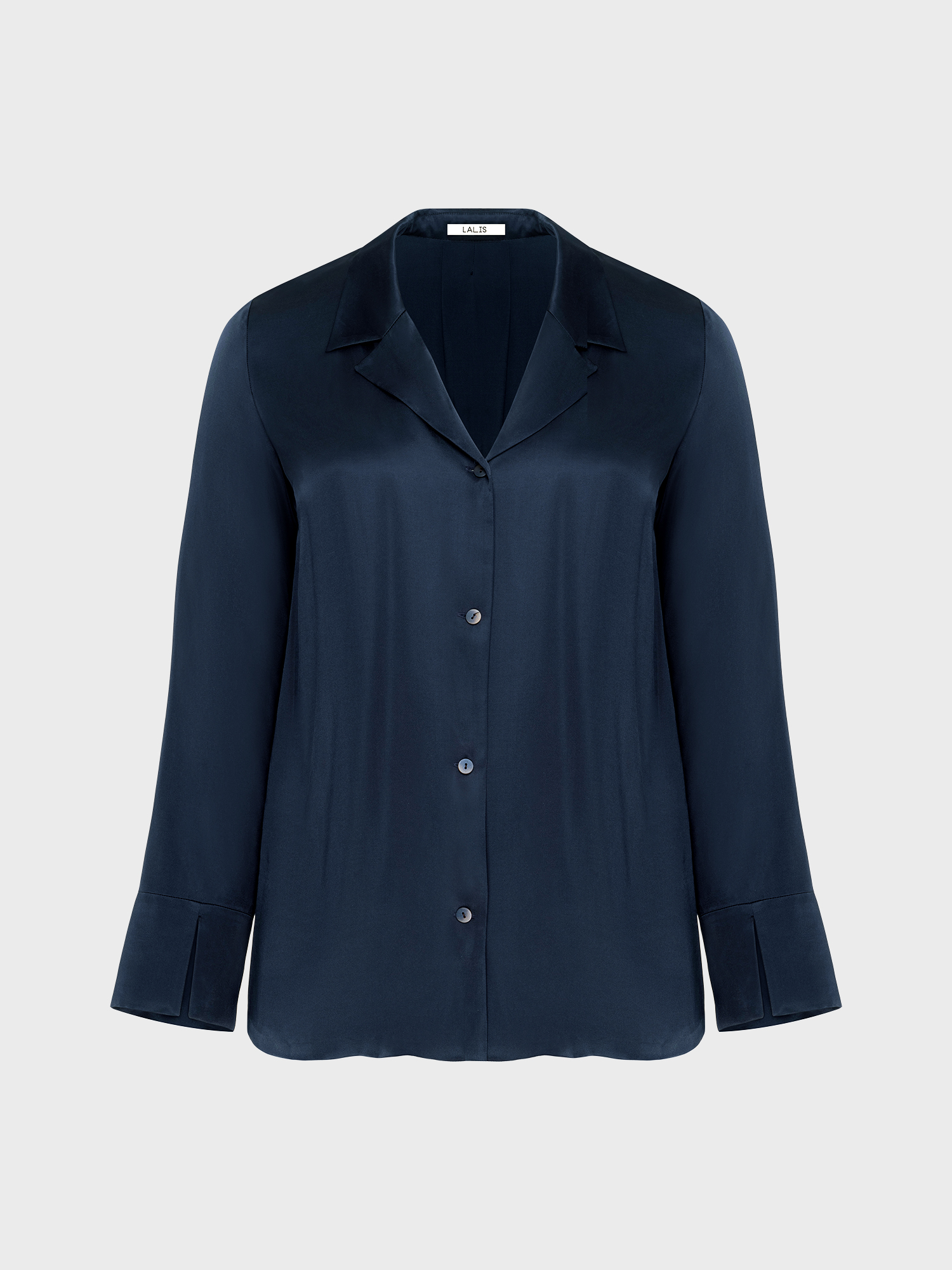 Блуза в пижамном стиле - вне трендов, а потому инвестиционная вещь. Сшитая из вискозной ткани с атласным блеском, она хорошо дышит, приятна на ощупь и красиво переливается на свету.