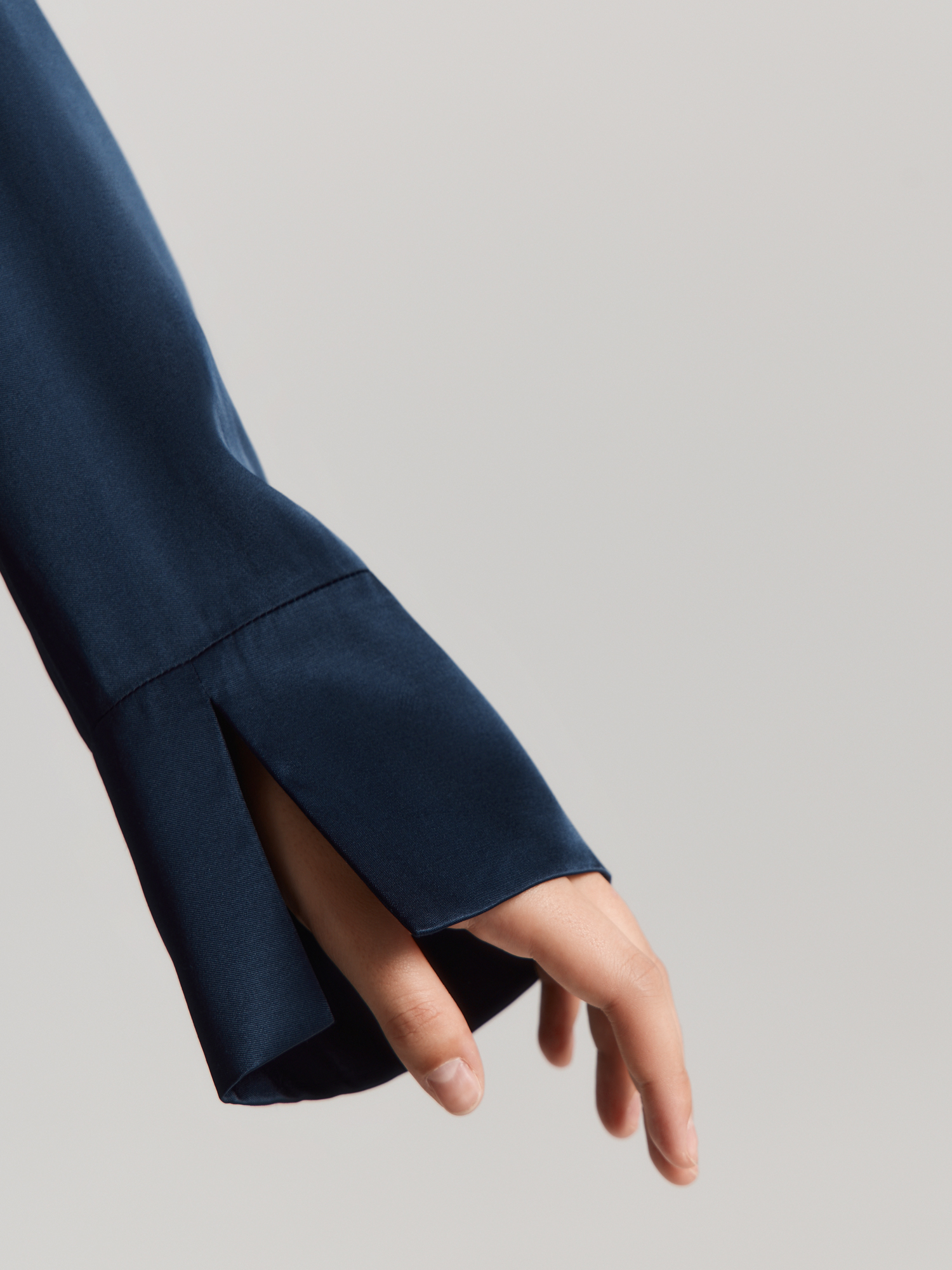 Модель с отложным воротником и спущенным плечом сидит свободно и удобно. Широкие манжеты с разрезом и без застежки работают в поддержку стиля, а складка на спине добавляет образу лёгкости.