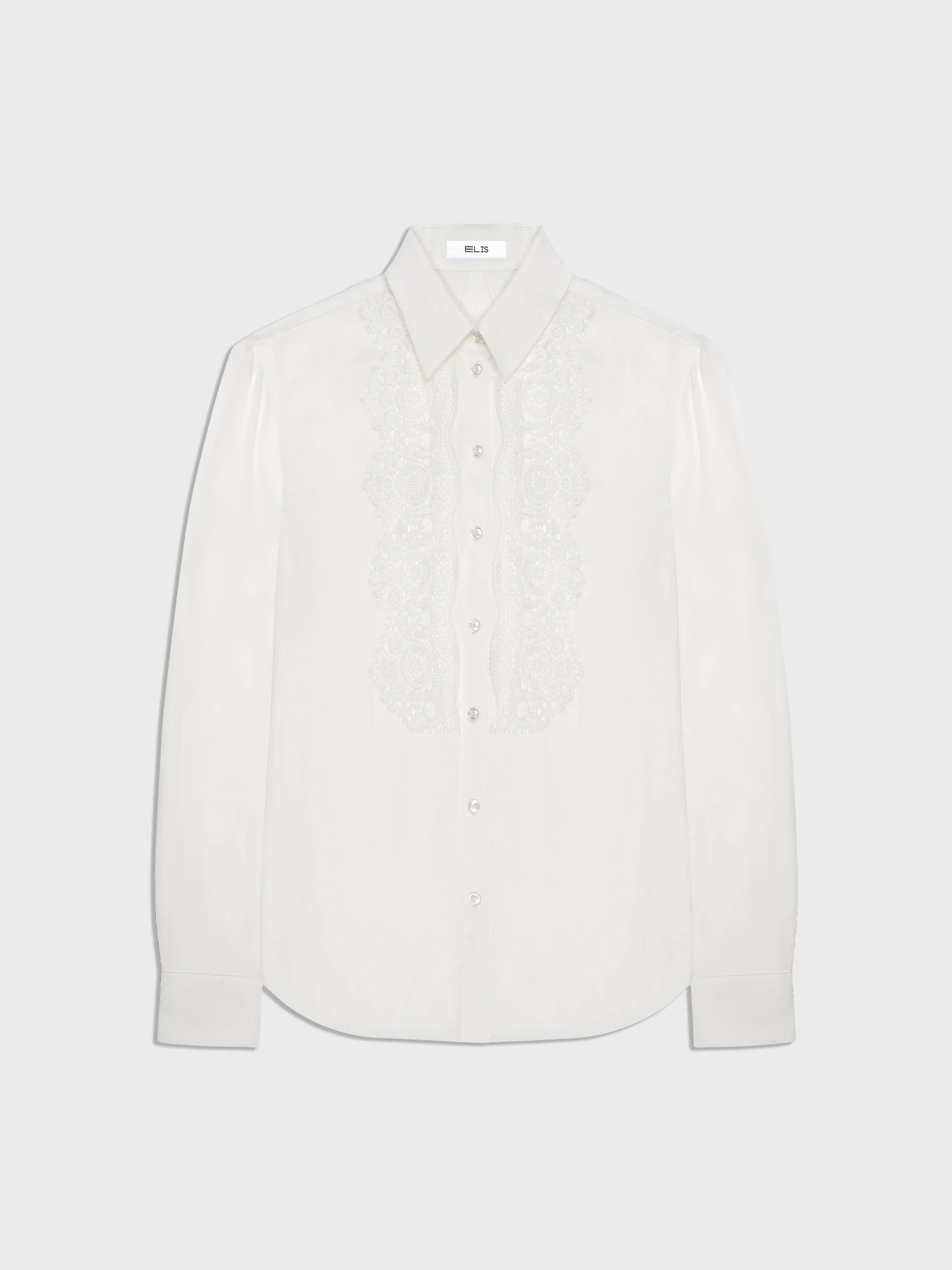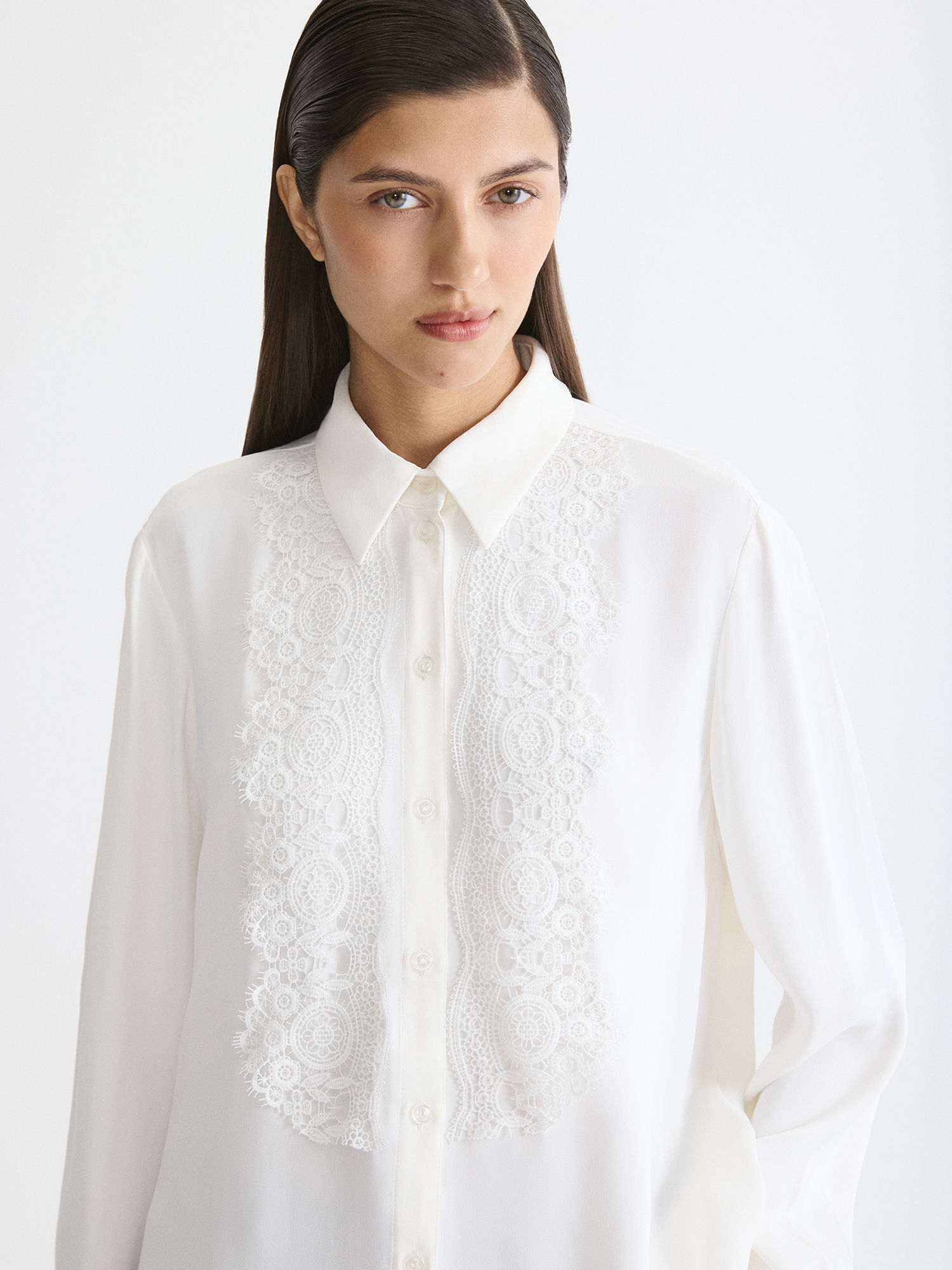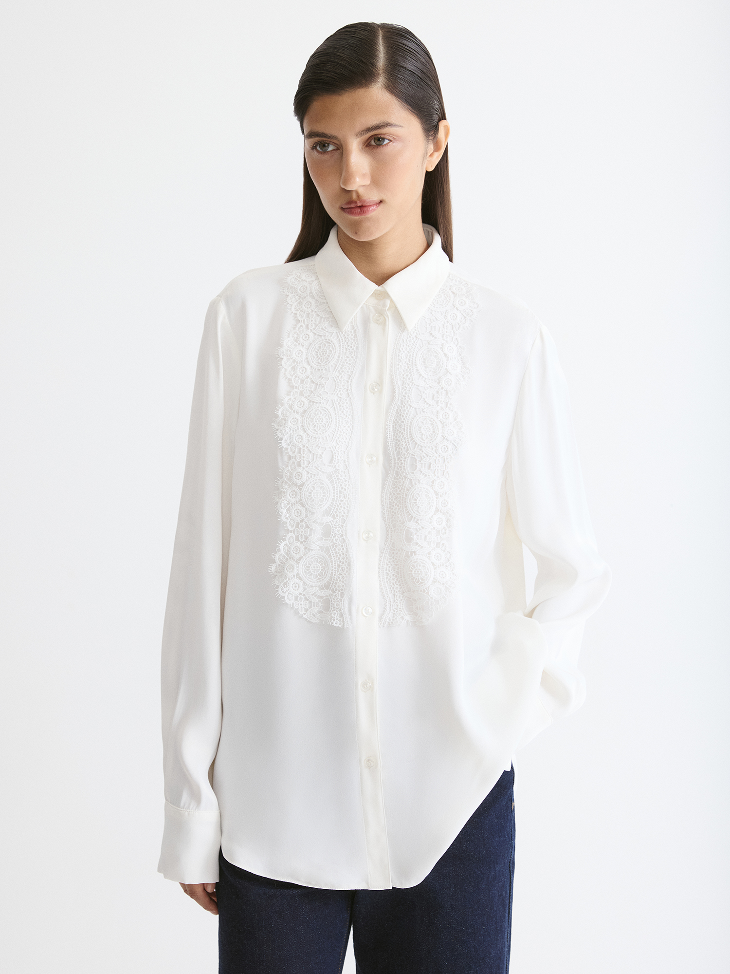 Выбрали для блузы рубашечный крой с отложным воротником на отрезной стойке и центральной планкой с лаконичными полупрозрачными пуговицами. Завершили втачной рукав манжетом, чтобы подчеркнуть изящное запястье. Нежное кружево "с ресничками" в классическом белом отражает стремление дизайнеров к эстетике изысканного гламура.
