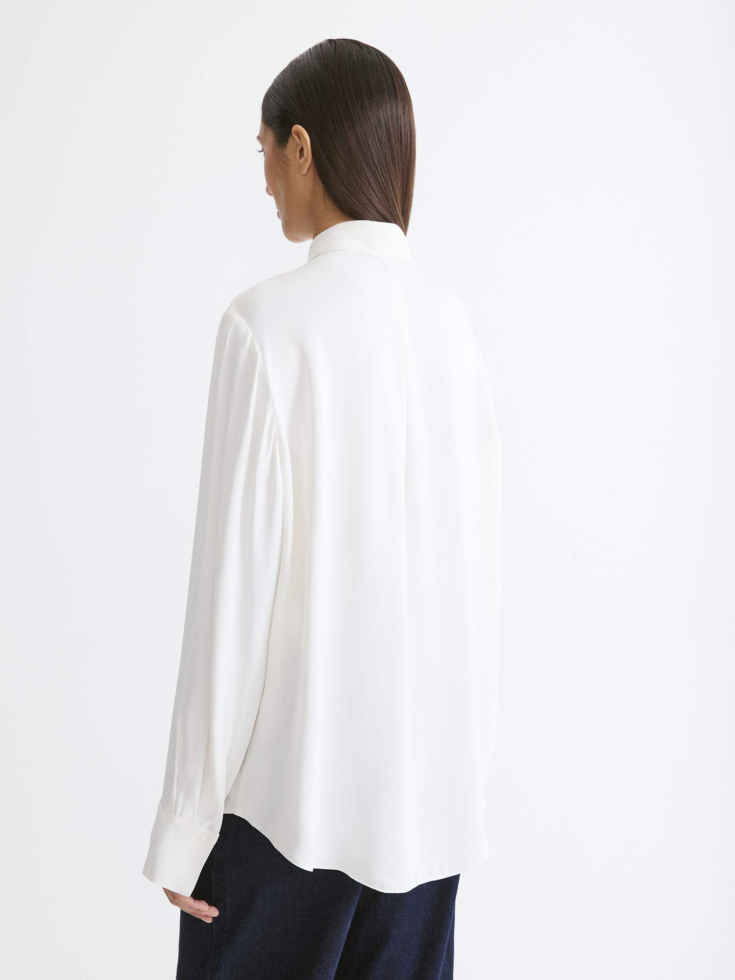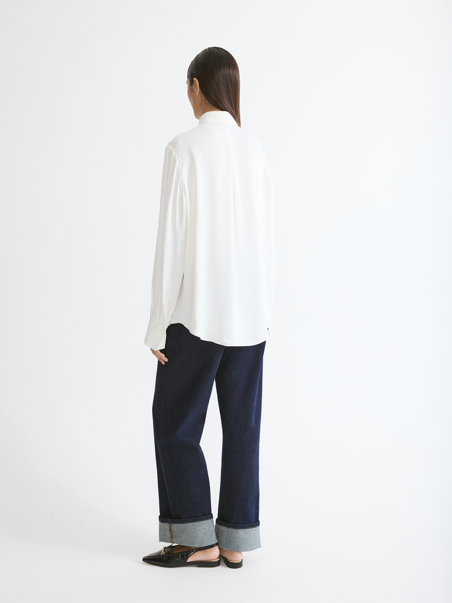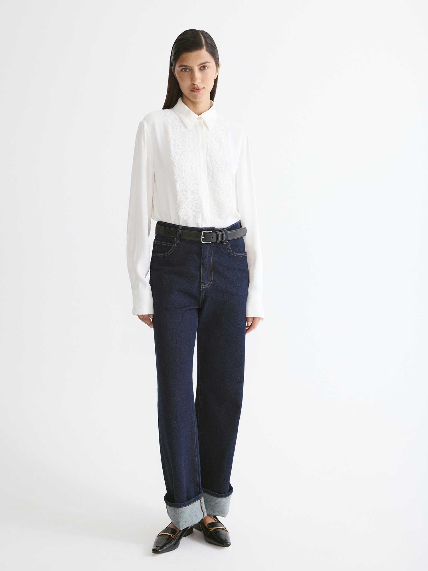 Выбрали для блузы рубашечный крой с отложным воротником на отрезной стойке и центральной планкой с лаконичными полупрозрачными пуговицами. Завершили втачной рукав манжетом, чтобы подчеркнуть изящное запястье. Нежное кружево "с ресничками" в классическом белом отражает стремление дизайнеров к эстетике изысканного гламура.