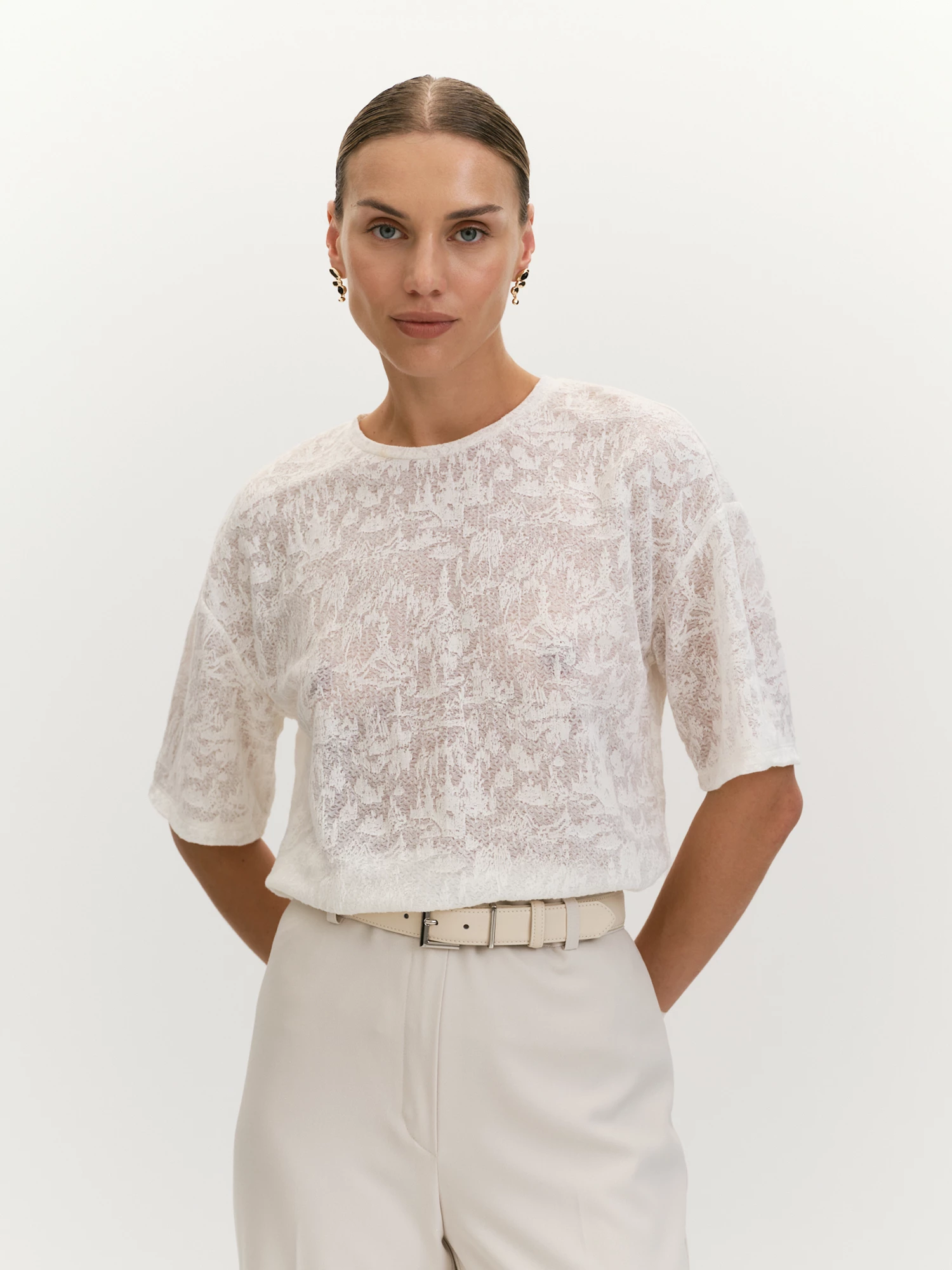 Блуза из трикотажного кружева — настоящая находка для женщин, стремящихся к элегантности и комфорту. Универсальный и стильный дизайн позволяет легко интегрировать ее в различные образы, от повседневных до более нарядных. Одной из ключевых особенностей этой блузы является аккуратный круглый вырез горловины, который подчеркивает линию шеи и создает изящный силуэт. Такой вырез делает блузу подходящей для различных случаев, будь то деловая встреча или вечерняя прогулка. Втачные короткие рукава со спущенным плечом добавляют модели легкости и непринужденности, создавая эффектный и расслабленный образ. Прямой крой блузы обеспечивает свободу движений, что особенно важно для ценящих комфорт в повседневной жизни. Ткань блузы выполнена из высококачественного трикотажного кружева, которое сочетает в себе хлопок, нейлон и шелк. Это уникальное сочетание материалов обеспечивает мягкость и легкость, а также приятные тактильные ощущения при носке. Кружево с фантазийным принтом добавляет изысканности и креативности, позволяя создавать стильные и запоминающиеся образы. Оригинальный дизайн кружевной ткани придает блузе романтичный и утонченный вид, что делает ее идеальным выбором для создания женственных нарядов. Блуза хорошо дышит, что делает ее комфортной в носке в любое время года. Она легко комбинируется с различными предметами гардероба, такими как юбки, брюки или шорты, позволяя создавать разнообразные стили. Благодаря своей универсальности, блуза из трикотажного кружева станет отличным дополнением как к деловым, так и к более кэжуальным образам.