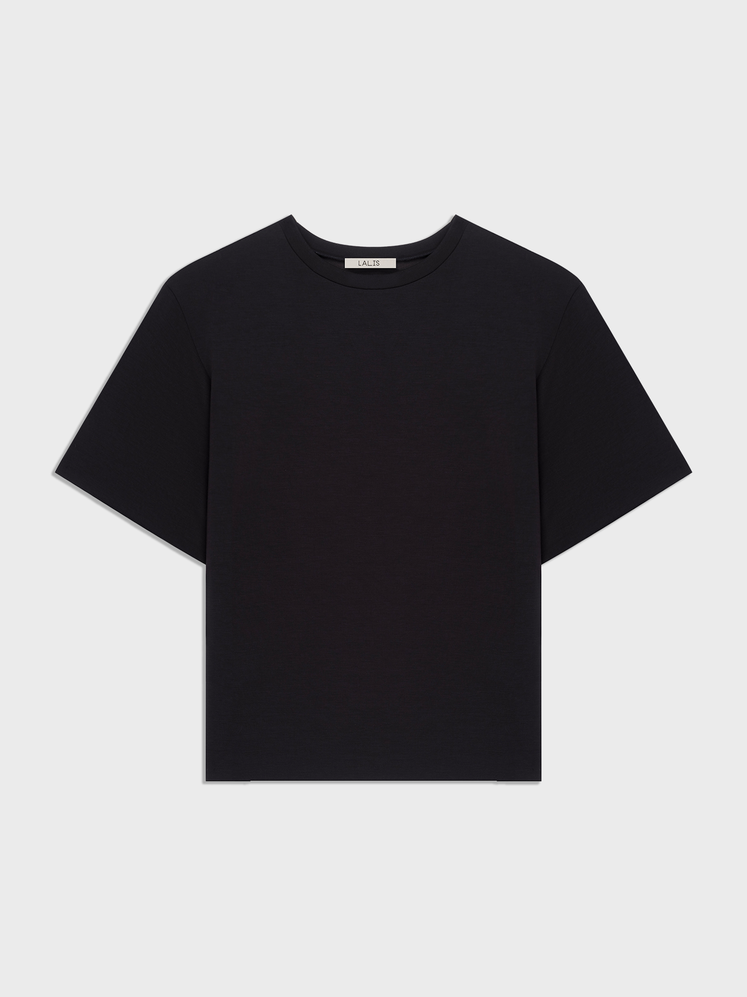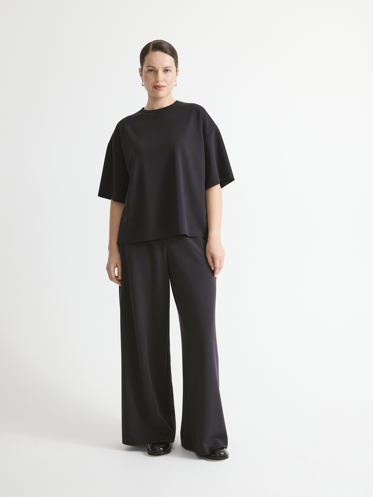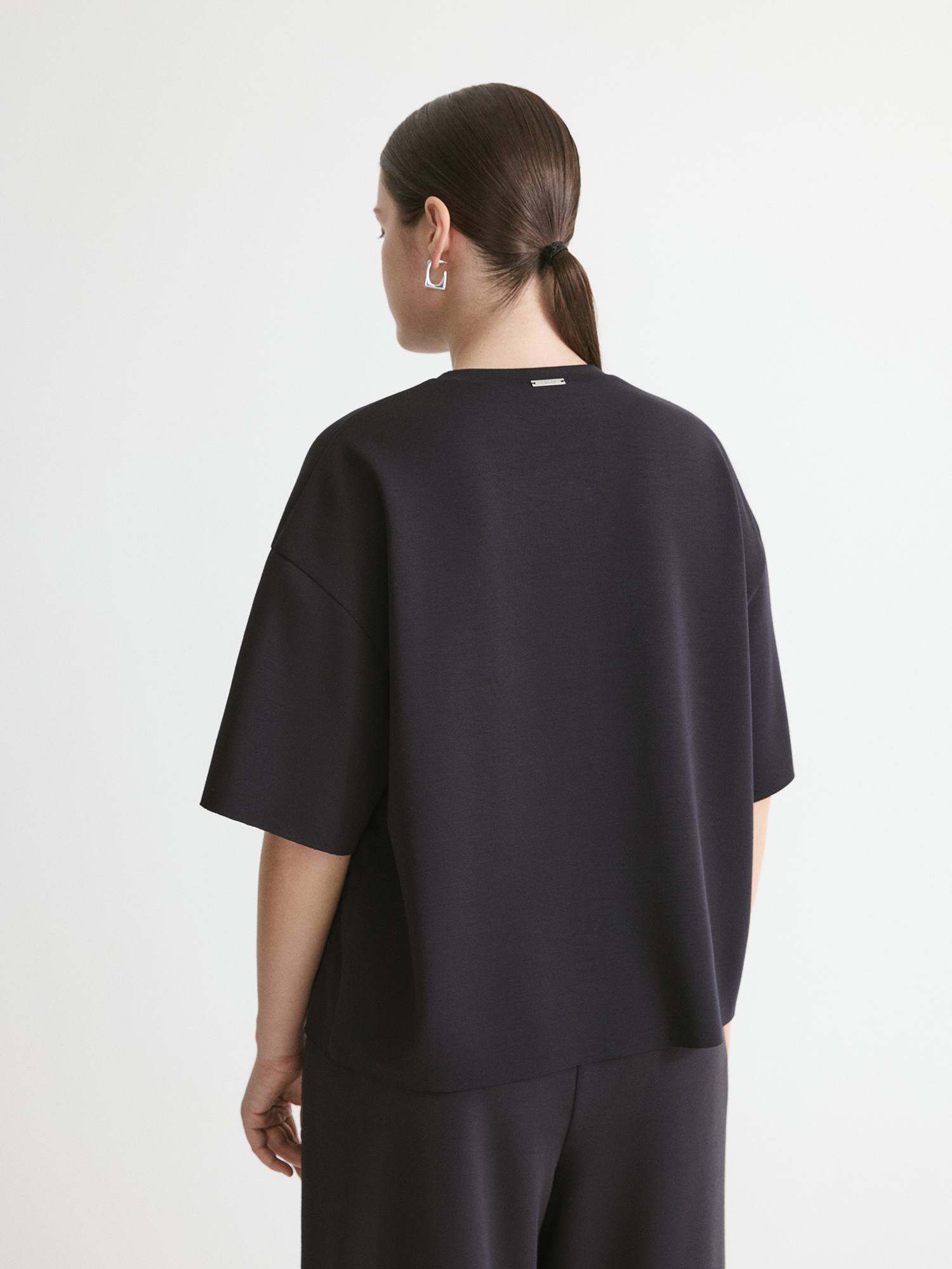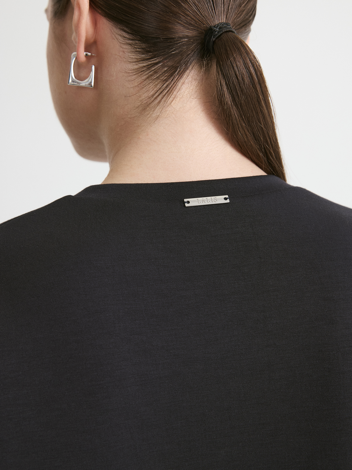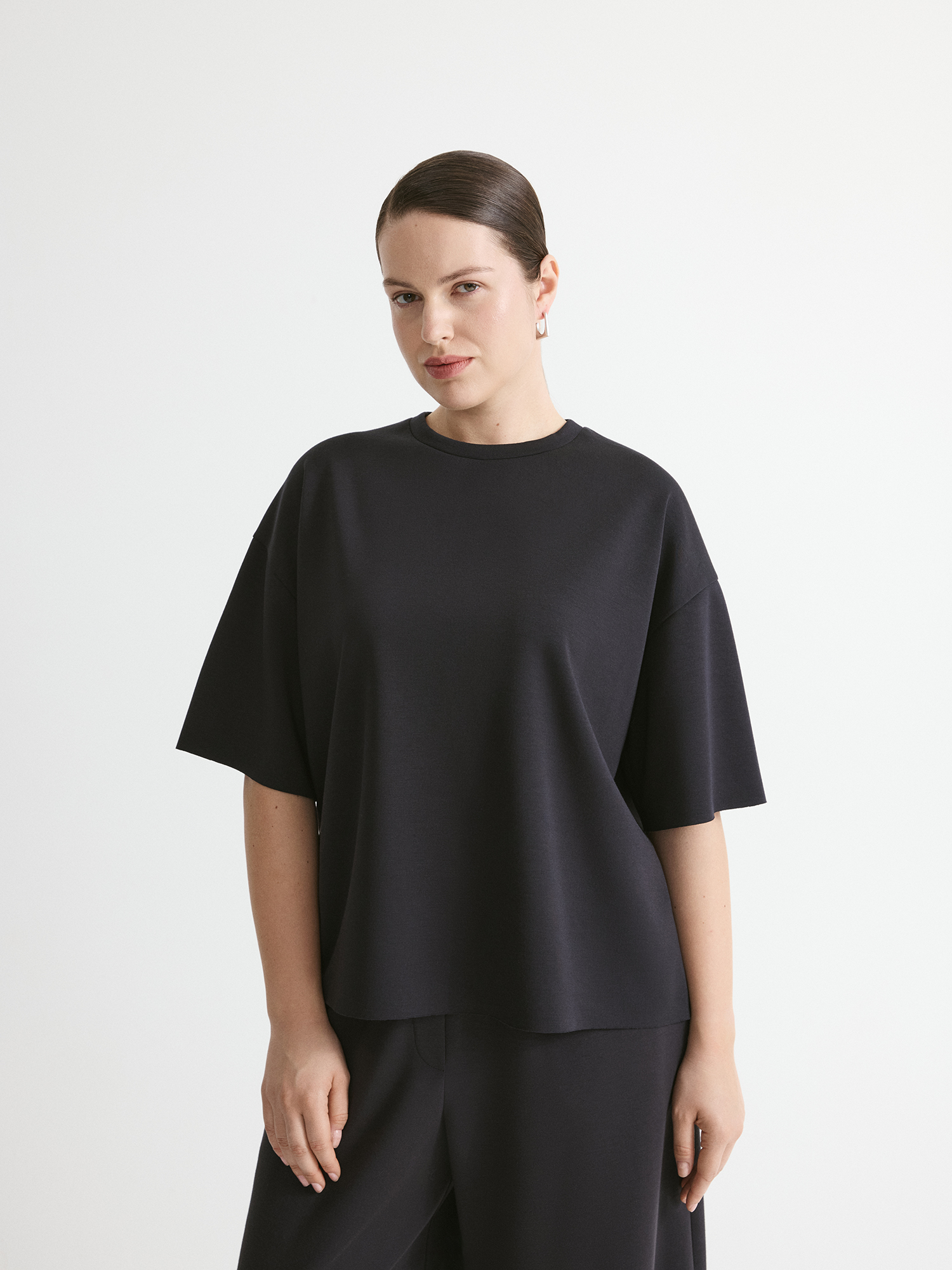 Блуза свободного кроя в базовом черном - незаменима для повседневной носки. Короткие рукава со спущенным плечом и круглый вырез создают актуальный силуэт, идеально ровные срезы с эффектом "необработанного края" делают модель легкой.