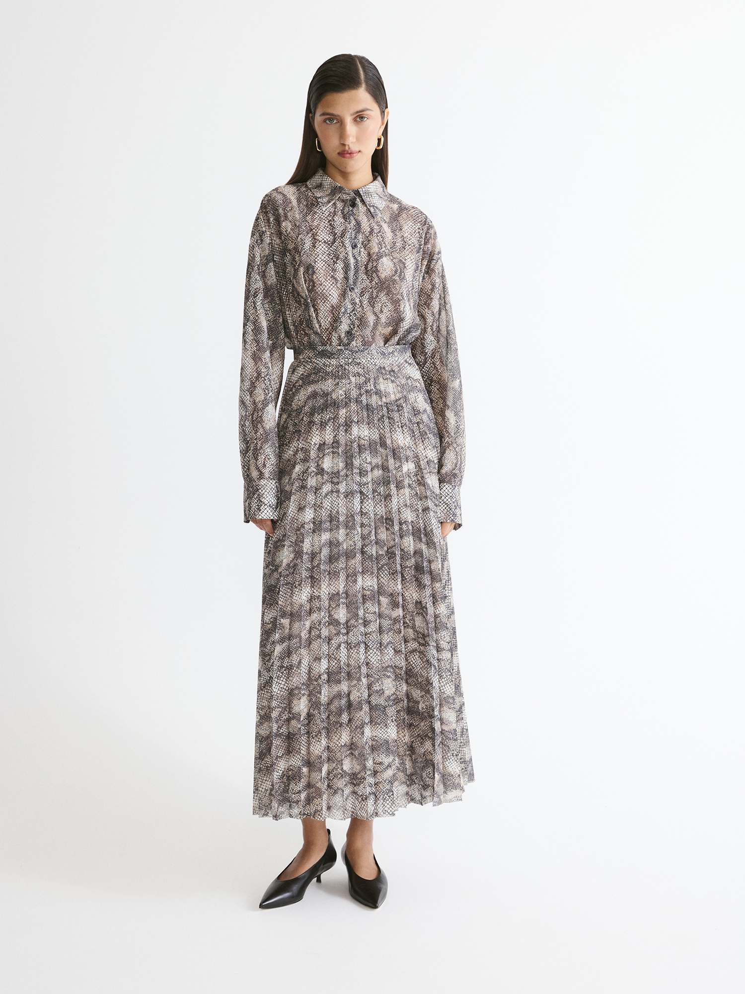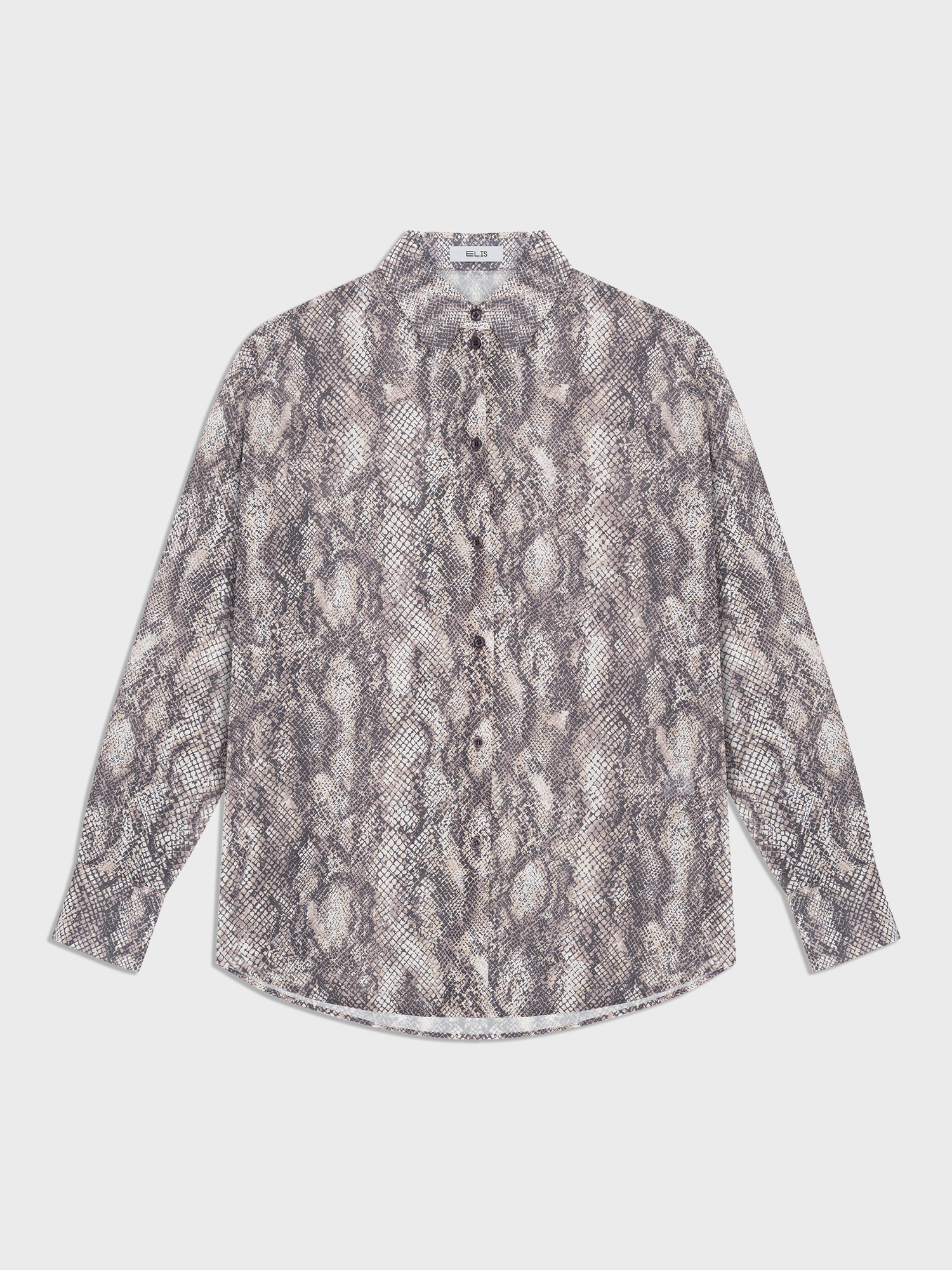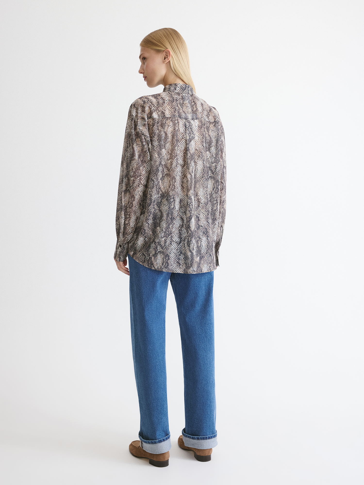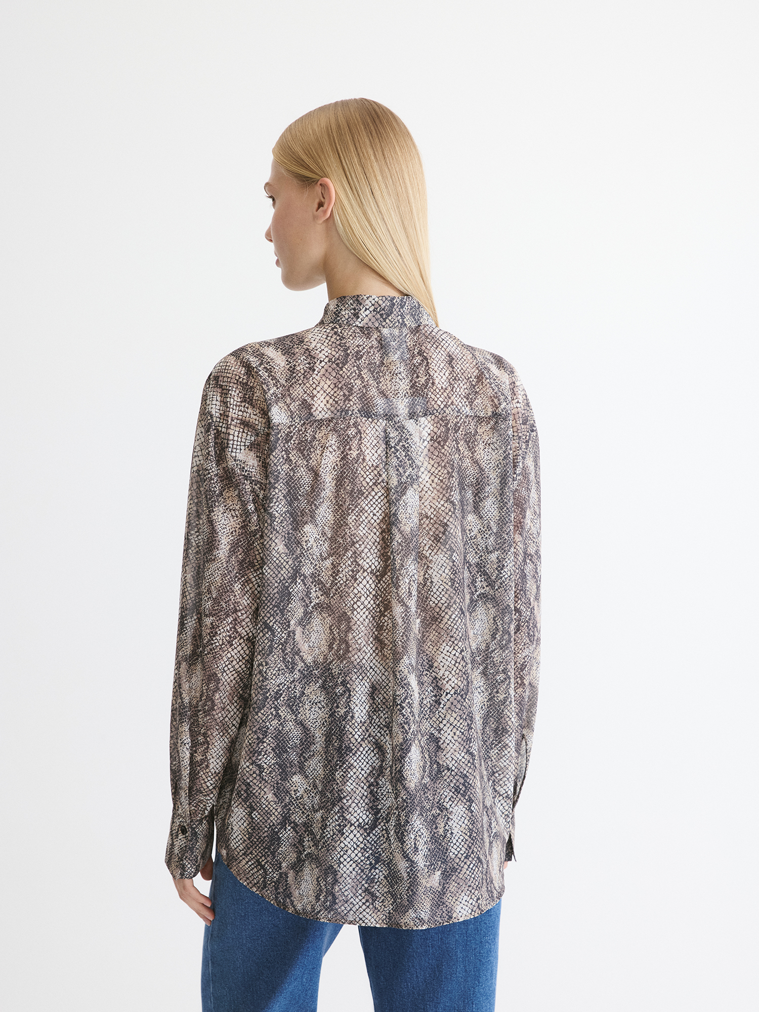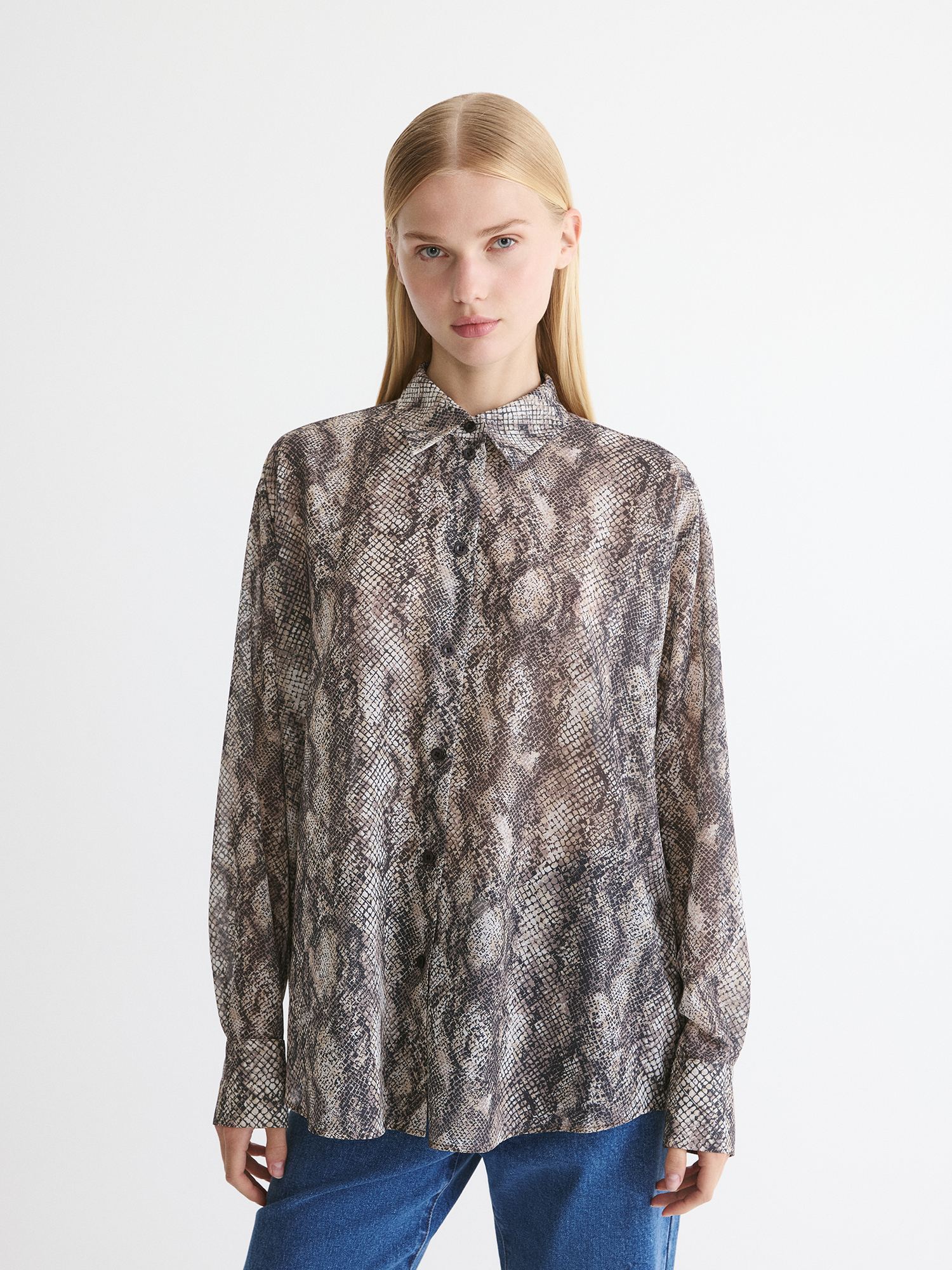 Блуза с серо-коричневым анималистичным узором "рептилия" - утонченная вещь с характером. Классический рубашечный крой с отложным воротником и центральной застежкой на пуговицы выглядит строго, а деликатный блеск ткани добавляет образу изысканности.