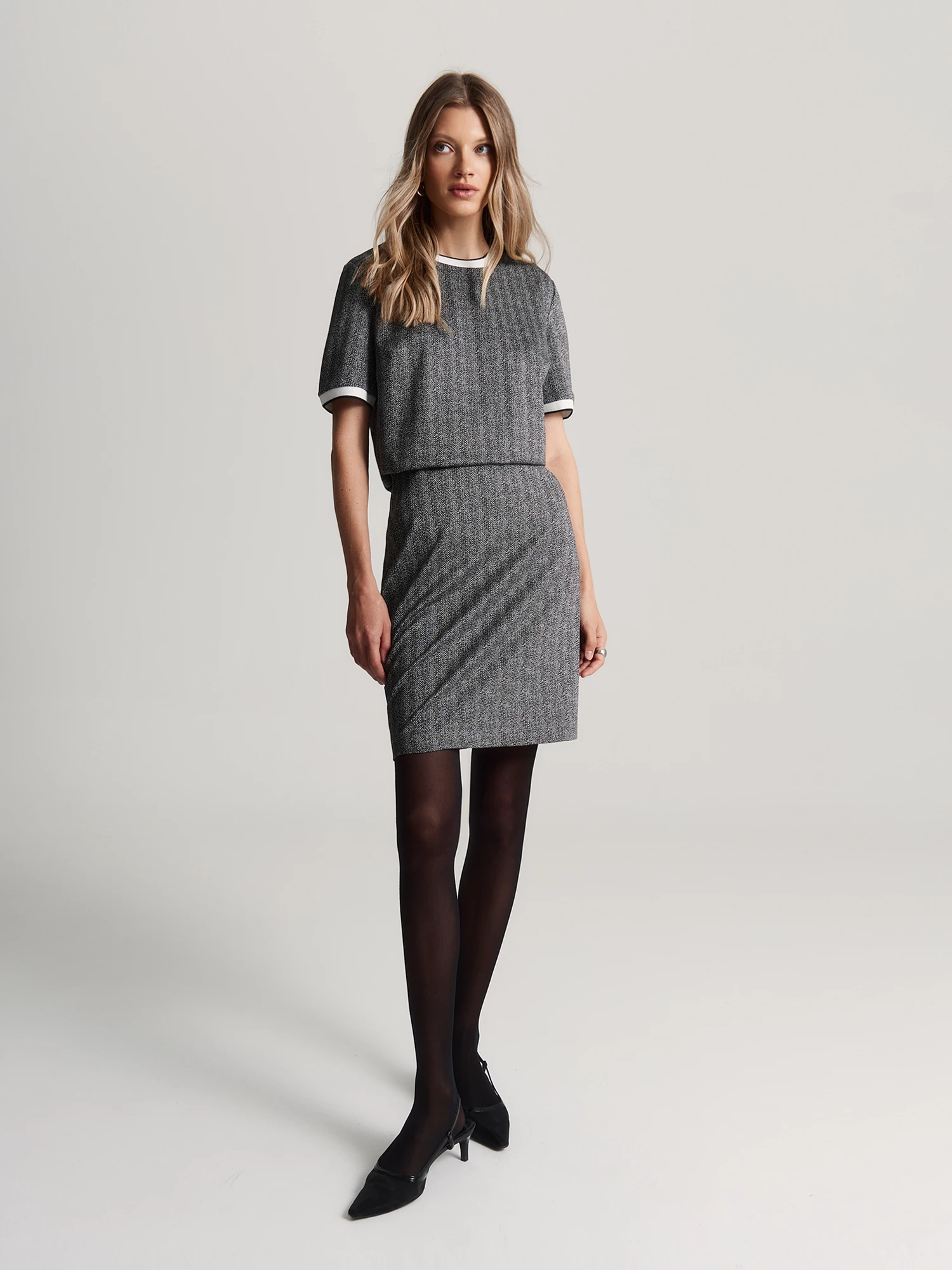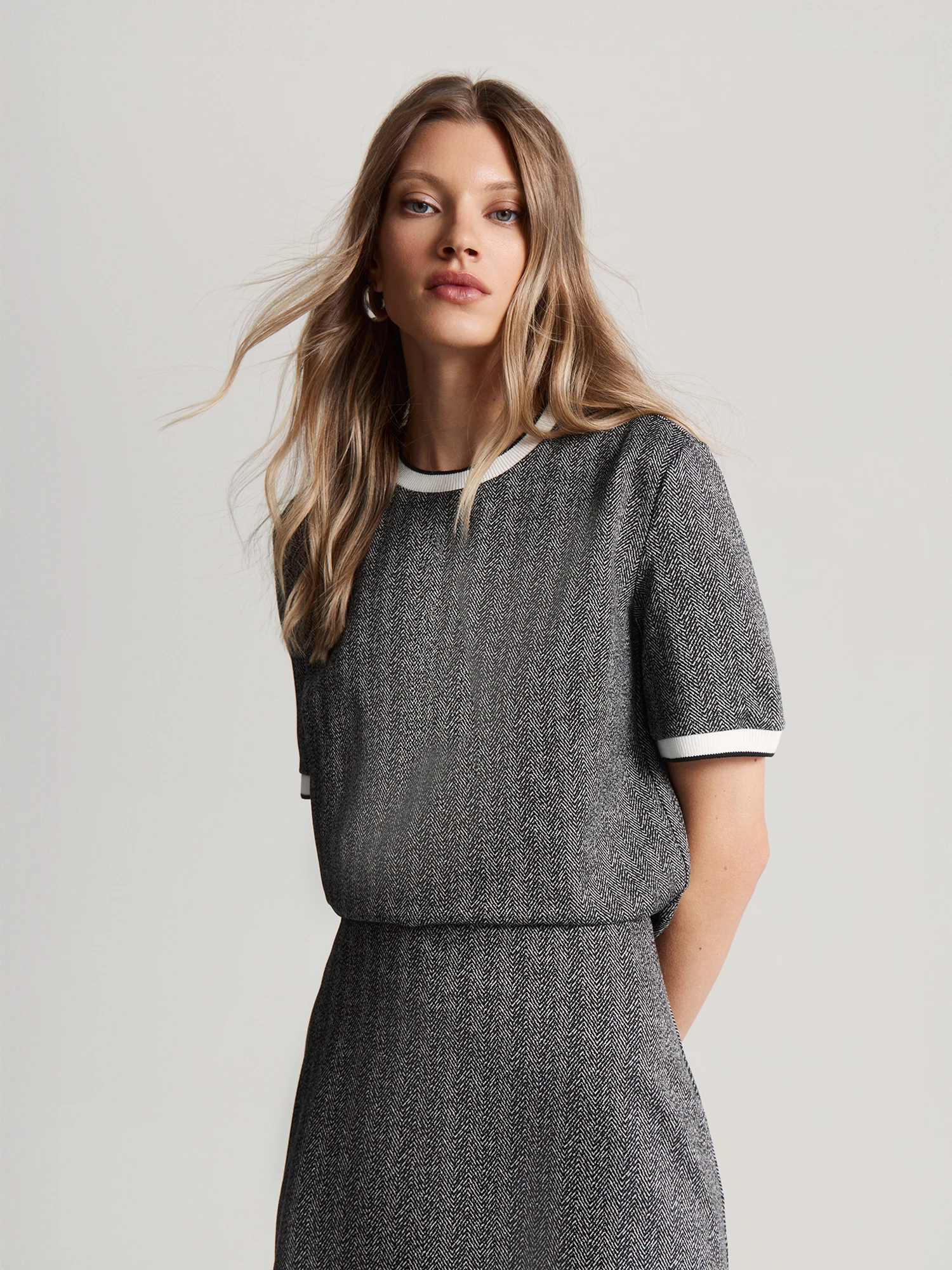 Укороченный крой с круглым вырезом и коротким рукавом создаёт современный силуэт, а нагрудные вытачки обеспечивают идеальную посадку по фигуре.