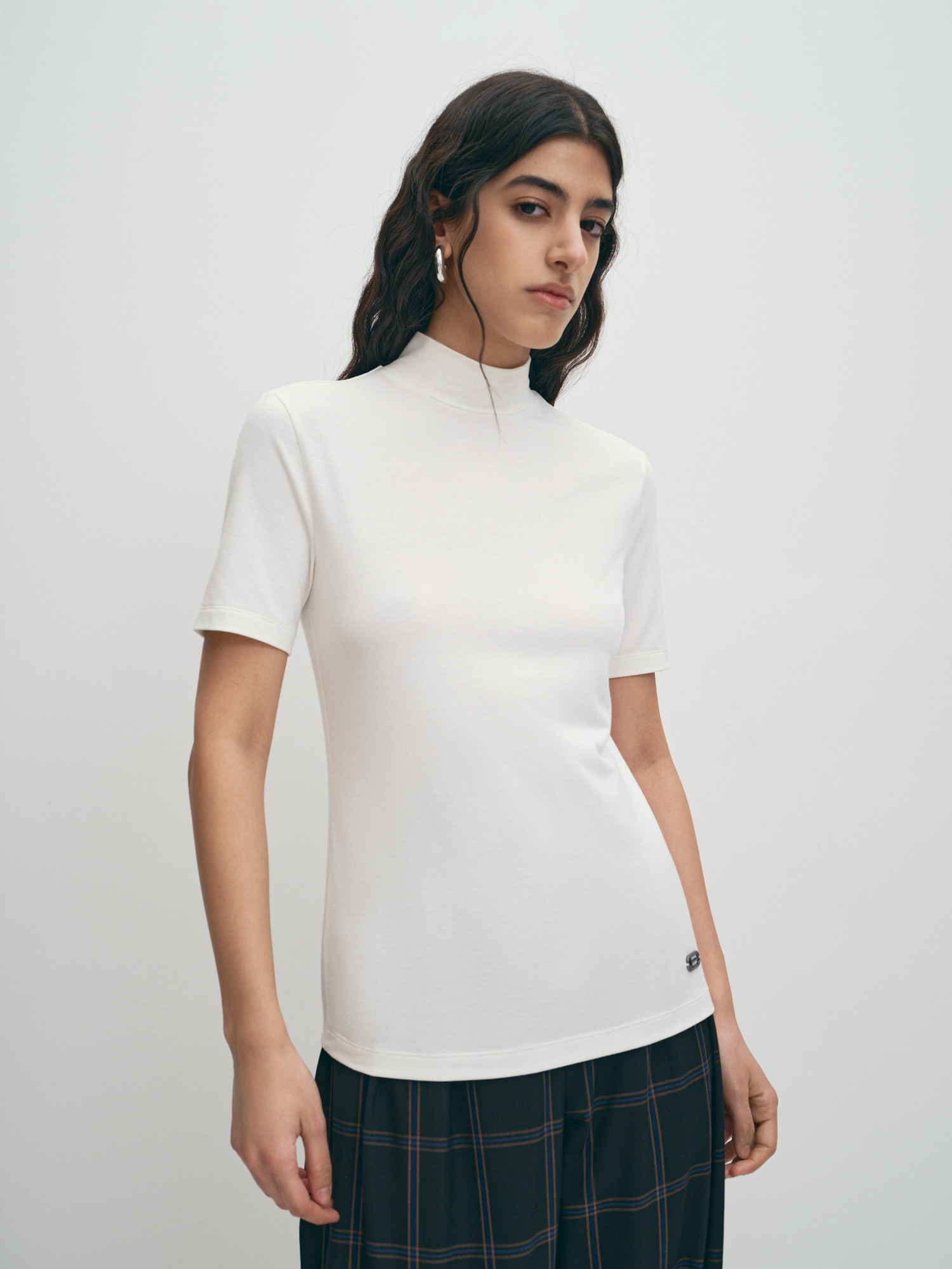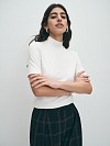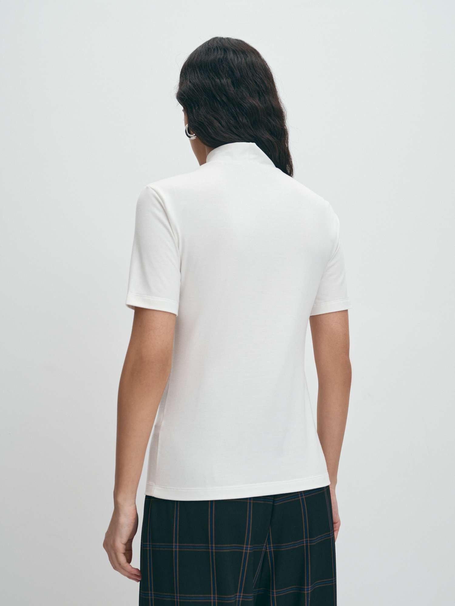 Тонкая, гладкая, с коротким горлом, классическая трикотажная вололазка. Модель длиной до середины бедра, с отрезным воротником-стойкой, втачным рукавом, и брендированной металлической нашивкой. Вискозный трикотаж тактильно приятный и и обладает хорошей воздухопроницаемостью. Базовый молочный подойдет для школы, офиса, прогулки.