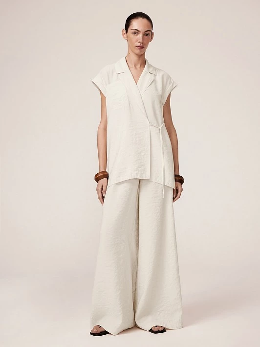 Струящаяся блуза из ткани производства Турции с эффектом крэш — это воплощение современной эргономичности и деловой эстетики. Благородный молочный оттенок становится универсальной основой для любых сочетаний как внутри капсульной коллекции, так и за ее пределами. Классический английский воротник дисциплинирует и подходит как для классического, так и для smart casual образа. Практичные отвороты на рукавах позволяют регулировать степень формальности, а накладной карман на груди вносит ноту асимметрии и функционального шика. Особенность кроя — выверенный запах и высокие боковые разрезы, который обеспечивают не только удобную посадку, но и создают эффект динамичного движения. Сшитая из турецкой ткани с эффектом легкого крэша, блуза сочетает экологичный модал с практичным полиэстером: это невероятная нежность, которая сохраняет безупречный вид весь день. Дышащая легкая модифицированная вискоза прекрасно дополняется прочным поливолокном, что улучшает как визуальные, так и практические характеристики полотна. Блуза, где каждая деталь выражает комфорт и уверенность.