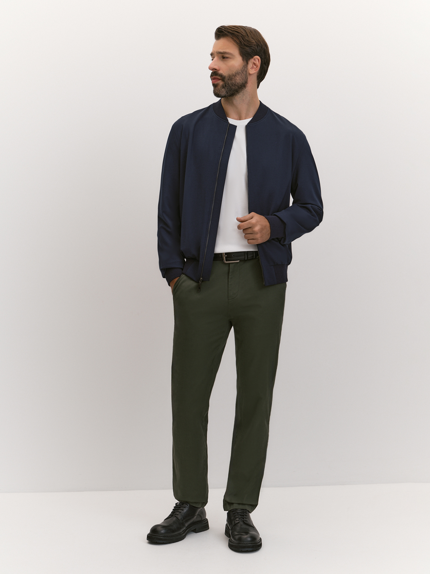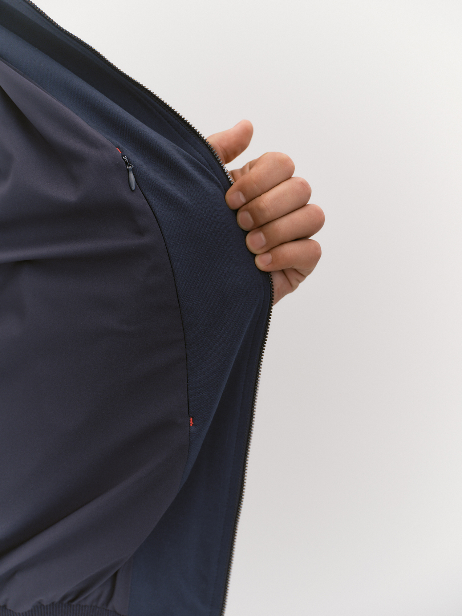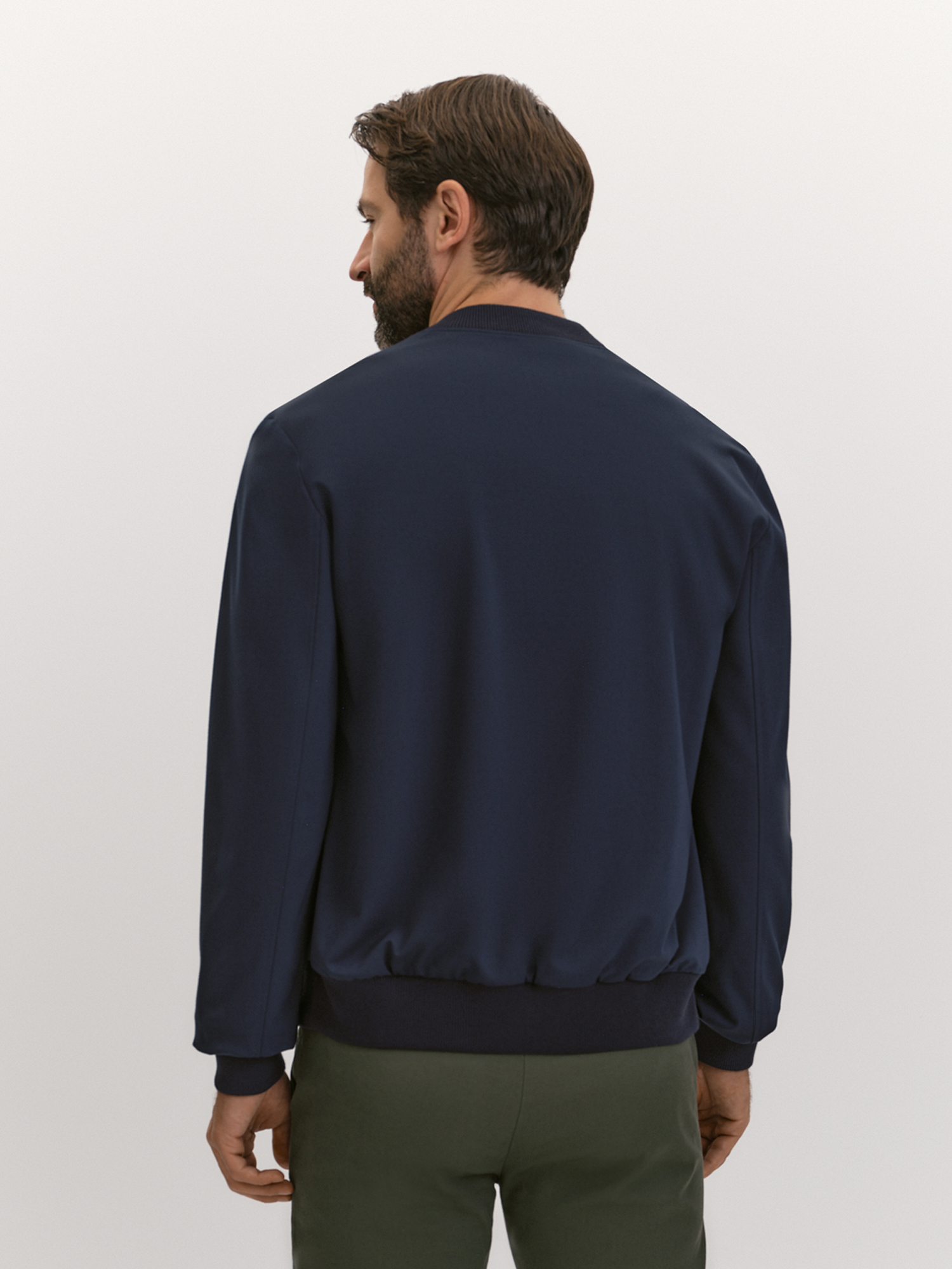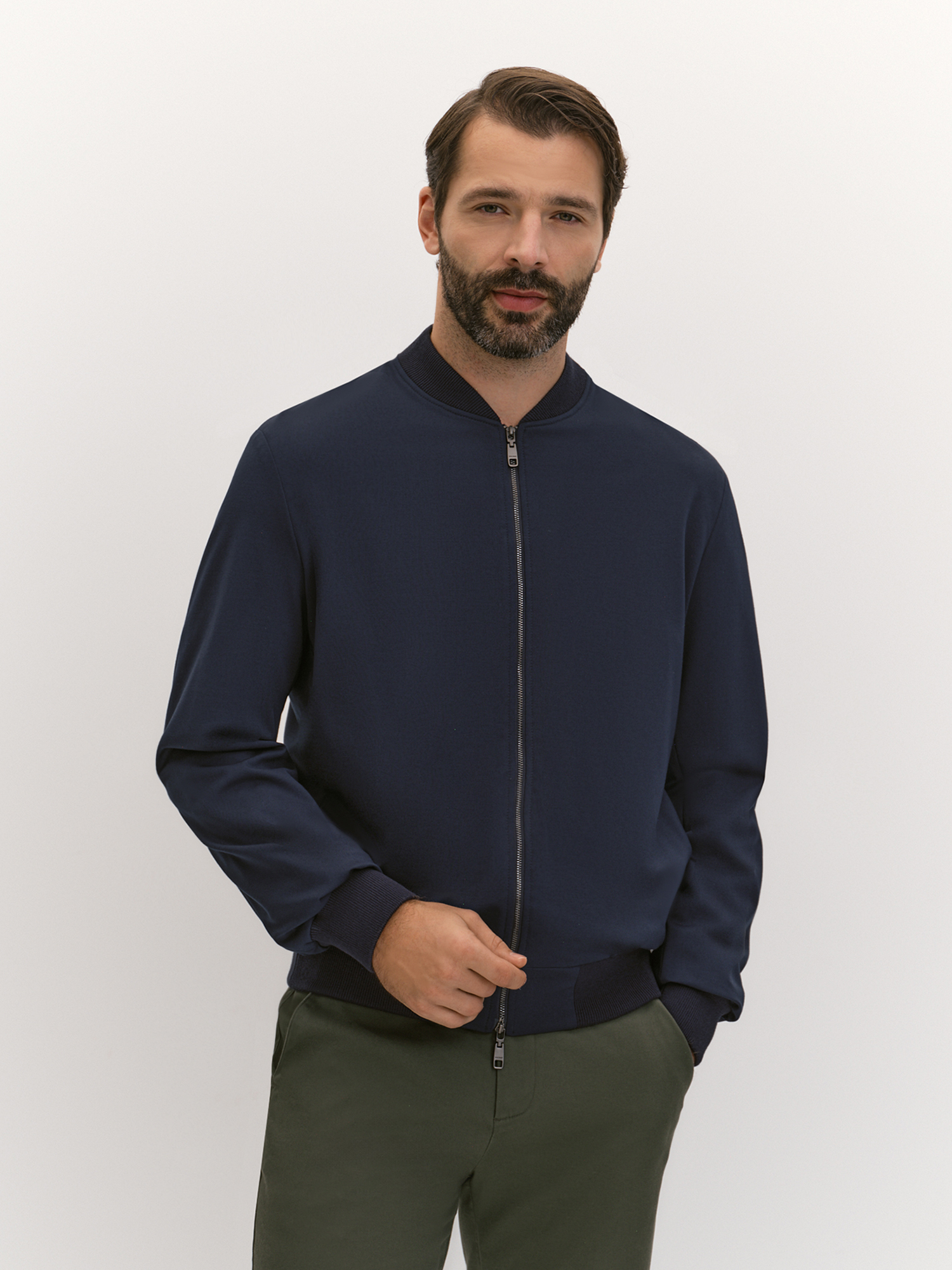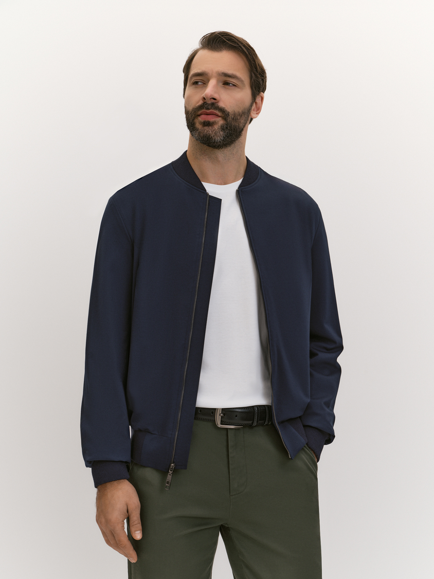 Бомбер в стиле кэжуал с элементами спорта— это сочетание комфорта, стиля и функциональности. Спортивный крой и функциональные детали, такие как внутренний прорезной карман и прорезные карманы на потайных кнопках, делают его удобным и актуальным одновременно. Бомбер выполнен из трикотажного полотна на основе вискозы, нейлона и спандекса. Вискоза мягкая и комфортная, нейлон прочный и легкий, а спандекс эластичный и формоустойчивый, что делает куртку удобной для активного образа жизни. Полная высокотехнологичная подкладка усиливает долговечность изделия, сохраняя его форму даже при интенсивной носке. Темно-синий цвет бомбера универсален и подходит для создания как повседневного, так и стильного образа. Он сочетается с большинством оттенков и визуально стройнит, делая куртку практичным выбором для базового гардероба. Крой бомбера подчеркивает его современный дизайн: подвязы, выполненные из мягкой пряжи на основе вискозы на японской плосковязальной машине Shima Seiki, обеспечивают плотное прилегание и защиту от ветра, добавляя стильный акцент. Двухшовный рукав улучшает посадку и гарантирует комфорт в движении, а манжеты из мягкой эластичной резинки приятно прилегают к телу. Центральная застежка на двухзамковую молнию с брендированными пуллерами и ветрозащитным клапаном обеспечивает надежность и защиту от непогоды. Металлический блеск молнии эффектно контрастирует с матовым эффектом основной ткани, добавляя образу современности. Наличие брендированных деталей подчеркивает статусность вещи и её принадлежность к категории премиум. Бомбер станет отличной альтернативой пиджаку, подходит для однодневных командировок, поездок или повседневных образов. Бомбер можно легко сложить в чемодан, не беспокоясь о замятии, ведь под легким воздействием пара ткань быстро возвращается в идеальное состояние. Бомбер из джерси — это практичность, стиль и удобство в одном изделии.