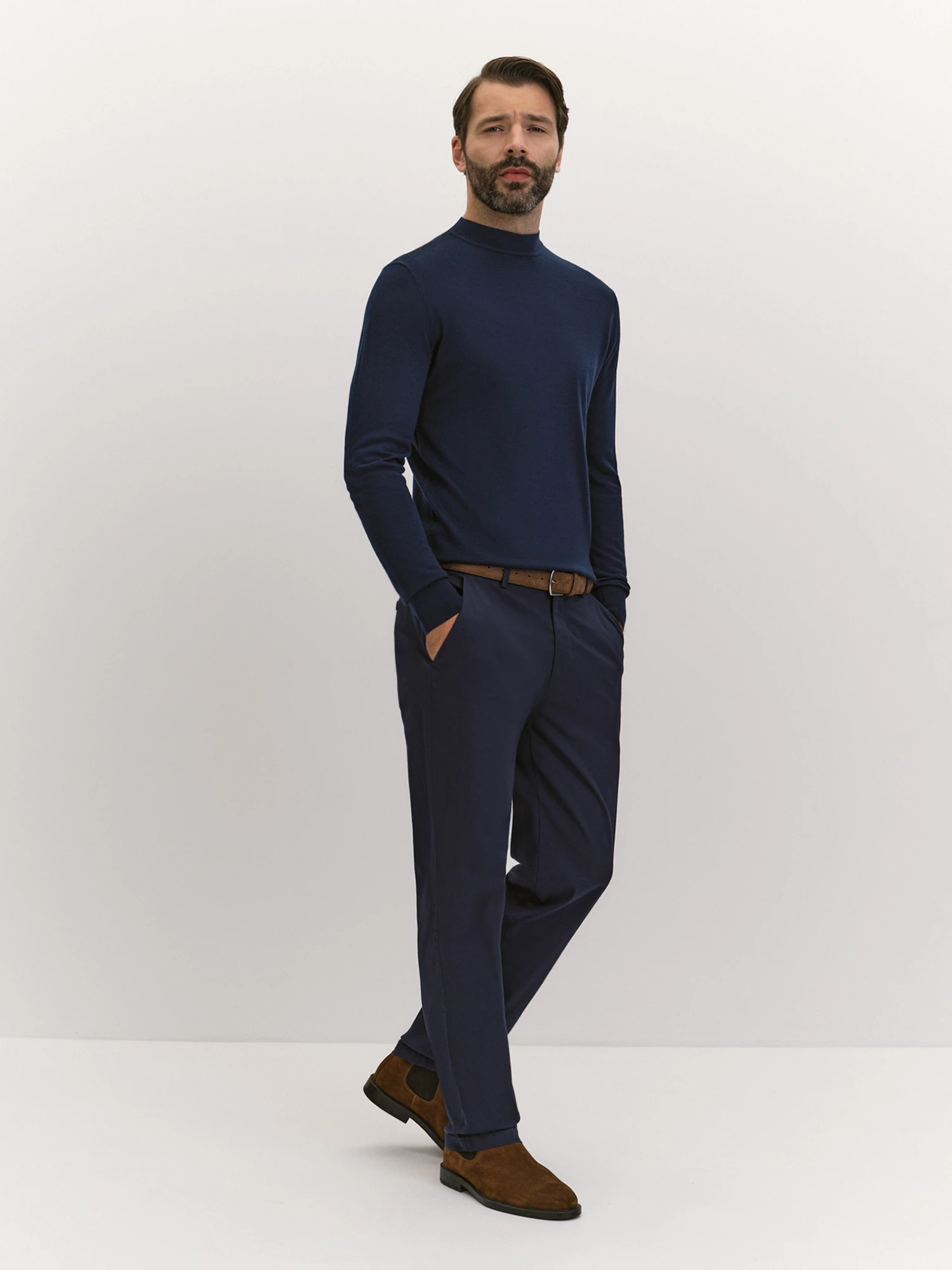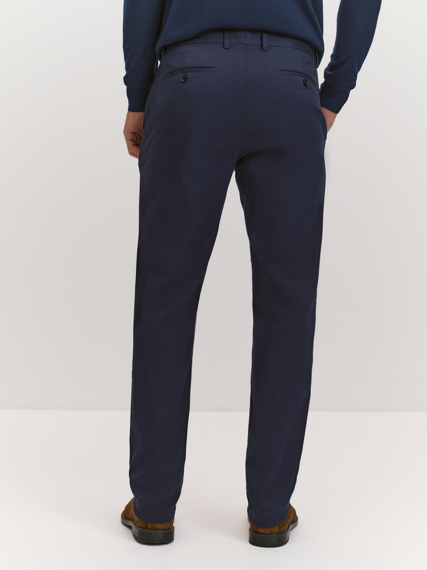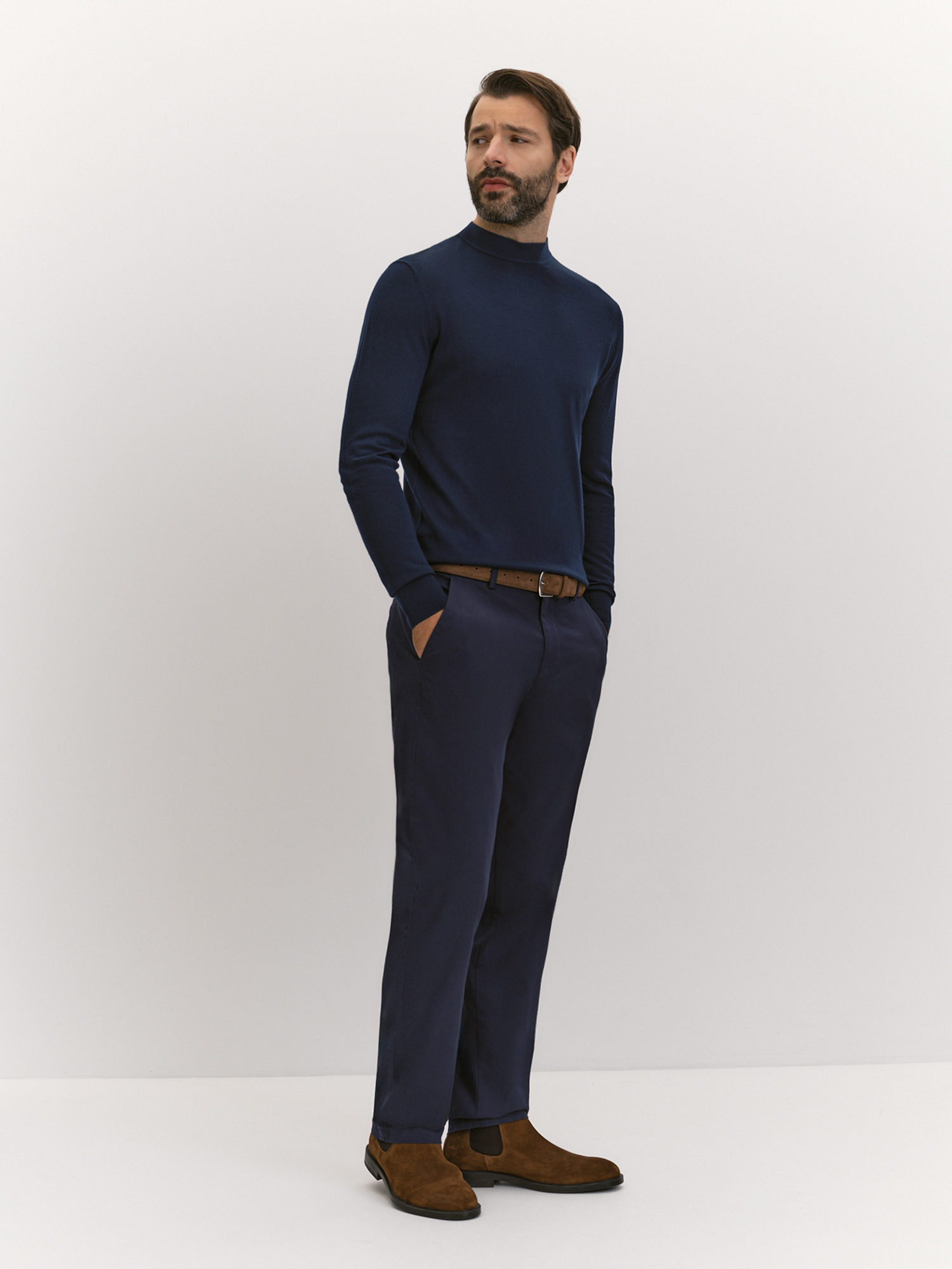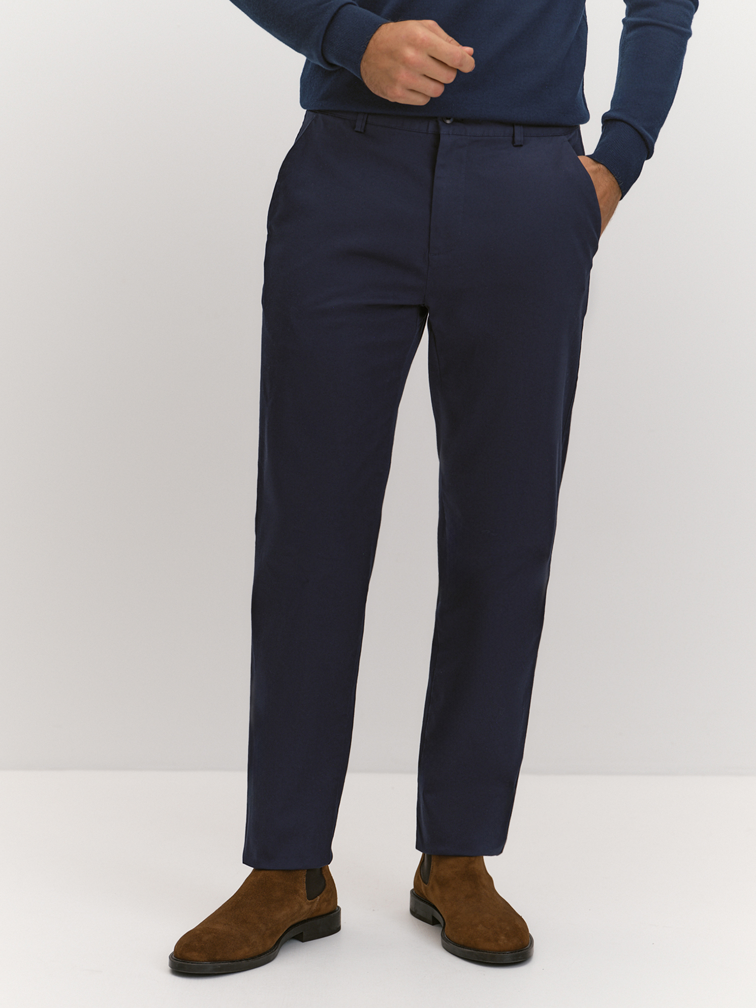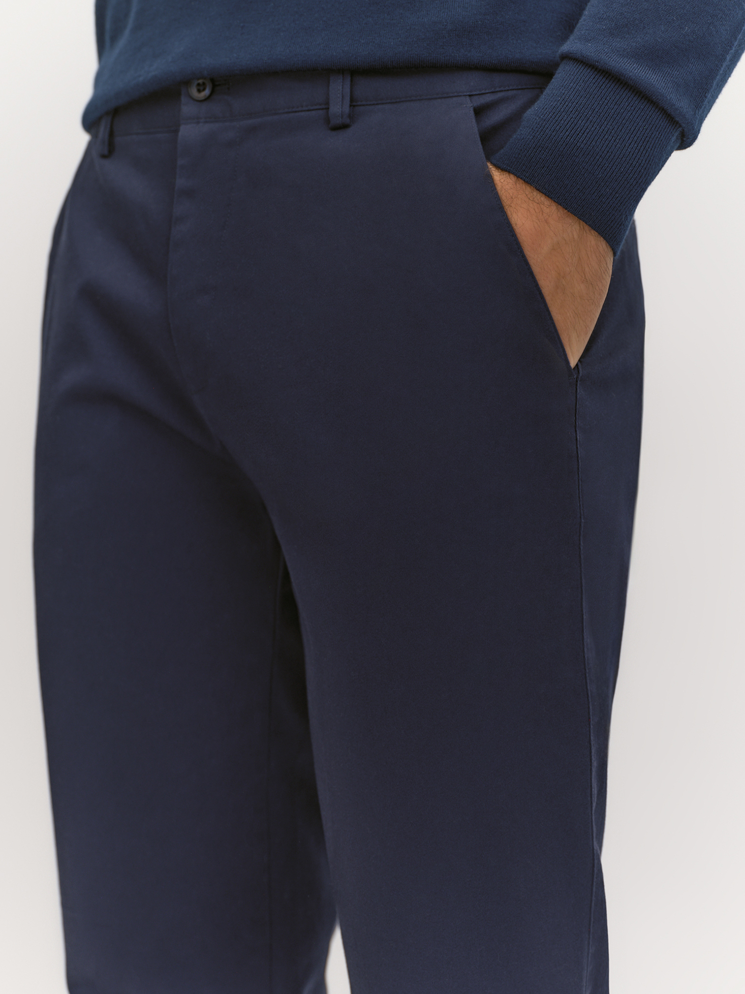 Чиносы подходят для повседневной носки и неформальных мероприятий, демонстрируя практичность и стиль. Регулярный силуэт обеспечивает комфорт и универсальность, делая модель идеальным выбором для различных ситуаций, будь то прогулка по городу, встреча с друзьями или неформальная деловая встреча. Брюки-чинос выполнены из ткани на основе хлопка с добавлением эластана. Хлопок обеспечивает натуральность, воздухопроницаемость и комфорт, делая брюки приятными для ношения в течение всего дня. Эластан придает ткани растяжимость и формоустойчивость, улучшая посадку и обеспечивая свободу движений. Синий цвет добавляет строгости и элегантности, а также стройнит. Крой чиносов подчеркивает их практичность и стиль: притачной пояс со шлевками обеспечивает идеальную посадку и фиксацию на талии, а застежка-гульфик на молнию и пуговицу добавляет удобство и надежность. Карманы в шве с отстегивающейся стороной и задние прорезные карманы в рамке с фиксацией на пуговицу сочетают функциональность и элегантность, делая чиносы не только удобными, но и актуальными. Брюки-чинос станут незаменимым элементом гардероба, подходящим для различных ситуаций и образов.