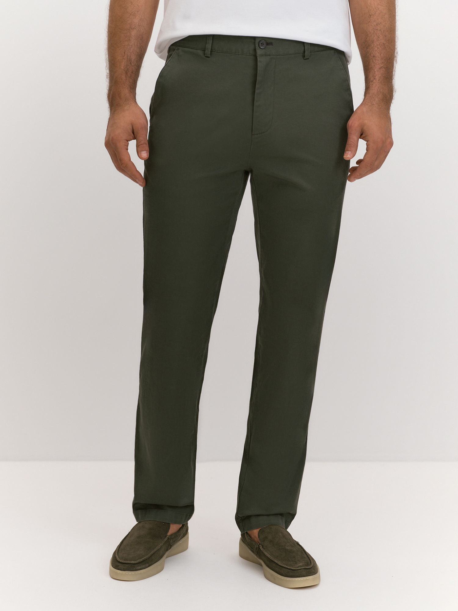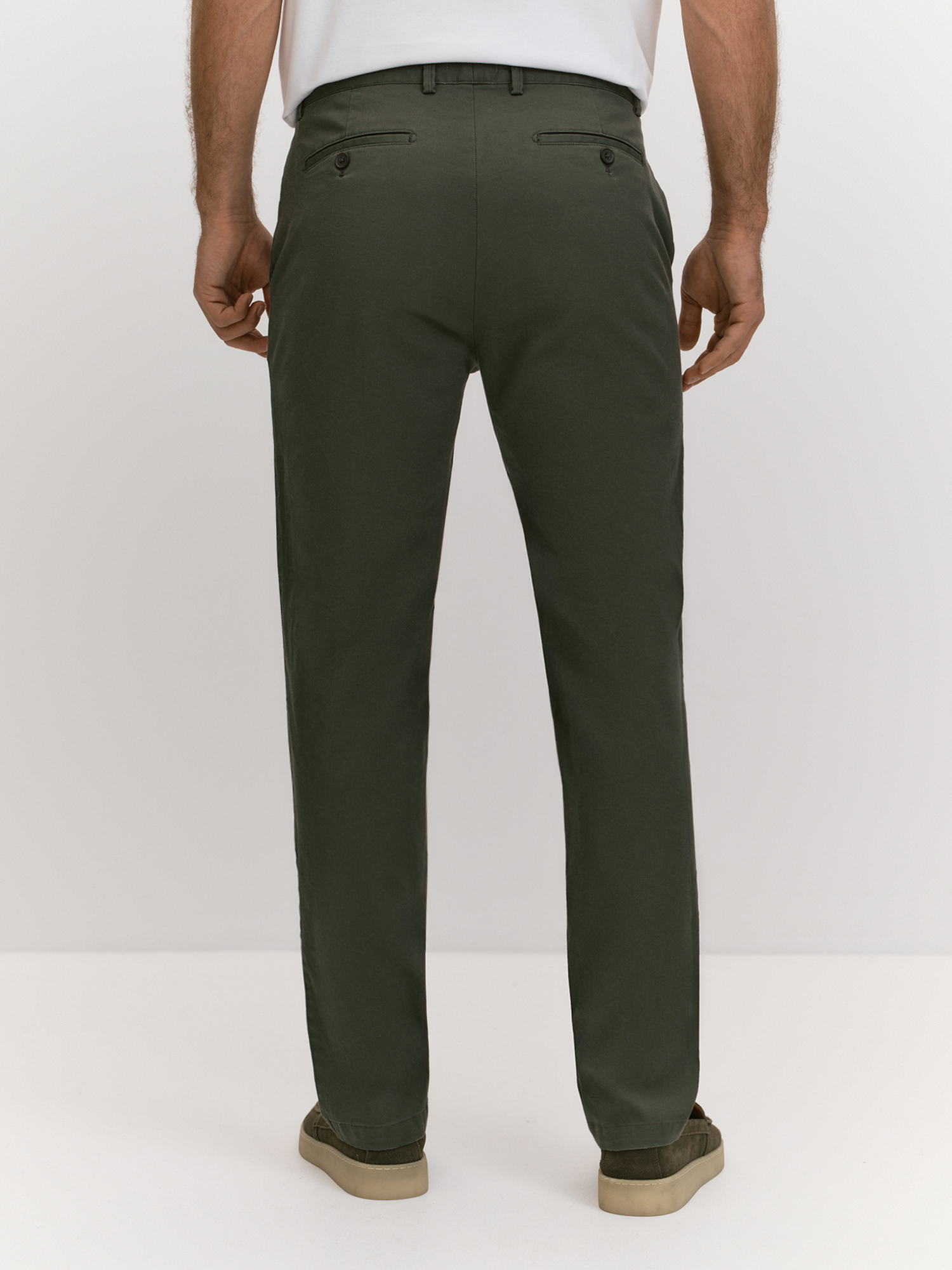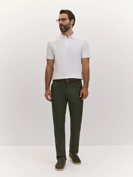 Чиносы подходят для повседневной носки и неформальных мероприятий, демонстрируя практичность и стиль. Регулярный силуэт обеспечивает комфорт и универсальность, делая модель идеальным выбором для различных ситуаций, будь то прогулка по городу, встреча с друзьями или неформальная деловая встреча. Брюки-чинос выполнены из ткани на основе хлопка с добавлением эластана. Хлопок обеспечивает натуральность, воздухопроницаемость и комфорт, делая брюки приятными для ношения в течение всего дня. Эластан придает ткани растяжимость и формоустойчивость, улучшая посадку и обеспечивая свободу движений. Цвет хаки - универсальный и гибкий оттенок, привносит ноту стиля милитари. Крой чиносов подчеркивает их практичность и стиль: притачной пояс со шлевками обеспечивает идеальную посадку и фиксацию на талии, а застежка-гульфик на молнию и пуговицу добавляет удобство и надежность. Карманы в шве с отстегивающейся стороной и задние прорезные карманы в рамке с фиксацией на пуговицу сочетают функциональность и элегантность, делая чиносы не только удобными, но и актуальными. Брюки-чинос станут незаменимым элементом гардероба, подходящим для различных ситуаций и образов.