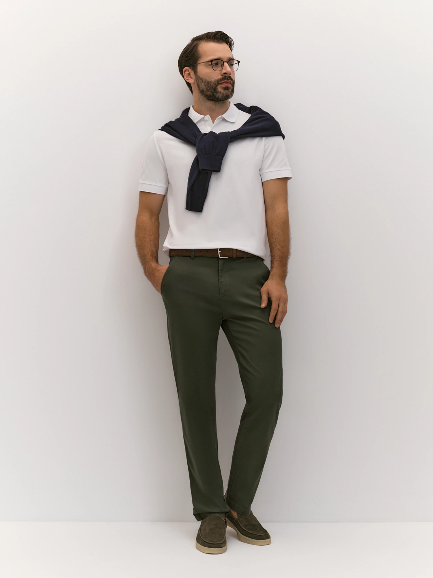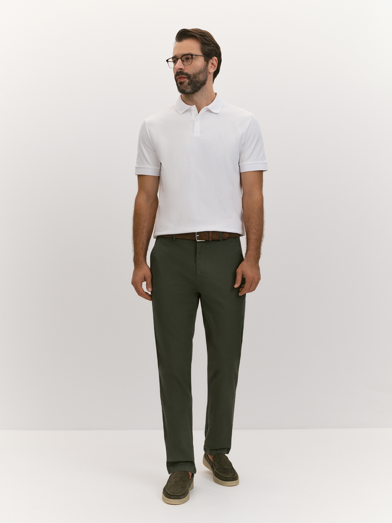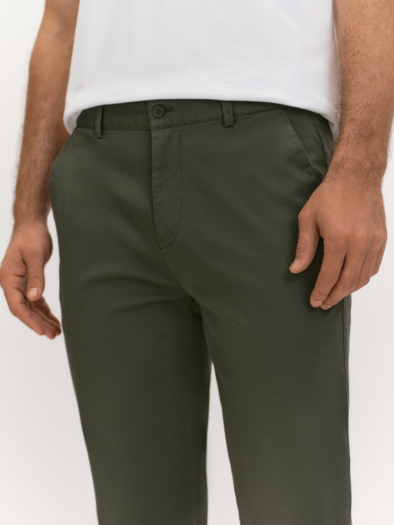 Чиносы подходят для повседневной носки и неформальных мероприятий, демонстрируя практичность и стиль. Регулярный силуэт обеспечивает комфорт и универсальность, делая модель идеальным выбором для различных ситуаций, будь то прогулка по городу, встреча с друзьями или неформальная деловая встреча. Брюки-чинос выполнены из ткани на основе хлопка с добавлением эластана. Хлопок обеспечивает натуральность, воздухопроницаемость и комфорт, делая брюки приятными для ношения в течение всего дня. Эластан придает ткани растяжимость и формоустойчивость, улучшая посадку и обеспечивая свободу движений. Цвет хаки - универсальный и гибкий оттенок, привносит ноту стиля милитари. Крой чиносов подчеркивает их практичность и стиль: притачной пояс со шлевками обеспечивает идеальную посадку и фиксацию на талии, а застежка-гульфик на молнию и пуговицу добавляет удобство и надежность. Карманы в шве с отстегивающейся стороной и задние прорезные карманы в рамке с фиксацией на пуговицу сочетают функциональность и элегантность, делая чиносы не только удобными, но и актуальными. Брюки-чинос станут незаменимым элементом гардероба, подходящим для различных ситуаций и образов.