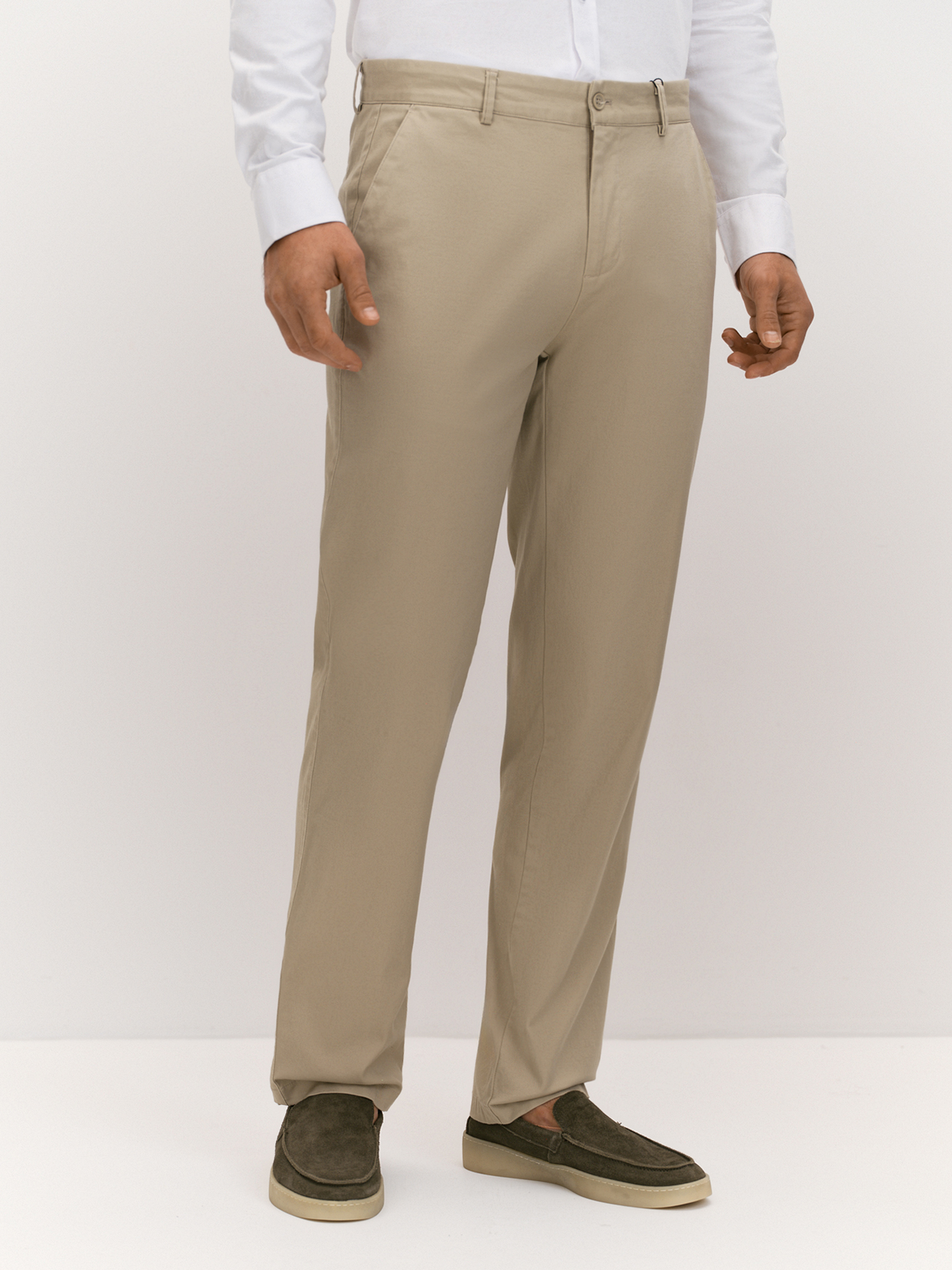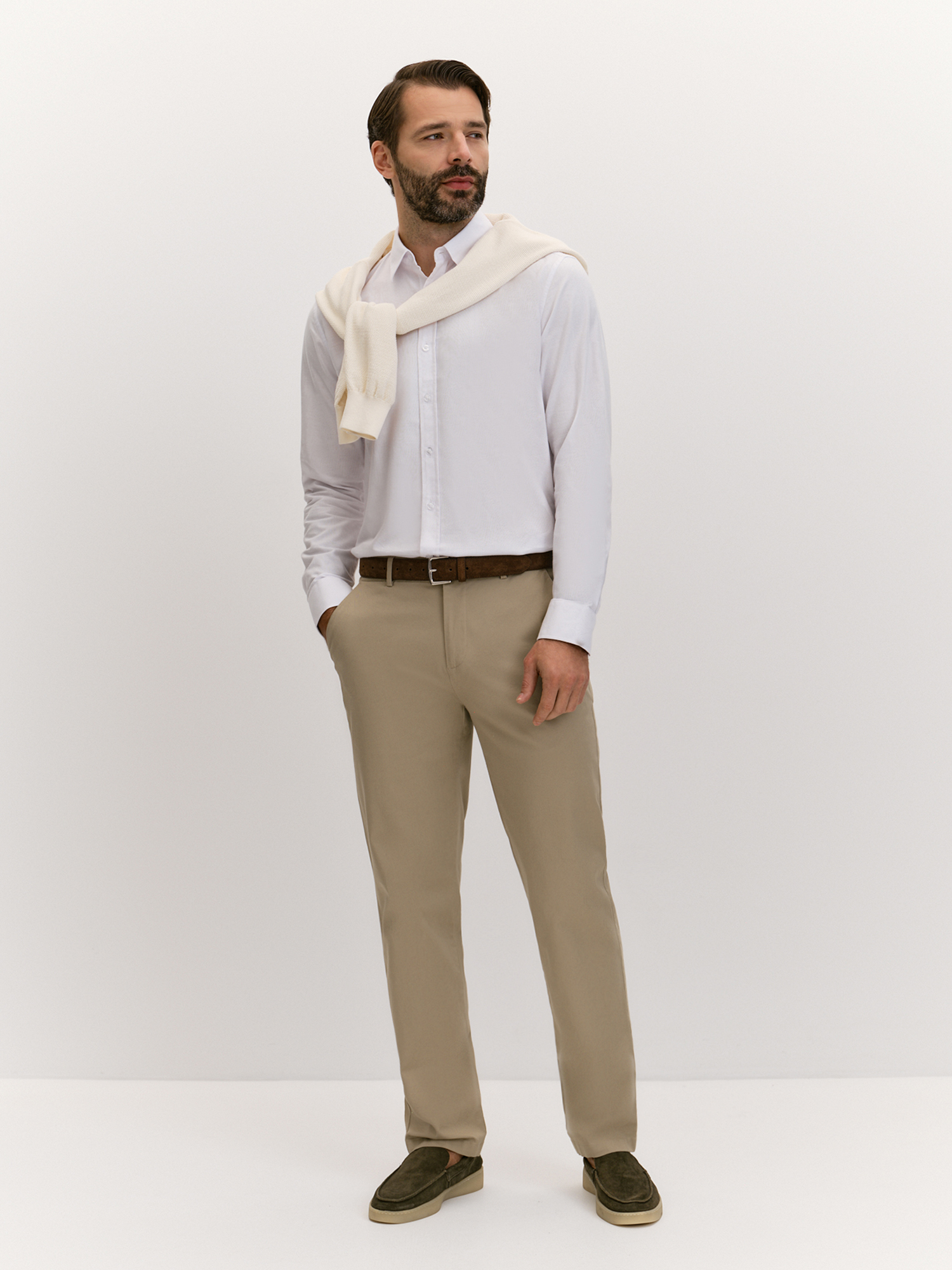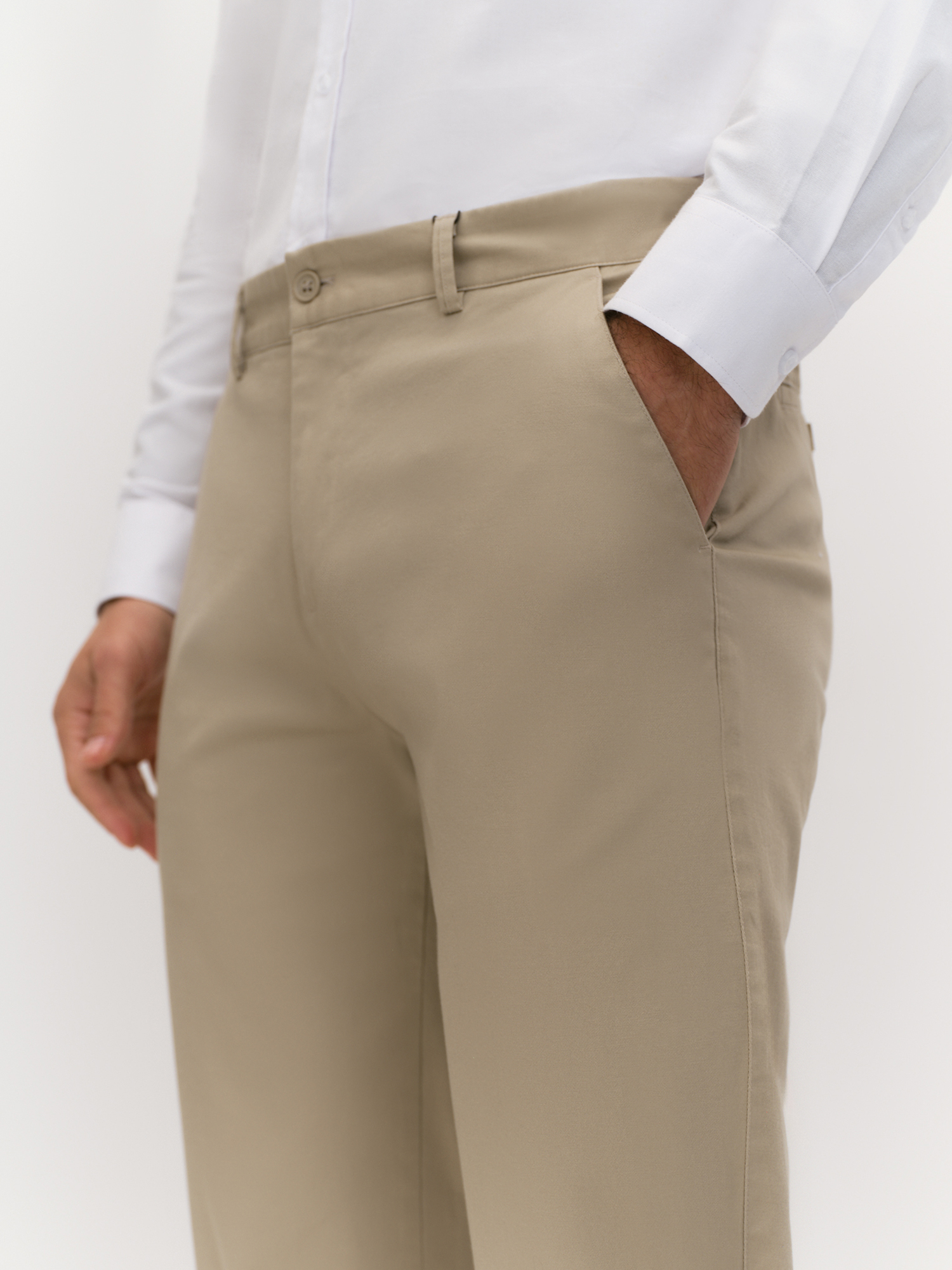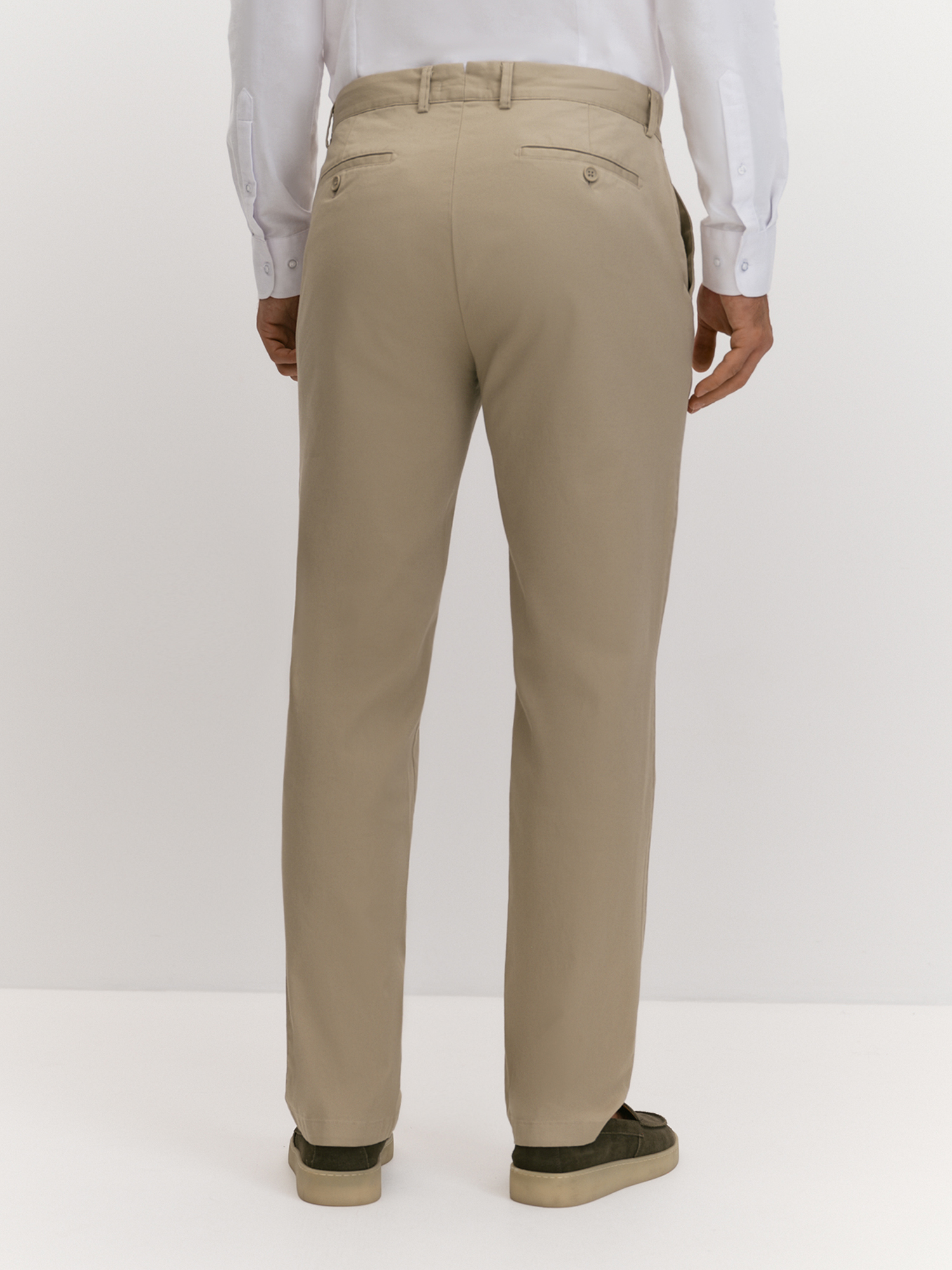 Чиносы подходят для повседневной носки и неформальных мероприятий, демонстрируя практичность и стиль. Регулярный силуэт обеспечивает комфорт и универсальность, делая модель идеальным выбором для различных ситуаций, будь то прогулка по городу, встреча с друзьями или неформальная деловая встреча. Брюки-чинос выполнены из ткани на основе хлопка с добавлением эластана. Хлопок обеспечивает натуральность, воздухопроницаемость и комфорт, делая брюки приятными для ношения в течение всего дня. Эластан придает ткани растяжимость и формоустойчивость, улучшая посадку и обеспечивая свободу движений. Базовый бежевый цвет создает нейтральный и универсальный образ, который легко сочетается с другими элементами гардероба. Крой чиносов подчеркивает их практичность и стиль: притачной пояс со шлевками обеспечивает идеальную посадку и фиксацию на талии, а застежка-гульфик на молнию и пуговицу добавляет удобство и надежность. Карманы в шве с отстегивающейся стороной и задние прорезные карманы в рамке с фиксацией на пуговицу сочетают функциональность и элегантность, делая чиносы не только удобными, но и актуальными. Брюки-чинос станут незаменимым элементом гардероба, подходящим для различных ситуаций и образов.