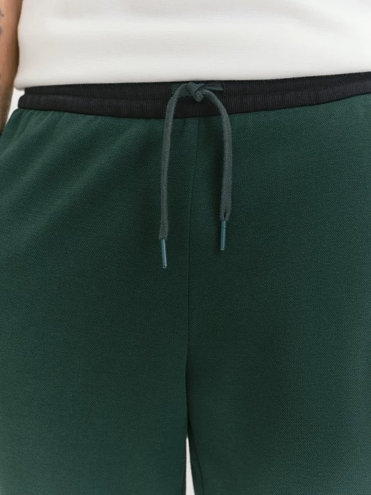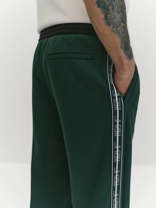Брюки среднего объема с притачным контрастным черным поясом на резинке, шнуре с лаконичными эглетами в тон основной ткани. Акцентные брендированные лампасы по боковым швам вытягивают силуэт, а фиксация по низу брючин на манжеты позволяет сделать модель более актуальной. Комфортный крой и функциональные детали делают брюки идеальным выбором для современных мужчин, стремящихся к сочетанию стиля и практичности в повседневной жизни. Выбрали для брюк трикотаж-пике хорошей плотности в темно-зеленом цвете "платан". Уверенный черный цвет отделки модели делает ее универсальной и легко сочетаемой с другими элементами гардероба. Пике легко узнать – благодаря особому переплетению нитей, на лицевой стороне изделия Вы можете увидеть рисунок, напоминающий соты. У трикотажа пике высокие эксплуатационные характеристики – он прочный, износостойкий, очень хорошо пропускает воздух и впитывает влагу за счет высокого содержания хлопка. Дополнительно брюки оснащены карманами с вертикальным входом и листочкой, которые надежно застегиваются на молнию. Это позволяет удобно хранить необходимые мелочи, такие как ключи или телефон, не беспокоясь о том, что они могут выпасть. Задний карман с листочкой выполнен в поддержку стиля.