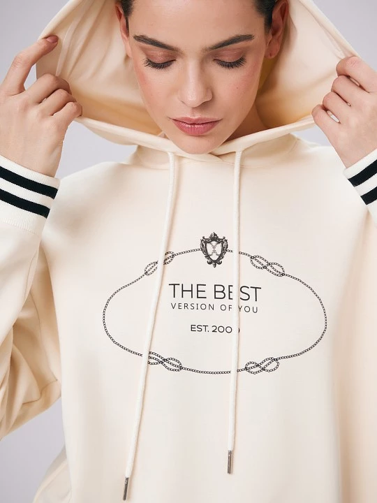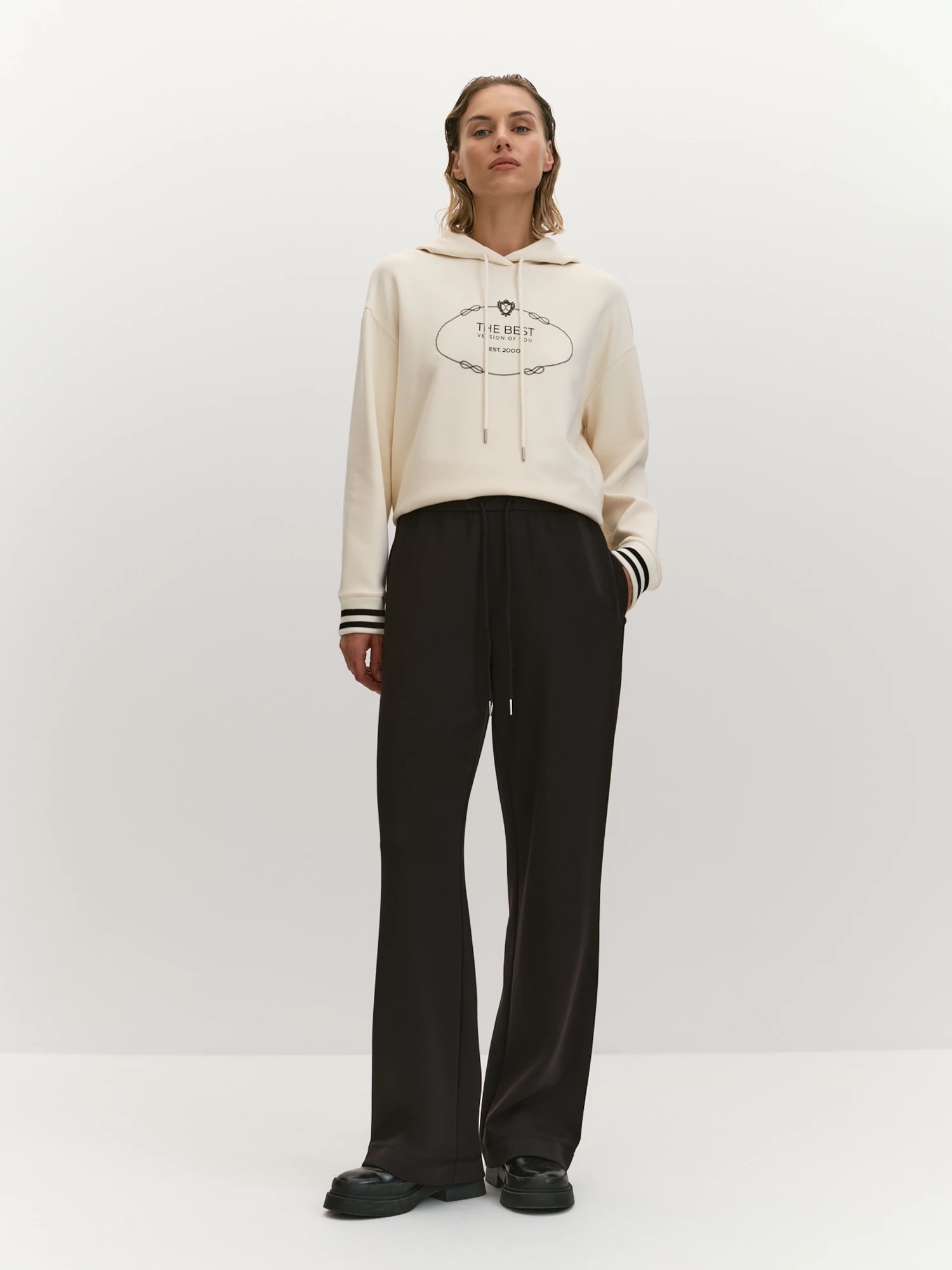 Тонкий неопрен с модифицированной вискозой и хлопком прочный, гибкий и тактильно приятный. Брюки в таком качестве комфортны и эргономичны. Выполнили модель с широким притачным поясом на резинке и шнуре. В поддержку свитшота шнур декорирован лаконичными гибкими эглетами в тон основной ткани изделия. Брючины лаконичные, прямые, боковые карманы в швах функциональны и удобны. Посадку по бедрам визуально улучшают декоративные центральные швы. Бренд Elis выступает за ценность принятия себя, поэтому свитшот BS0038K, комплементарный броюкам, декорирован дизайнерским принтом "лучшая версия тебя", также выполненным на собственном производстве. Выражая любовь и уважение к себе каждый день, женщина Elis выбирает понятные и четкие образы, дающие уверенность. Сливочный оттенок свитшота особенно хорошо раскрывается в сочетании с черным, именно поэтому дизайнеры создали брюки PT0039K, комплементарные худи. Тем не менее, черные брюки универсальны, поэтому будут сочетаться и с многими другими моделями весекнней коллекции.