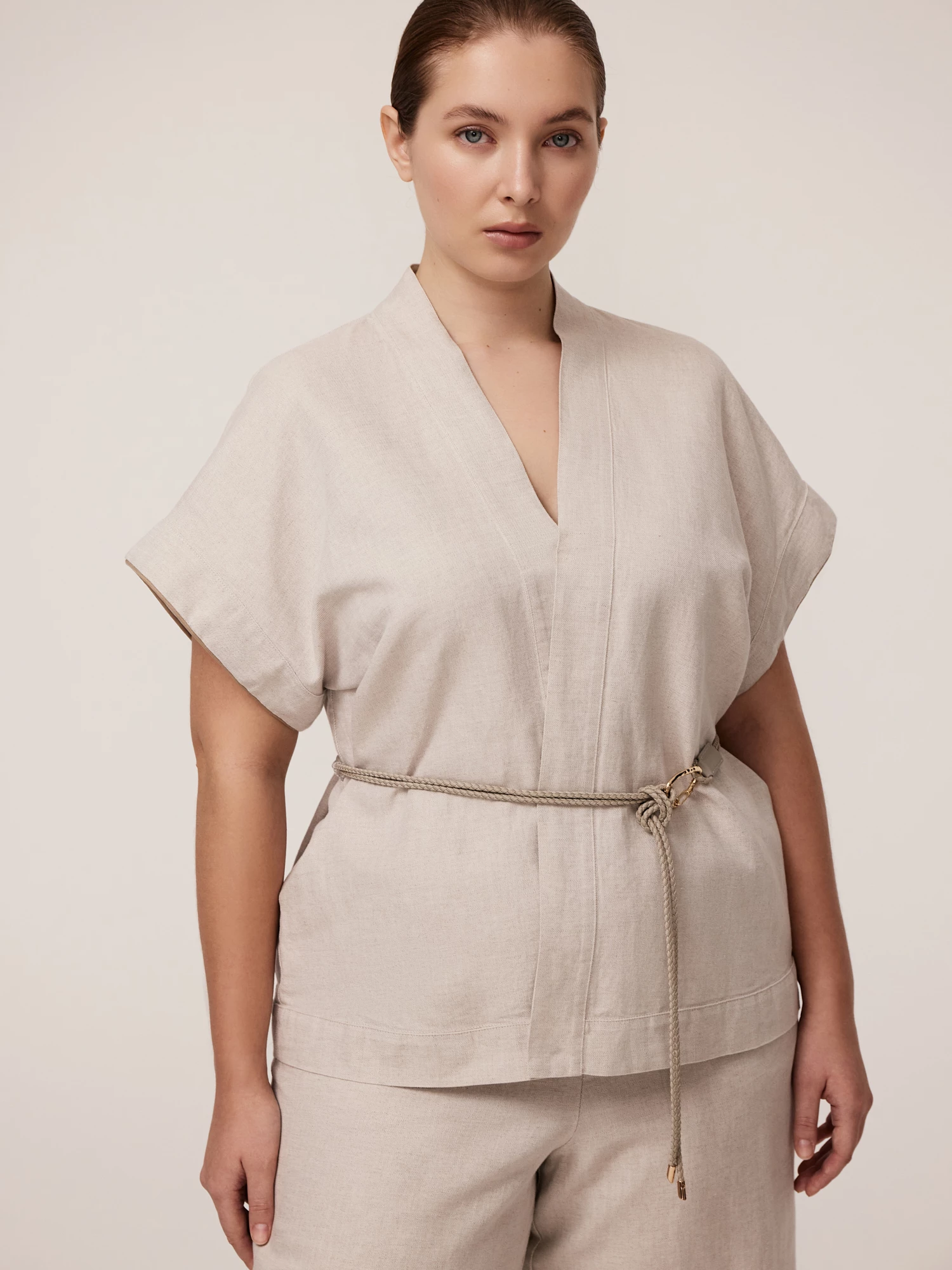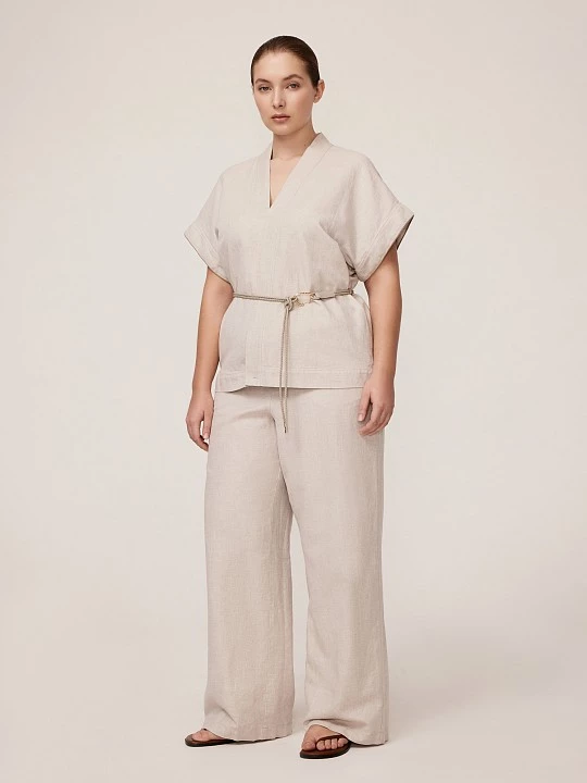 Бренд: LalisЦвет: Светло-бежевыйСостав: Лен - 54%, Хлопок - 46%Рост: 177Артикул: TR0587Параметры модели: 96 - 76 - 108Размер на модели: 50Коллекция: THE ENDLESS SEA