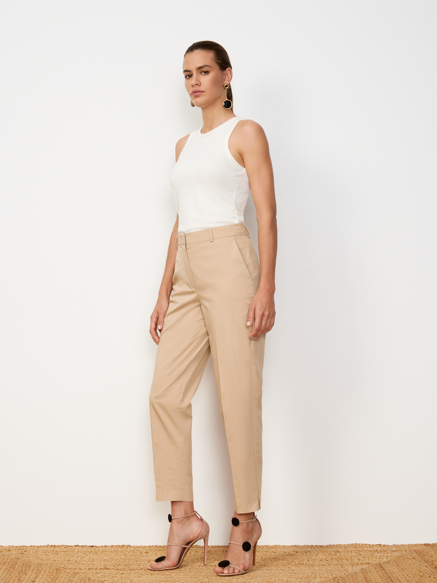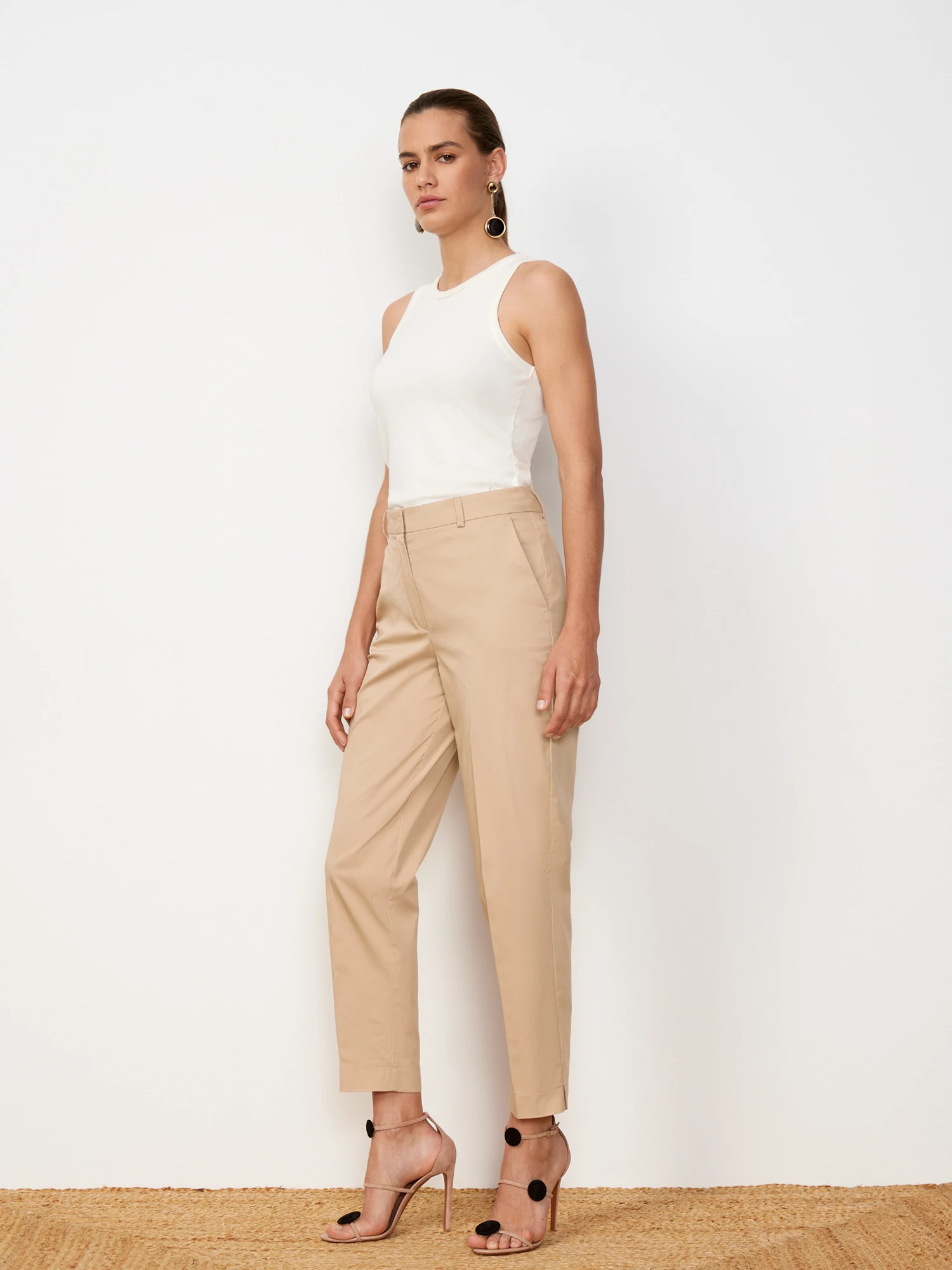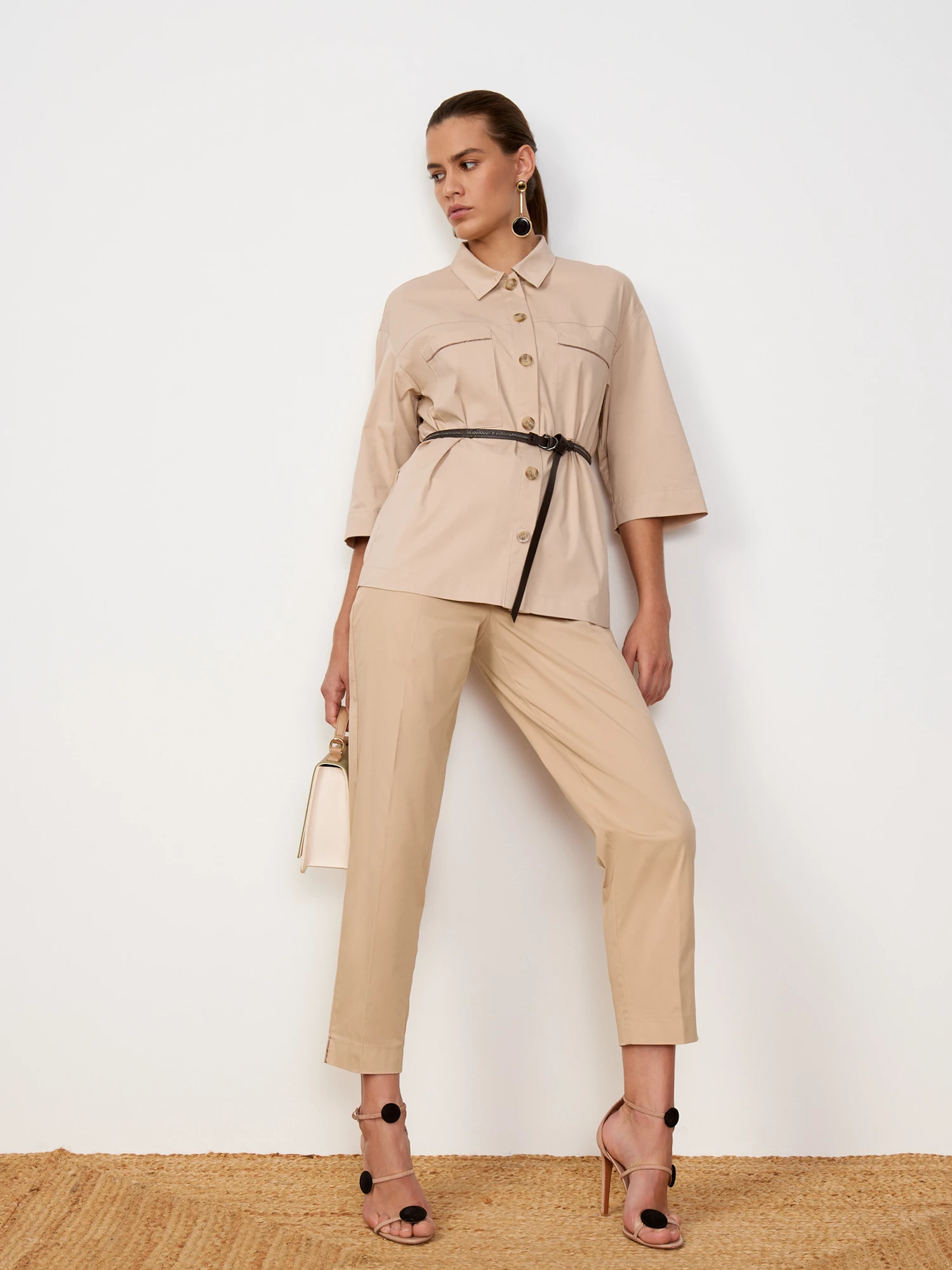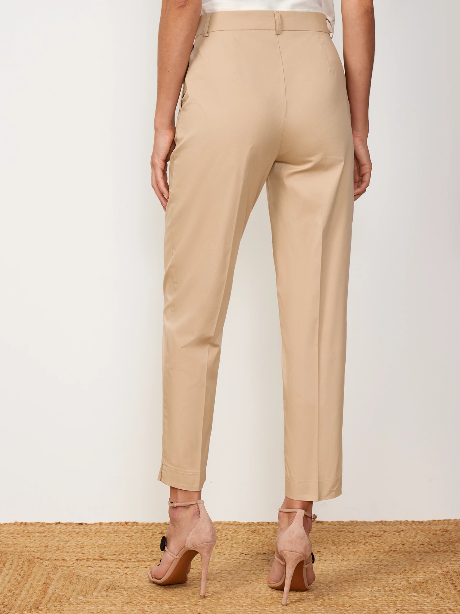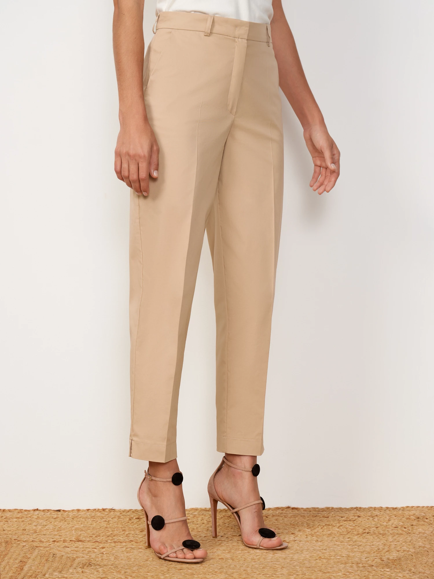 Лёгкие прямые брюки песочного оттенка. Выполнены из дышащего миксового материла, на основе мягкого хлопка, с добавлением прочных поливолокон и эластичного спандекса. Модель прямого силуэта, с притачным поясом со шлевками под ремень и французскими карманами. Графичные стрелки выстраивают вертикаль, визуально вытягивающую силуэт. Составят однотонный тотал-лук с жакетом рубашечного кроя из того же материала.