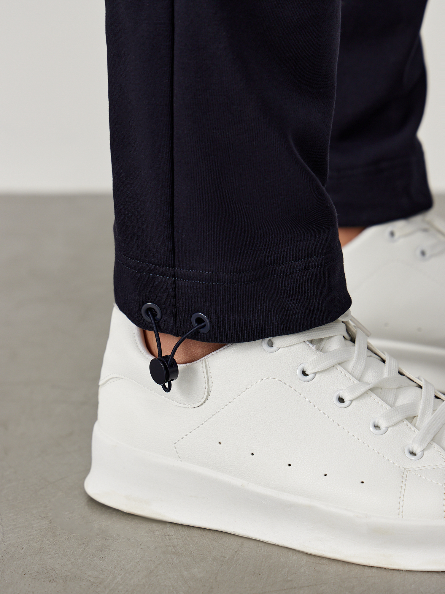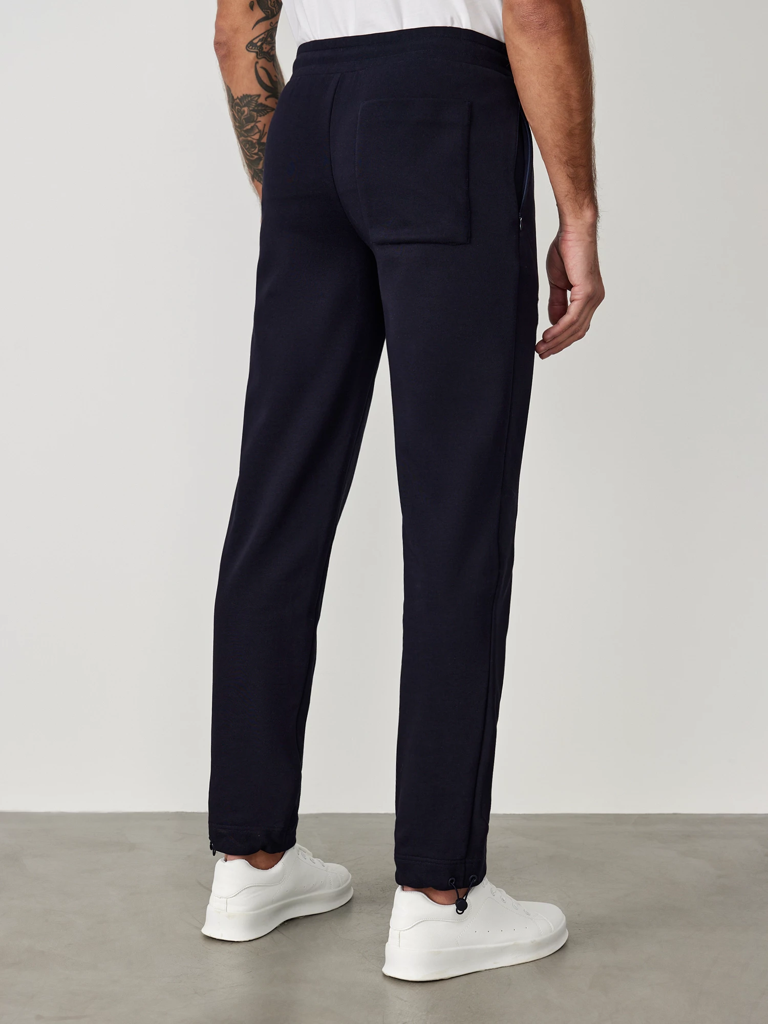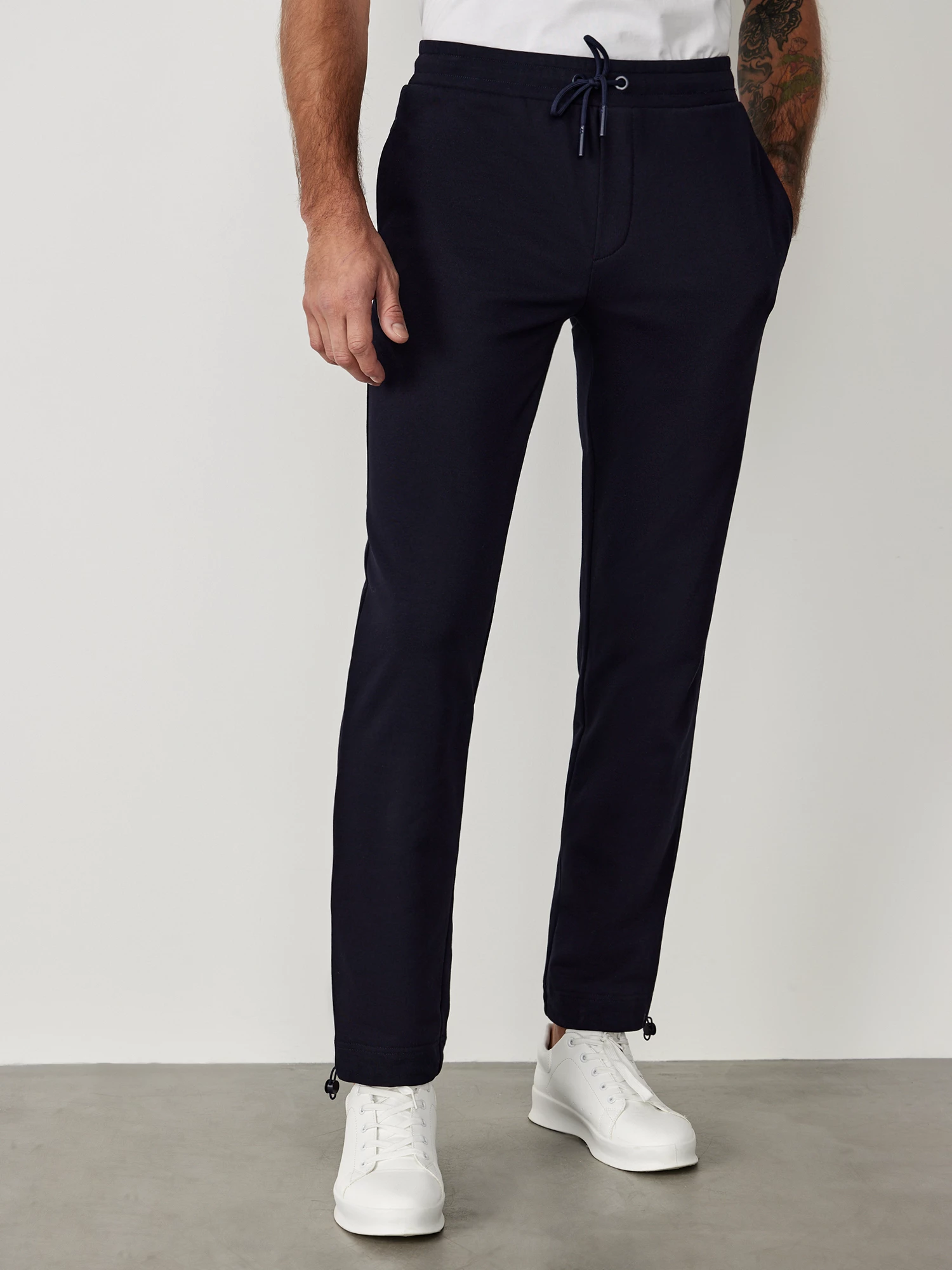 Стильные спортивные брюки из мягкого хлопкового трикотажа универсального темно-синего цвета. Модель комфортного прямого кроя, с эластичным поясом на резинке и завязках, двумя прорезными карманами в боковых швах с потайной тесьмой-молнией и одним накладным карманом сзади. Дизайнерское решение - по низу брючины кулиска, которую можно затянуть, благодаря этому брюки легко трансформируются в джоггеры. Сочетаются в качестве костюма с толстовкой из той же коллекции, а также с базовыми однотонными майками и спортивной обувью.