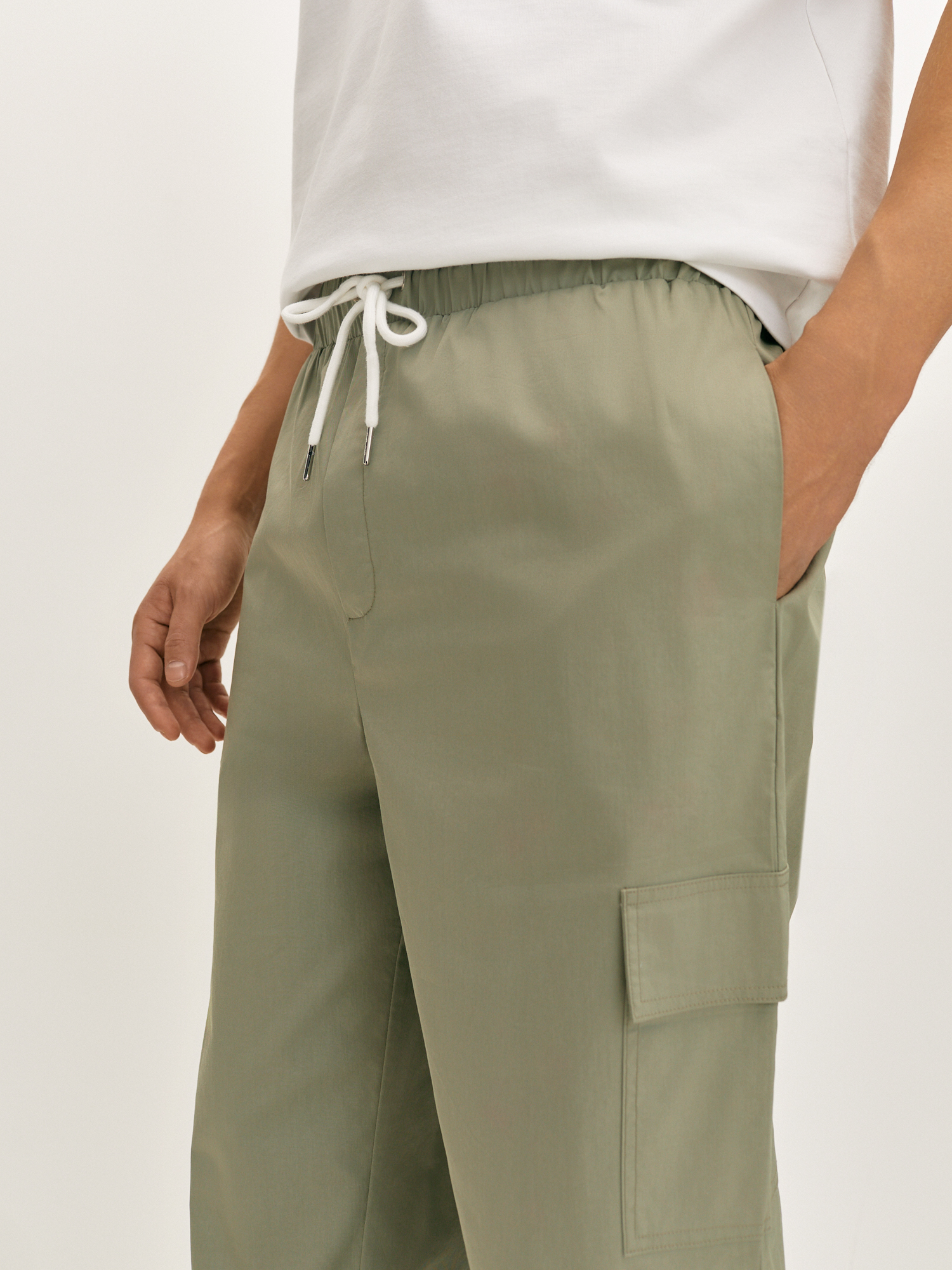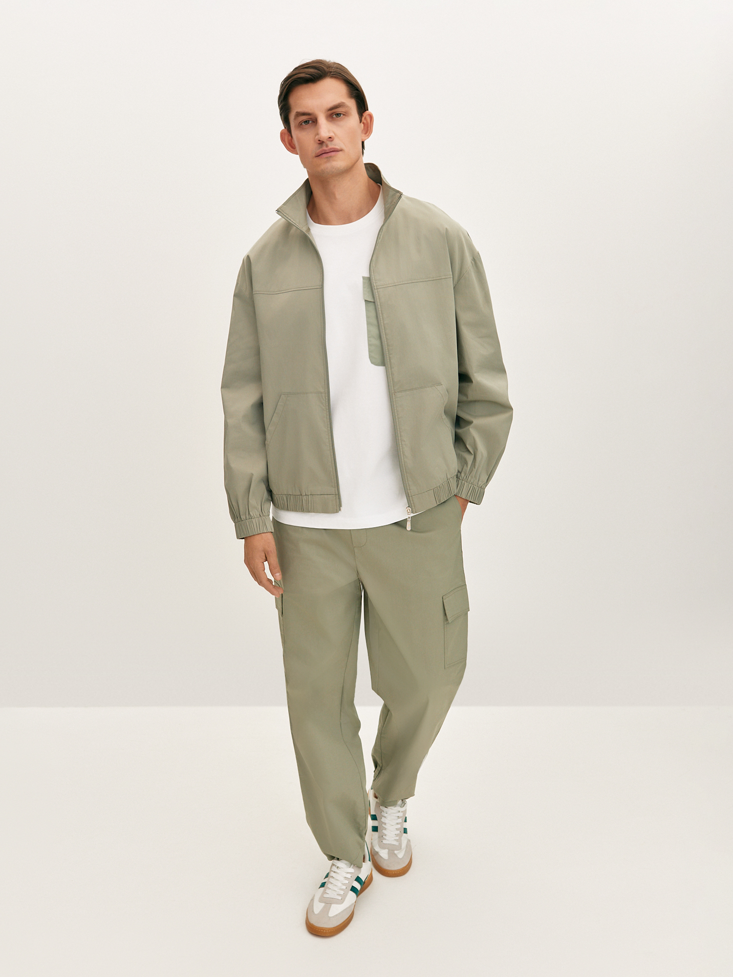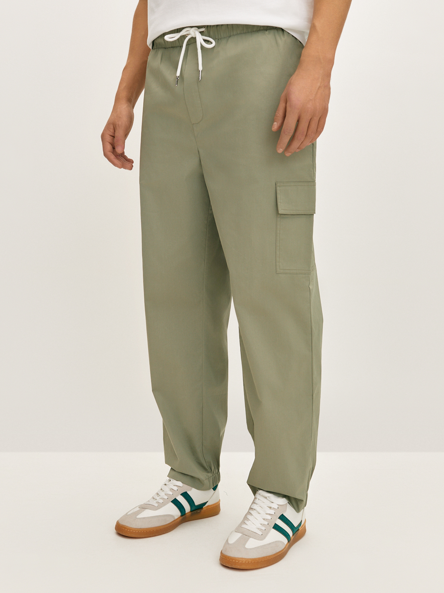 Спортивные брюки «карго» серо-зеленого оттенка прямого силуэта - Must Have весеннего сезона. Они выполнены из приятного эластичного материала на основе хлопка с добавлением нитей полиэстера для придания прочности и износостойкости. Брюки с комфортным поясом на резинке и кулиске позволяют легко регулировать посадку на талии. Модель с прорезными карманами в боковом шве и накладными карманами с клапаном. Гармонично сочетается с базовыми футболками и со спортивным бомбером из комплекта.