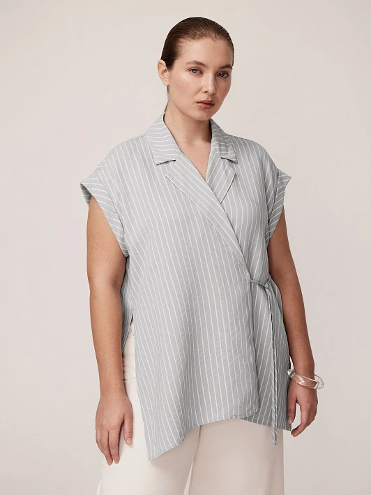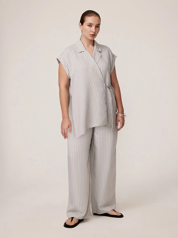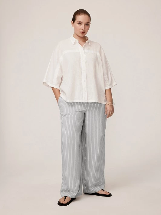 Модель выполнена в стиле "классический кэжуал" с элементами утонченности. Туманный серый в белую в сочетании с бежевой игольчатой полоской гармоничен и практически универсален в сочетаниях. Полоска – модный тренд любого сезона - обладает способностью визуально изменять телосложение. Имитация гульфика обеспечивает хорошую посадку в области живота. Пояс прострочен по резинке, она не будет перекручиваться. Карманы в швах функциональны. Широкий подгиб по низу оформлен с помощью имитации ручного стежка, такая строчка не утяжеляет изделие. Брюки выполнены из турецкой вискозной ткани с небольшим добавлением поливолокон. Вискоза обеспечивает мягкость, легкость и приятные тактильные ощущения. Она хорошо пропускает воздух, что делает модель комфортной для носки. Полиэстер отвечает за прочность и долговечность изделия. Носите с блузой в такую же полоску или с однотонным верхом.