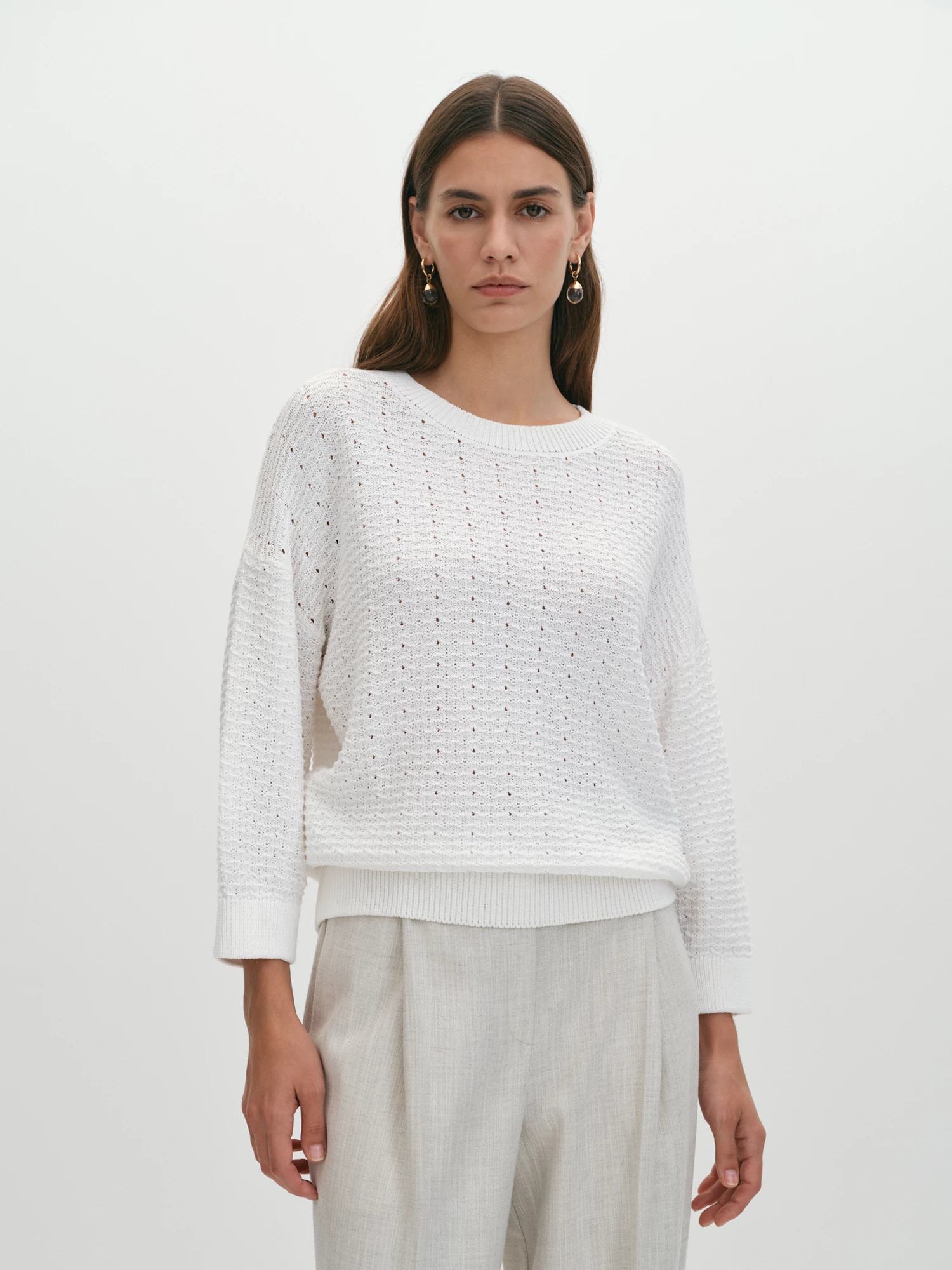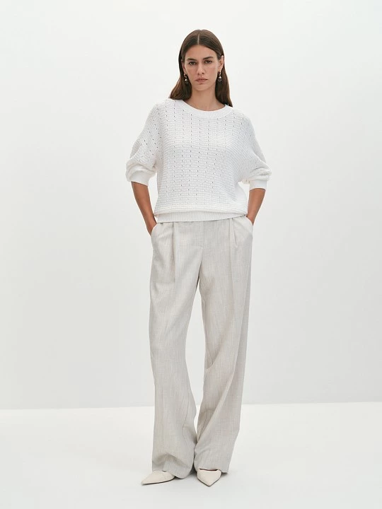 Джемпер особой вязки, выполненный из итальянской пряжи, полностью состоящей из натурального хлопка, представляет собой идеальное сочетание стиля и комфорта. Хлопок, используемый в этой модели, обладает гипоаллергенными свойствами, что делает его безопасным для чувствительной кожи, а также обеспечивает отличную воздухопроницаемость, позволяя коже дышать. Одной из ключевых особенностей этого джемпера является авторское переплетение нитей, разработанное специалистами Компании. Этот уникальный фантазийный ажур придаёт модели легкость и воздушность, что делает её идеальной для носки в тёплую погоду, вплоть до уверенной плюсовой температуры. Такой подход к дизайну не только добавляет визуального интереса, но и создает ощущение невесомости, делает джемпер особенно привлекательным. Горловина, низ изделия и манжеты укороченных рукавов связаны резинкой, что обеспечивает удобство и комфорт при носке. Резинка помогает сохранить форму изделия, предотвращая его растягивание и деформацию. Укороченные рукава добавляют современный штрих и делают джемпер более универсальным, позволяя легко сочетать его с различными предметами гардероба. Все детали джемпера были вывязаны точно по лекалу на японской плосковязальной машине Shima Seiki, что гарантирует высокое качество и долговечность. Эта технология позволяет достичь идеальной точности в вязании, что особенно важно для создания сложных узоров и текстур. Соединительные швы выполнены на кеттельном оборудовании, что является признаком премиального подхода к производству. Эта дорогая обработка обеспечивает эластичное и практически незаметное соединение, что делает джемпер ещё более комфортным в носке и не стесняет движений. Все детали джемпера были вывязаны точно по лекалу на японской плосковязальной машине Shima Seiki, что гарантирует высокое качество и долговечность. Эта технология позволяет достичь идеальной точности в вязании, что особенно важно для создания сложных узоров и текстур. Соединительные швы выполнены на кеттельном оборудовании, что является признаком премиального подхода к производству. Такая сложная, с высокой долей ручного труда, обработка обеспечивает эластичное и практически незаметное соединение, что делает джемпер ещё более комфортным в носке и не стесняет движений. Таким образом, джемпер особой вязки в актуальном белом цвете не только отражает современные модные тренды, но и является универсальным элементом гардероба, который легко комбинируется с различными предметами одежды. Он станет отличным выбором для создания стильных образов, добавляя в них нотку оригинальности и утонченности.