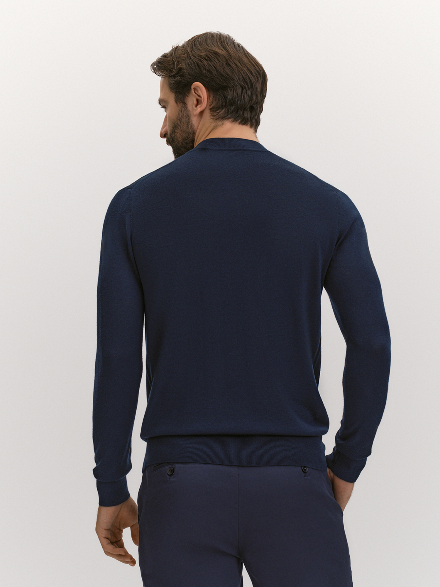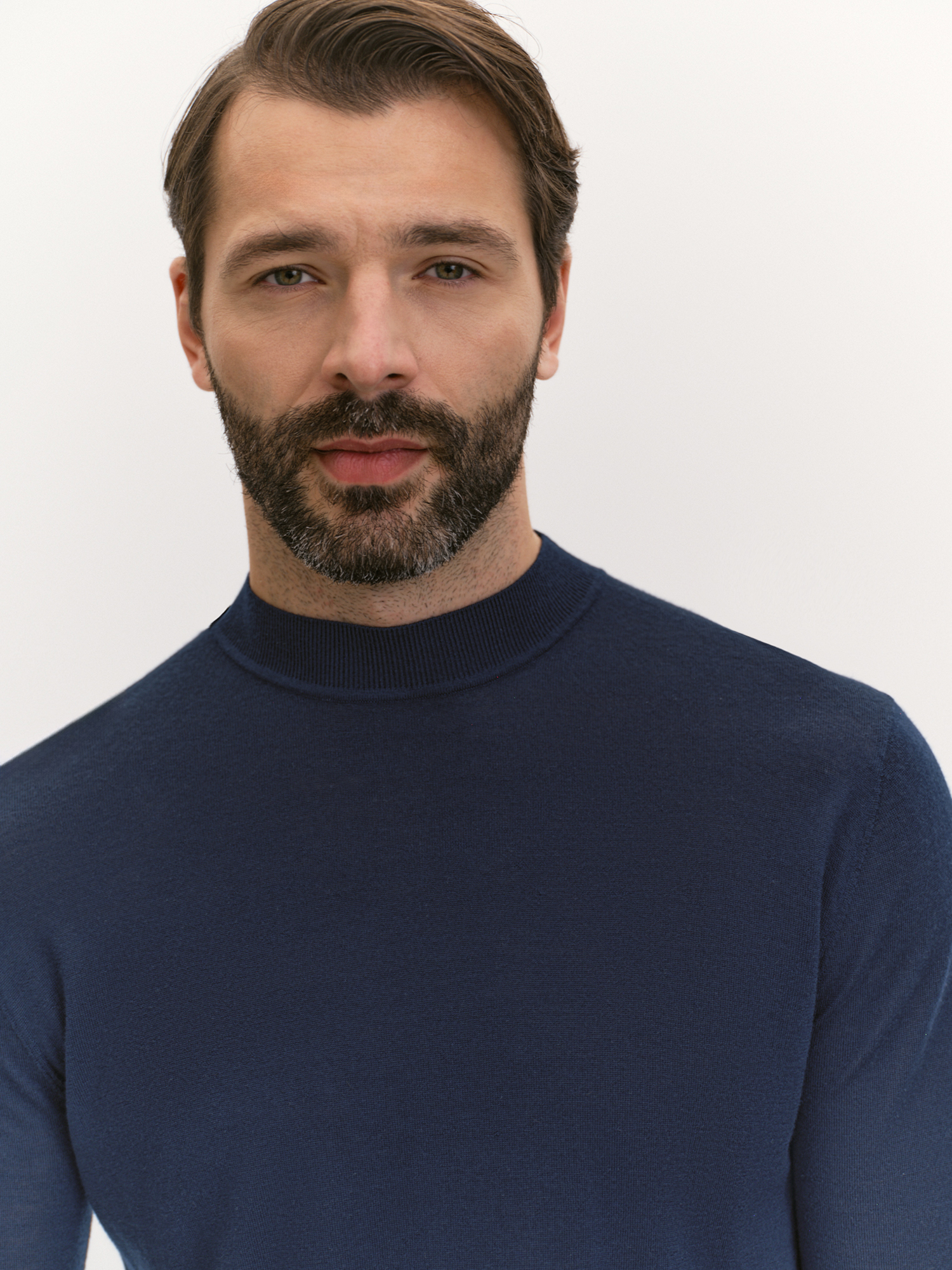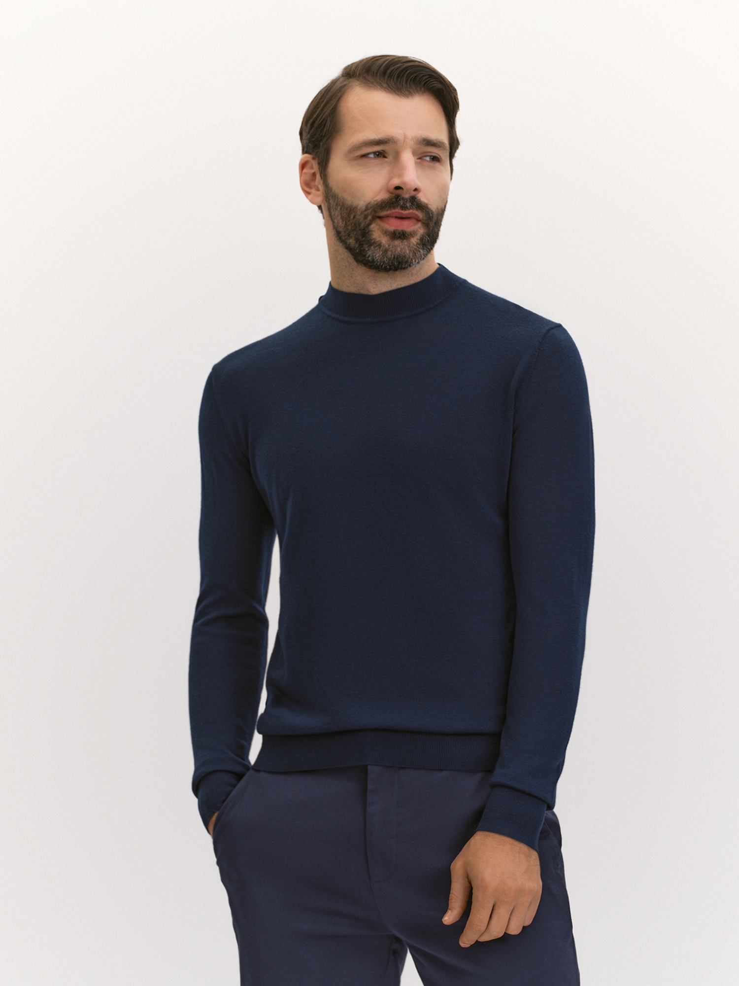 Классический джемпер из премиальной пряжи - хорошая инвестиция в базовый гардероб. Лаконичный дизайн модели делает ее подходящей для неформальных мероприятий, офиса, повседневной носки. Длинные рукава и воротник-полустойка добавляют уют и защищают от холода, а также позволяют создавать многослойные образы с рубашками, благодаря С-образной форме воротника. Джемпер выполнен из натуральной шерсти мериноса, известной своей мягкостью. Такой состав пряжи делает джемпер комфортным для ношения даже на голое тело. Терморегуляционные свойства шерсти обеспечивают комфортную температуру в любых условиях: она согревает в холод и охлаждает в тепло. Шерсть мериноса эластична, не сковывает движения и подходит для активного образа жизни. Темно-синий цвет выразителен, строг и элегантен. Крой модели комфортного облегания не стесняет движения, обеспечивая свободу и удобство. Кеттельная эластичная обработка швов делает их практически незаметными, что подчеркивает высокое качество изделия и обеспечивает долговечность. Высокий 18-й класс вязания — это вершина технологий в трикотажном производстве. Он гарантирует тонкость и премиальное качество вязаного полотна, создавая изделия, которые сочетают в себе легкость, комфорт и роскошь. Такой джемпер — прекрасный выбор для тех, кто ценит внимание к деталям и стремится к совершенству своего гардероба.