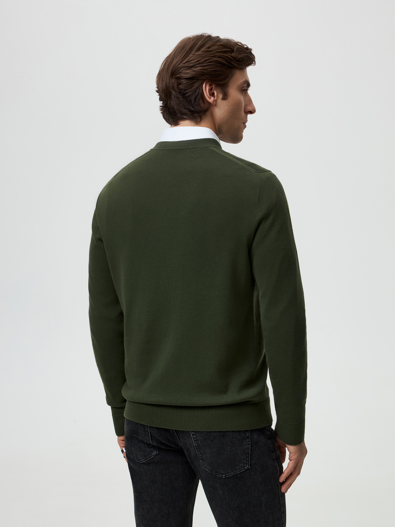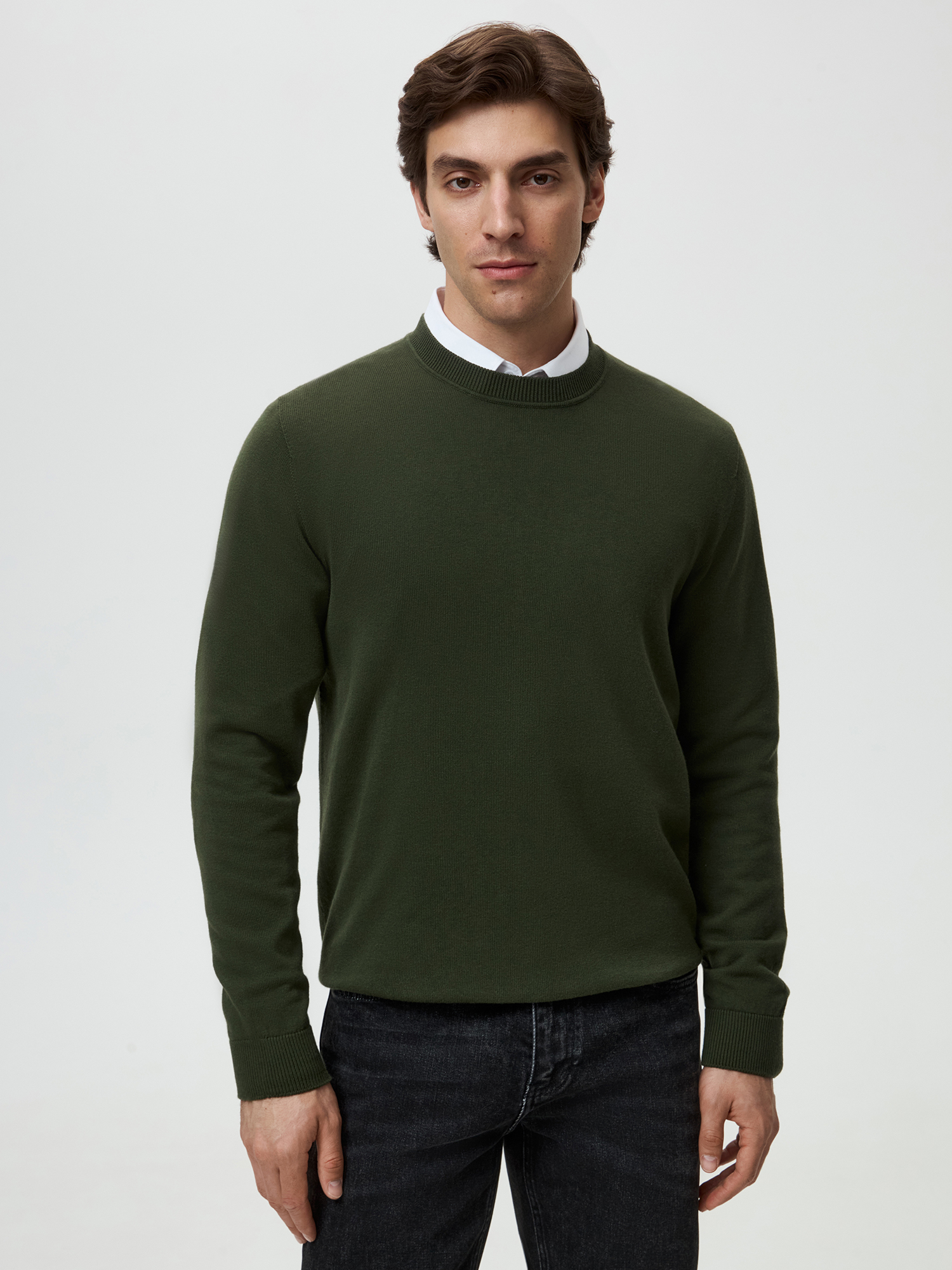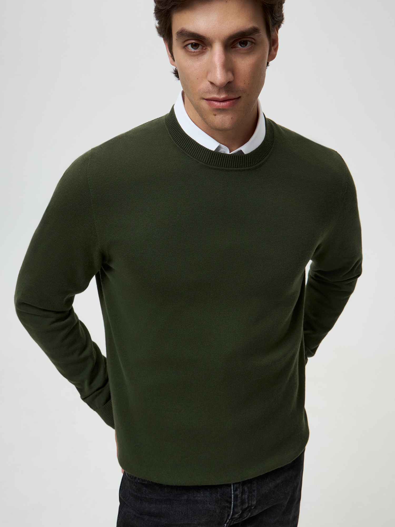 Вязаный джемпер в благородном оттенке хаки гармонично сочетает комфорт и стиль. Связанный из мягкой пряжи, состоящей только из хлопка и шерсти мериноса, свитер обладает прекрасной терморегуляцией и высокими тактильным качеством. Выполнили модель с аккуратным круглым вырезом и длинным рукавом.