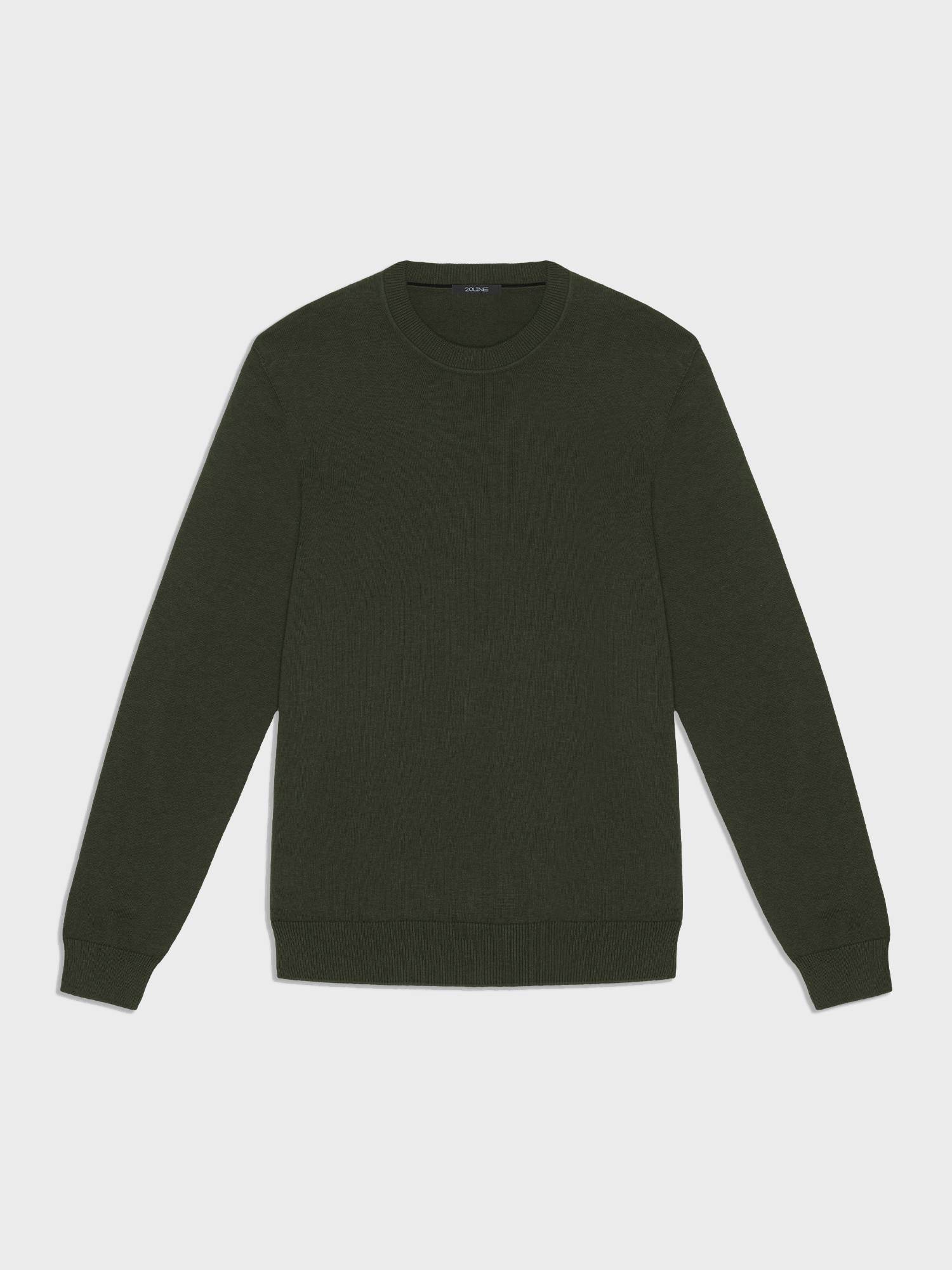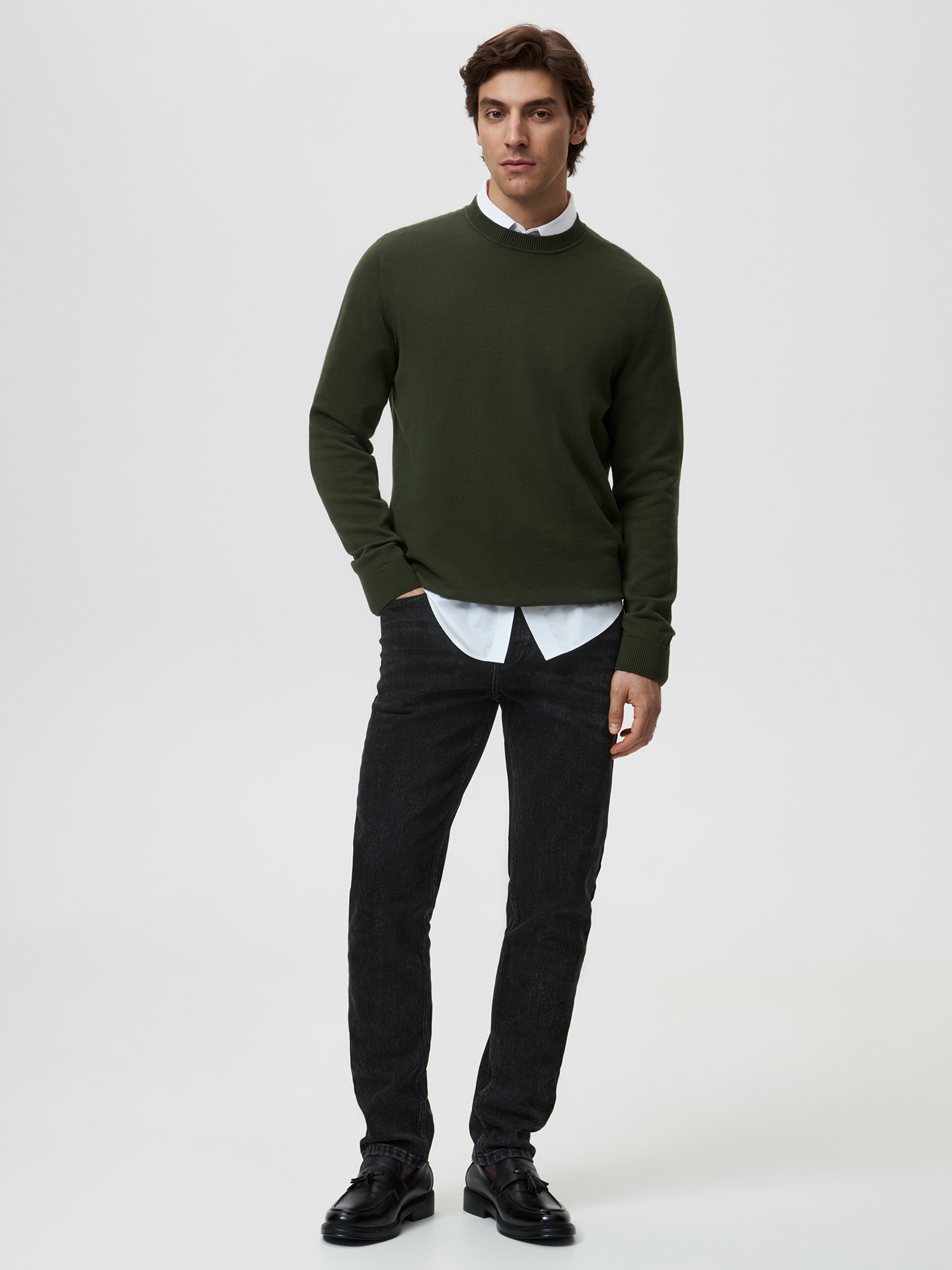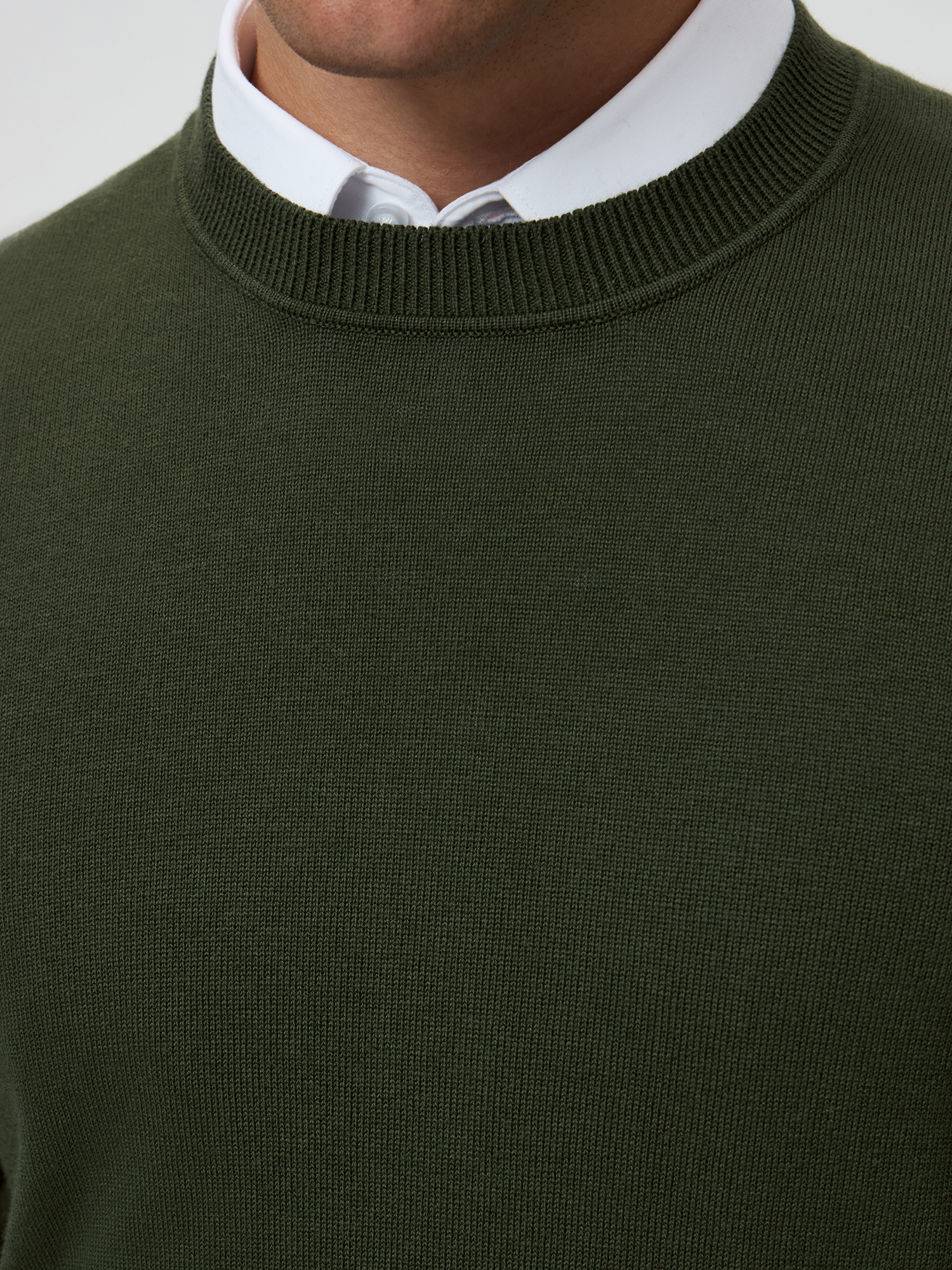 Вязаный джемпер в благородном оттенке хаки гармонично сочетает комфорт и стиль. Связанный из мягкой пряжи, состоящей только из хлопка и шерсти мериноса, свитер обладает прекрасной терморегуляцией и высокими тактильным качеством. Выполнили модель с аккуратным круглым вырезом и длинным рукавом.