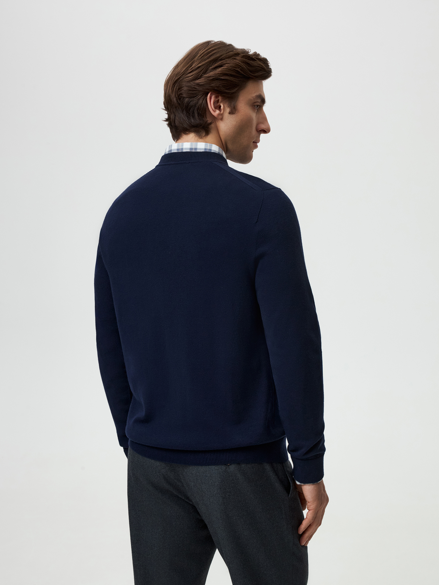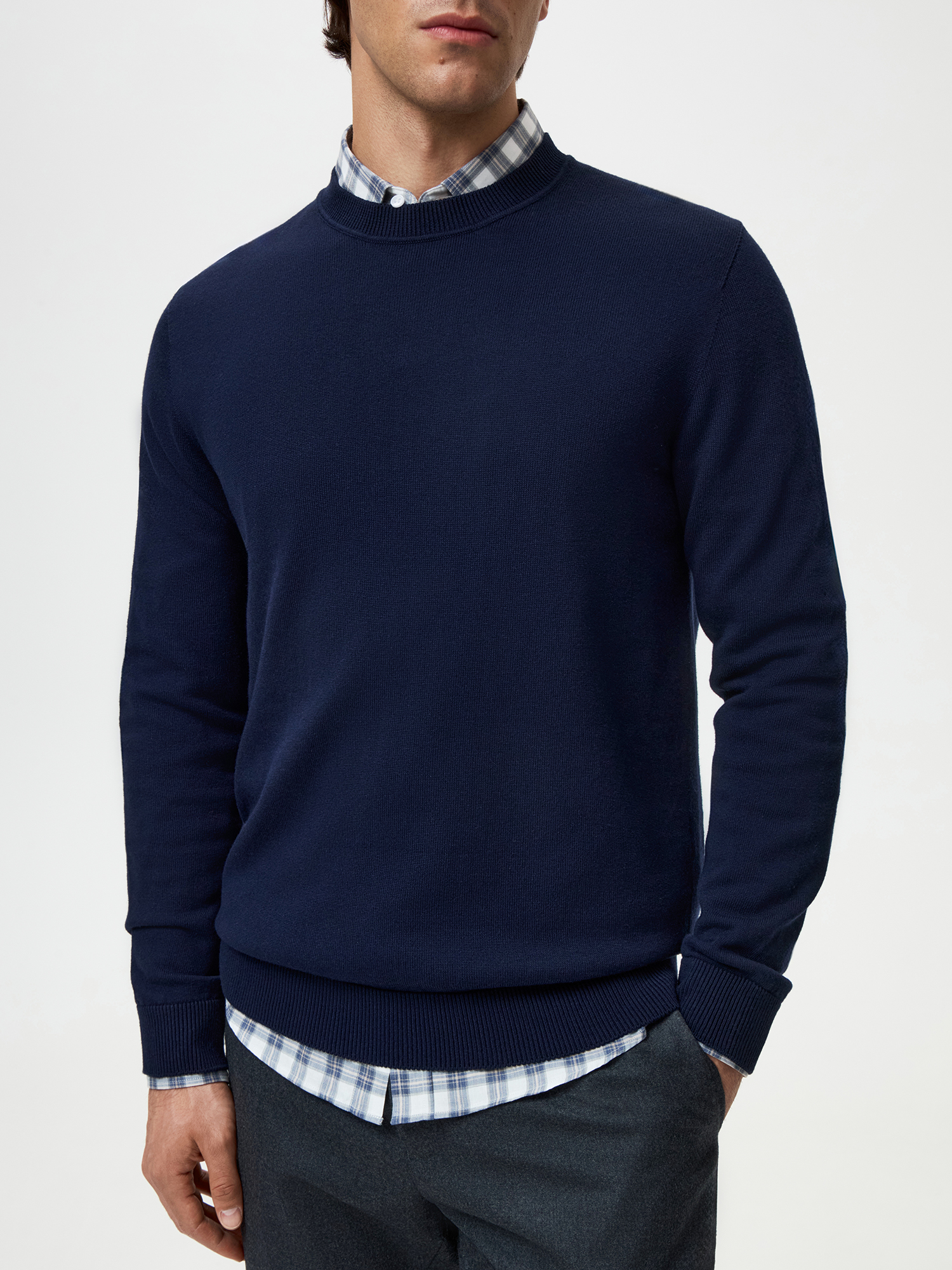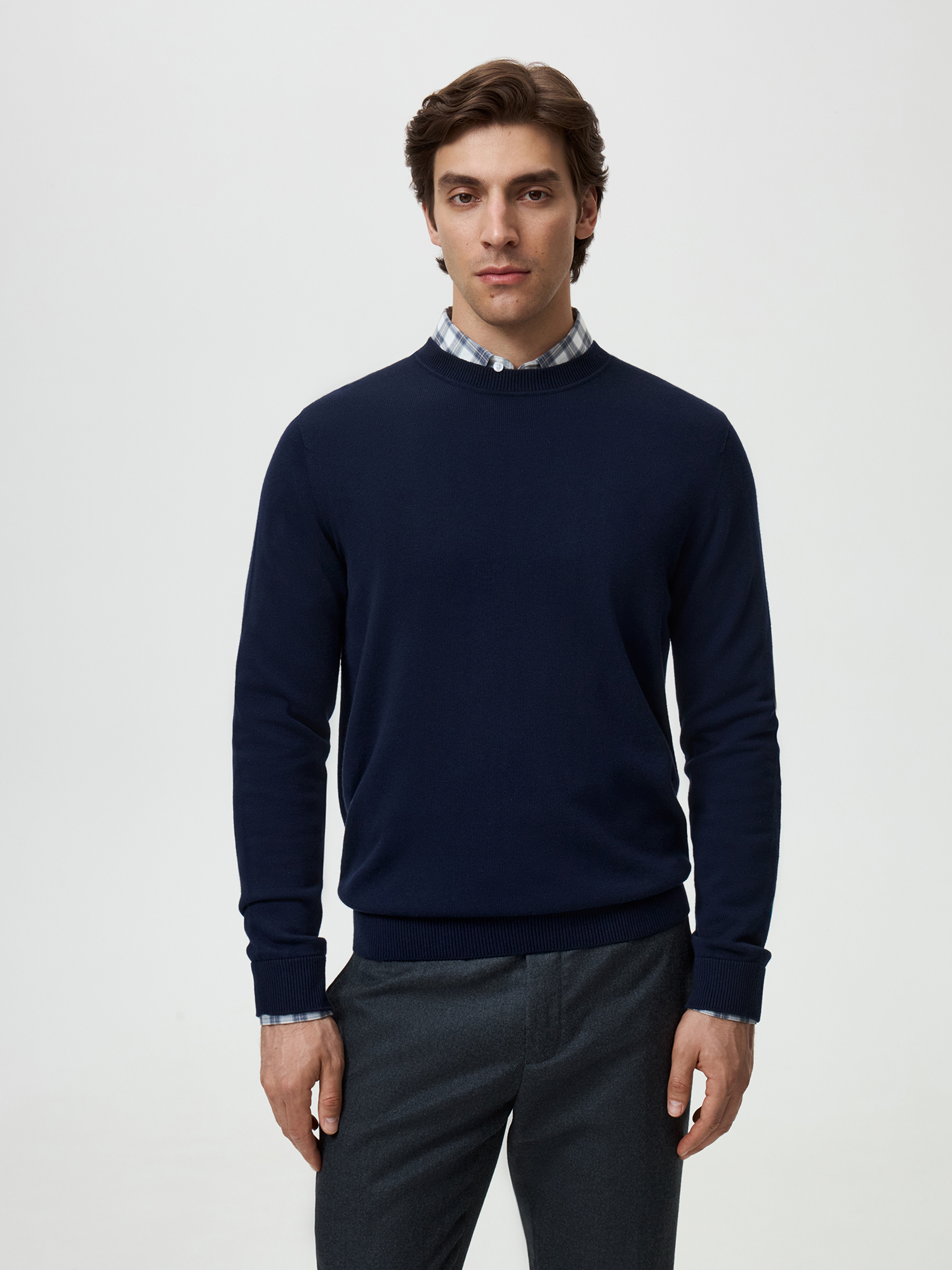 Вязаный джемпер в классическом navy гармонично сочетает комфорт и стиль. Связанный из мягкой пряжи, состоящей только из хлопка и шерсти мериноса, свитер обладает прекрасной терморегуляцией и высокими тактильным качеством. Выполнили модель с аккуратным круглым вырезом и длинным рукавом.