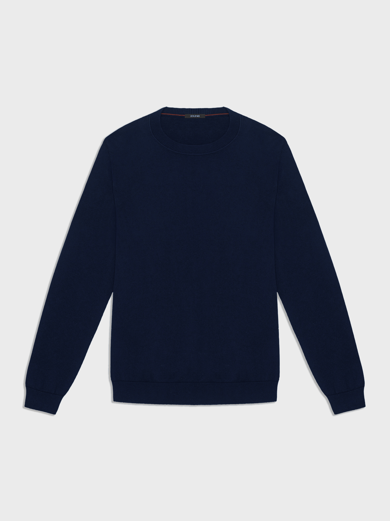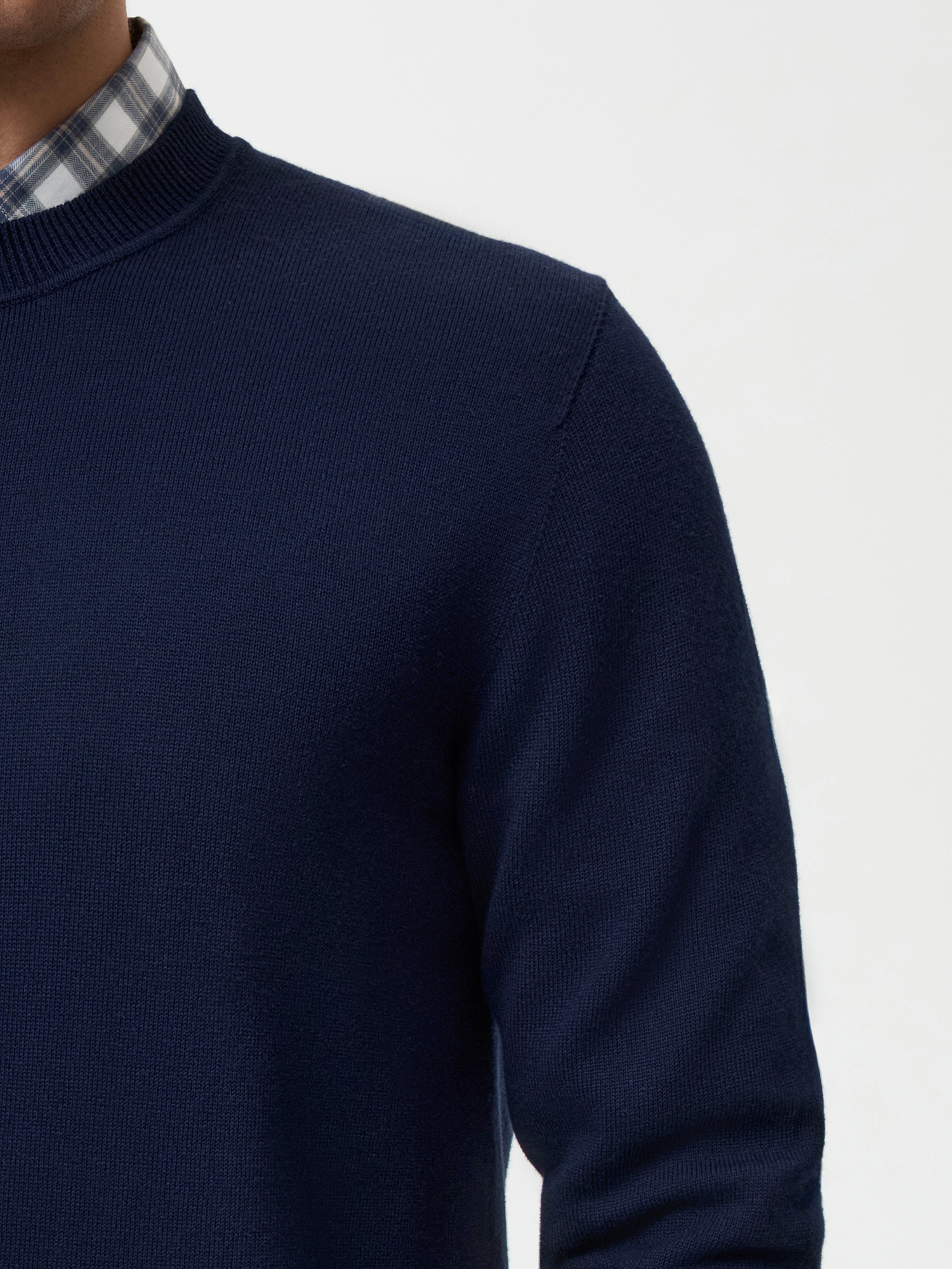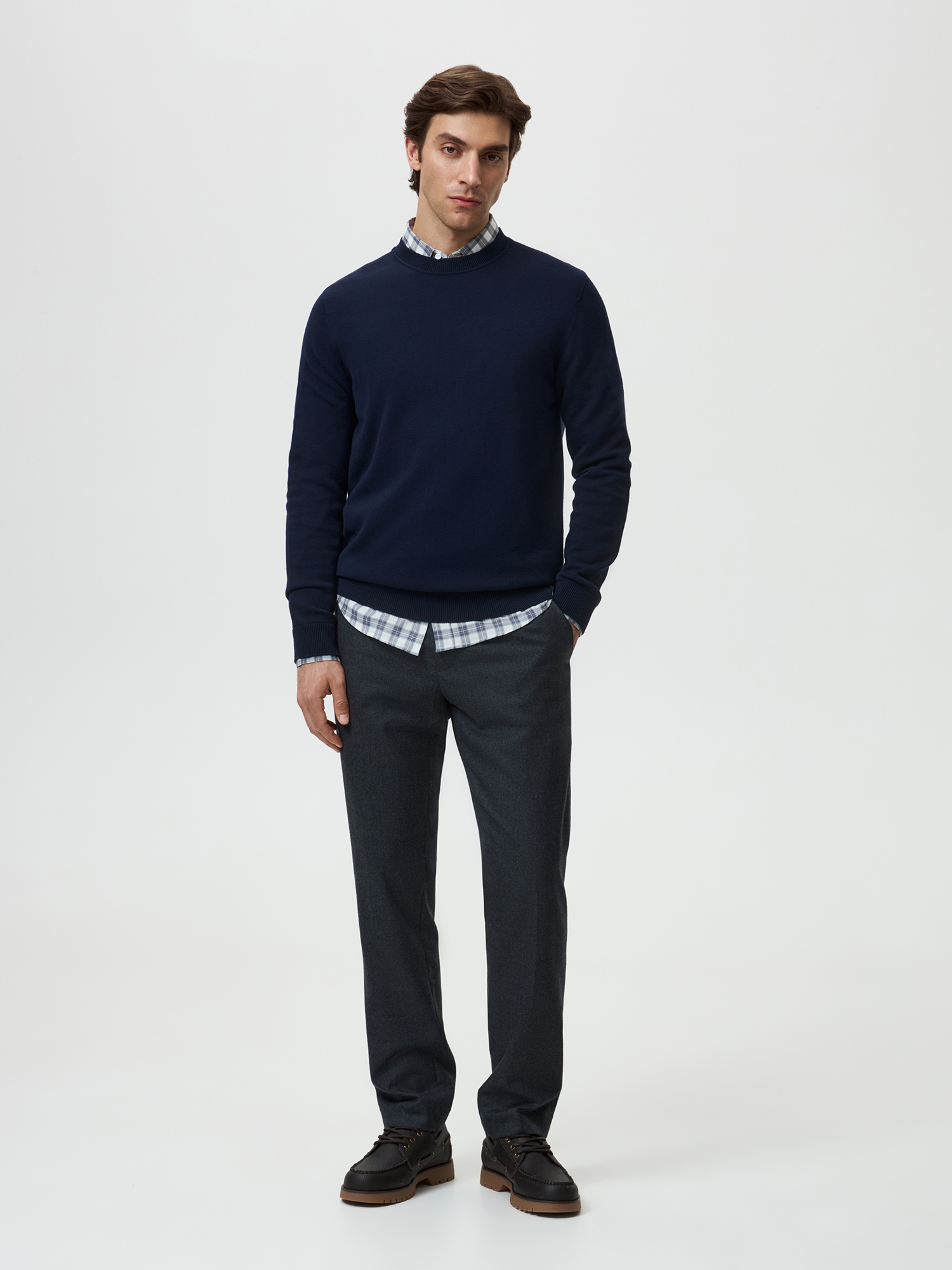Вязаный джемпер в классическом navy гармонично сочетает комфорт и стиль. Связанный из мягкой пряжи, состоящей только из хлопка и шерсти мериноса, свитер обладает прекрасной терморегуляцией и высокими тактильным качеством. Выполнили модель с аккуратным круглым вырезом и длинным рукавом.