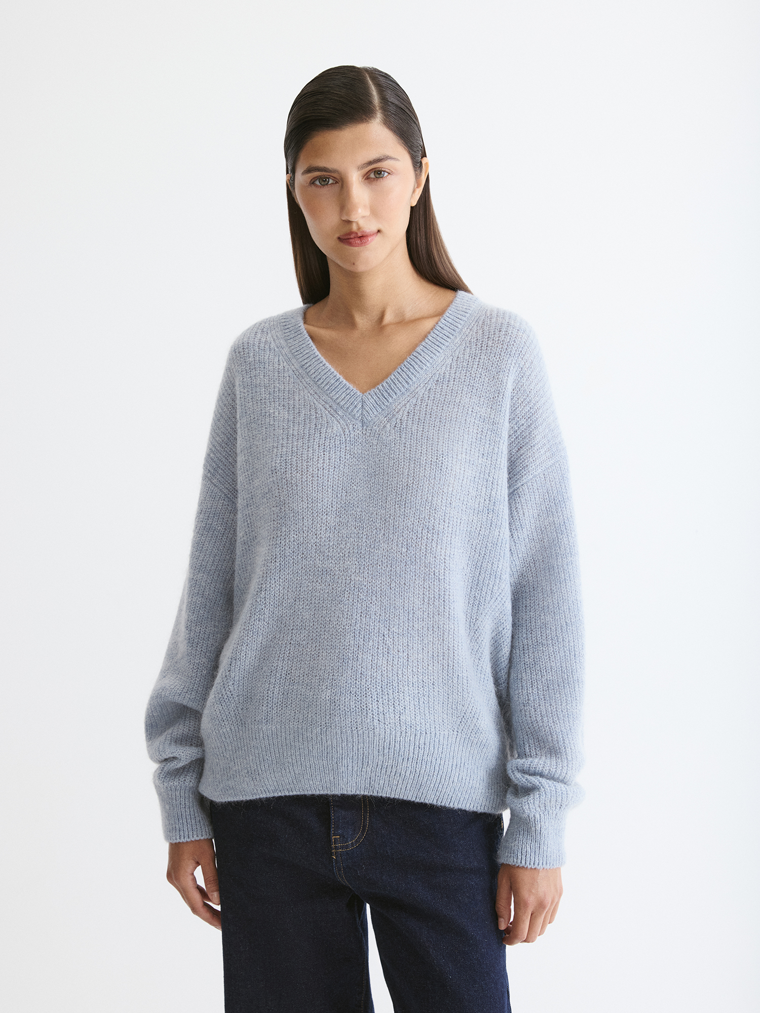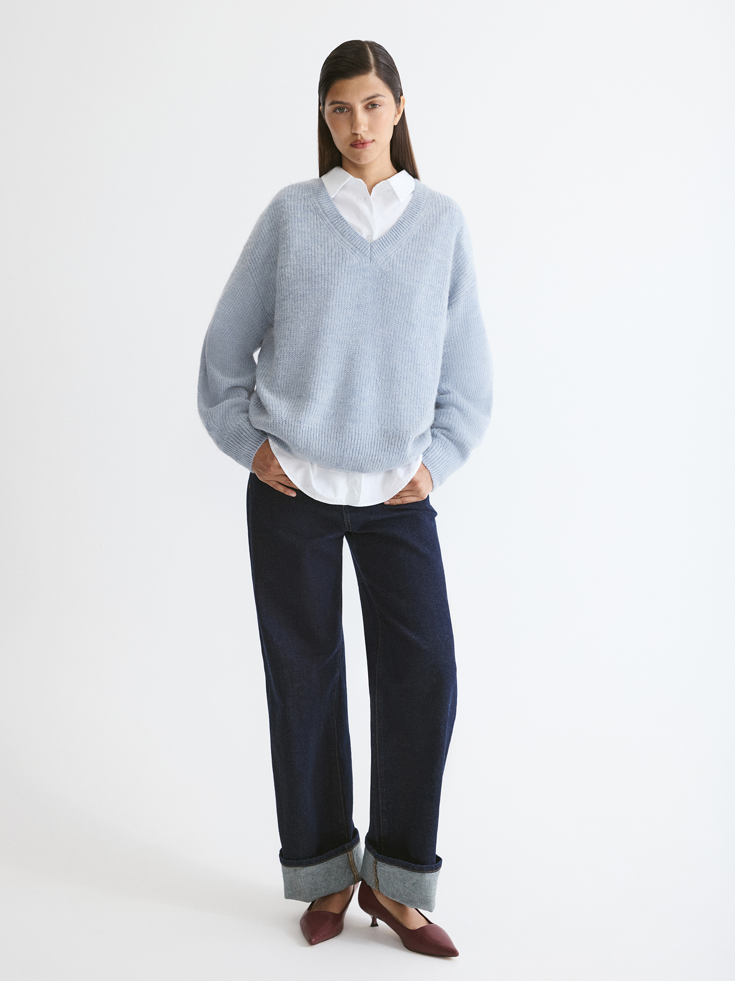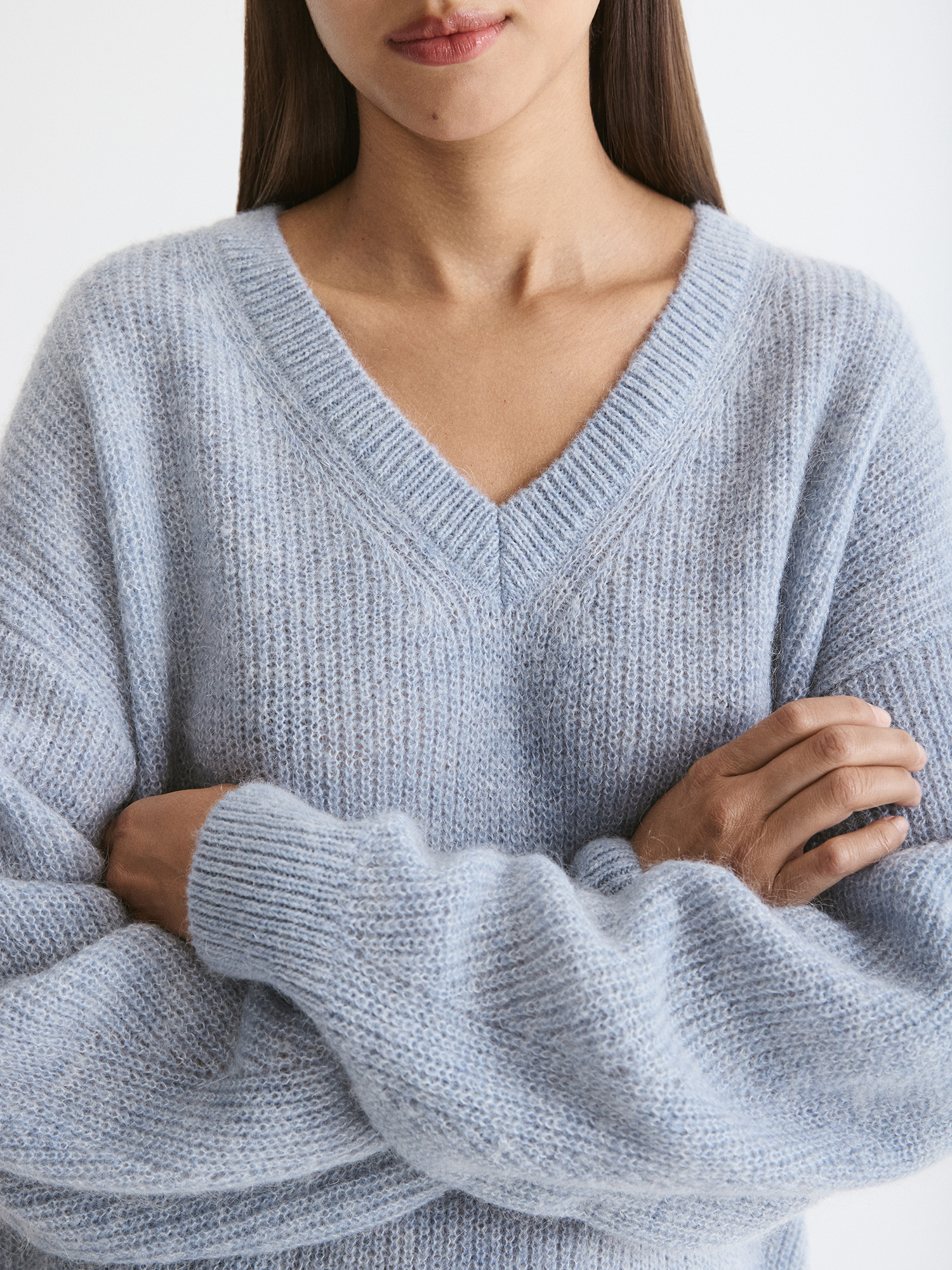 Уютный серо-голубой джемпер из мягкой итальянской пряжи - актуален для прохладных дней. Слегка увеличенный крой с V-образным вырезом и длинными наполненными рукавами непринужденен, а качественная пряжа с мохером и овечьей шерстью дарит тепло и комфорт.