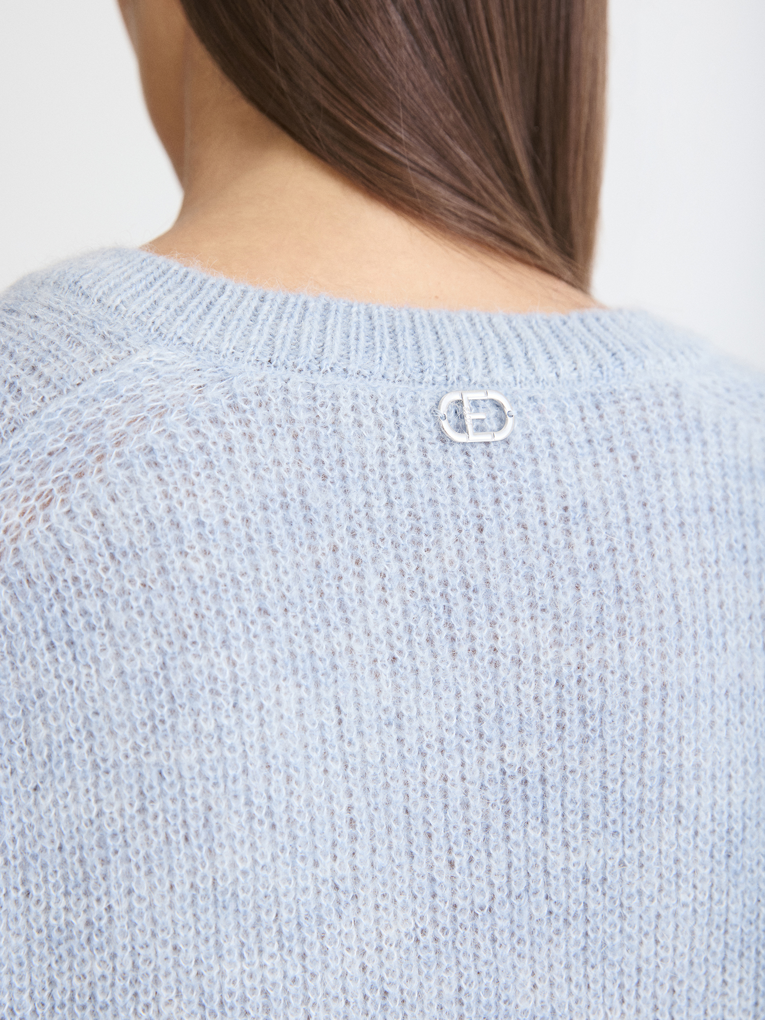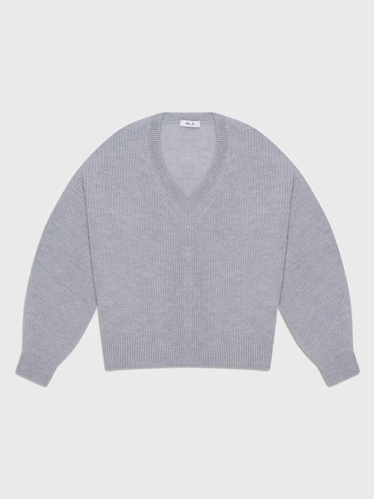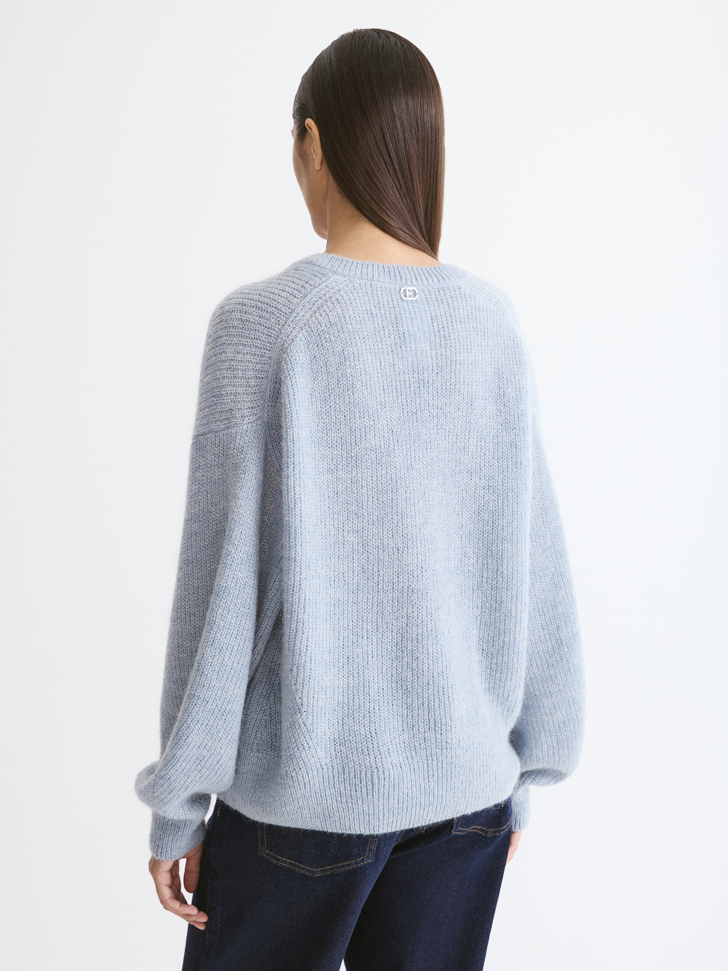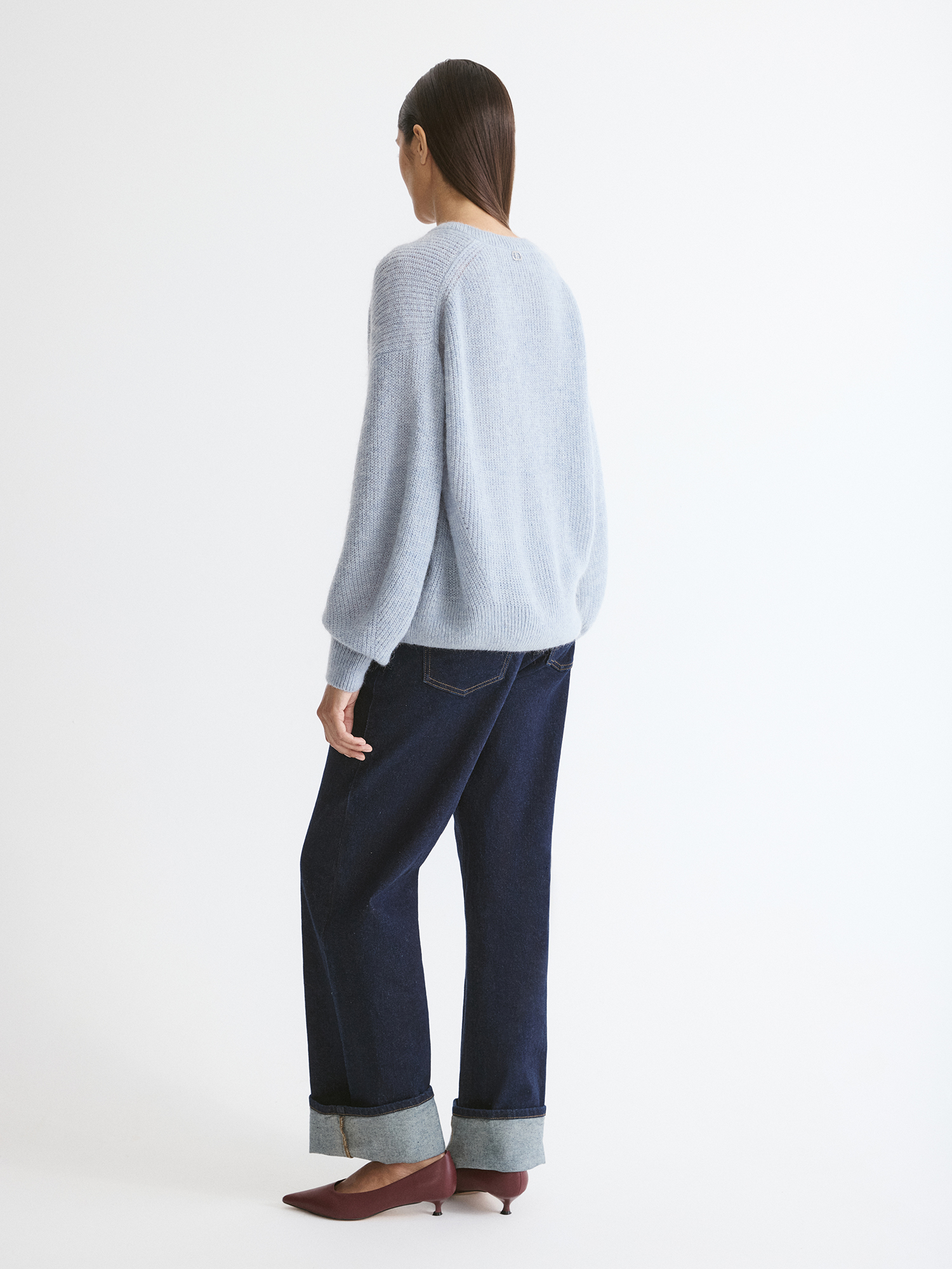 Уютный серо-голубой джемпер из мягкой итальянской пряжи - актуален для прохладных дней. Слегка увеличенный крой с V-образным вырезом и длинными наполненными рукавами непринужденен, а качественная пряжа с мохером и овечьей шерстью дарит тепло и комфорт.