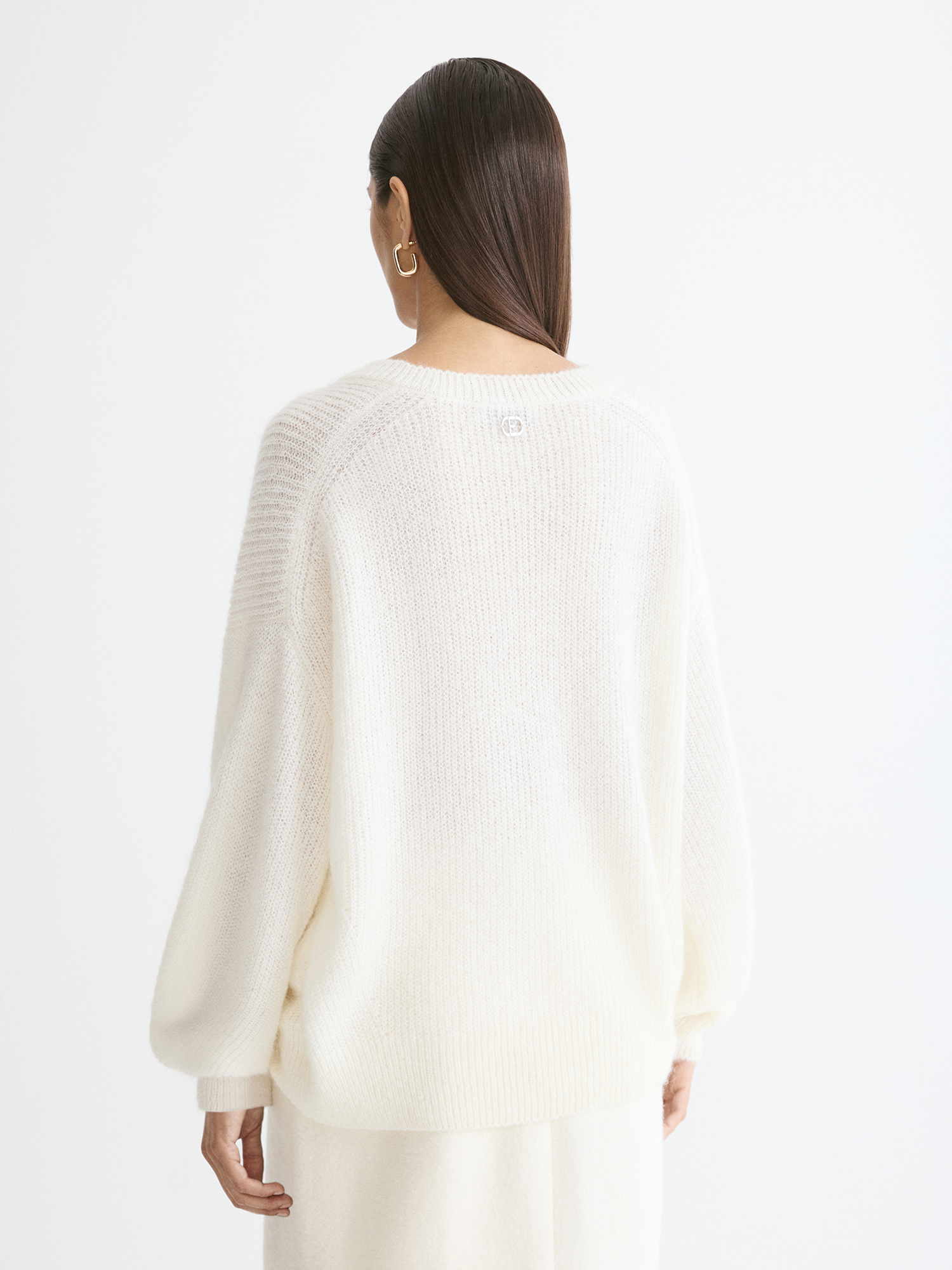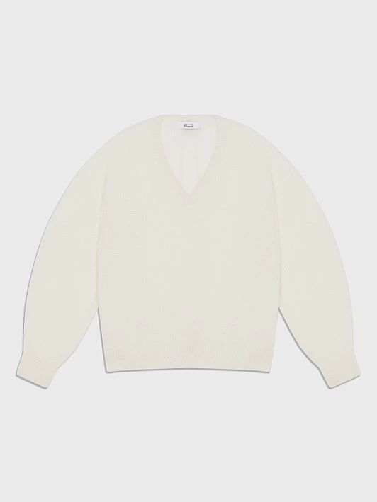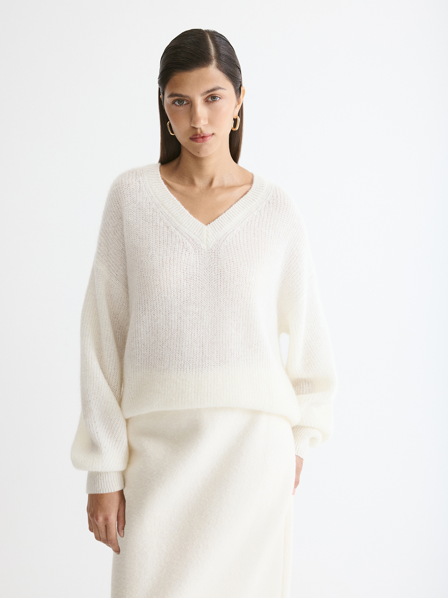 Уютный белый джемпер из мягкой итальянской пряжи - актуален для прохладных дней. Слегка увеличенный крой с V-образным вырезом и длинными наполненными рукавами непринужденен, а качественная пряжа с мохером и овечьей шерстью дарит тепло и комфорт.