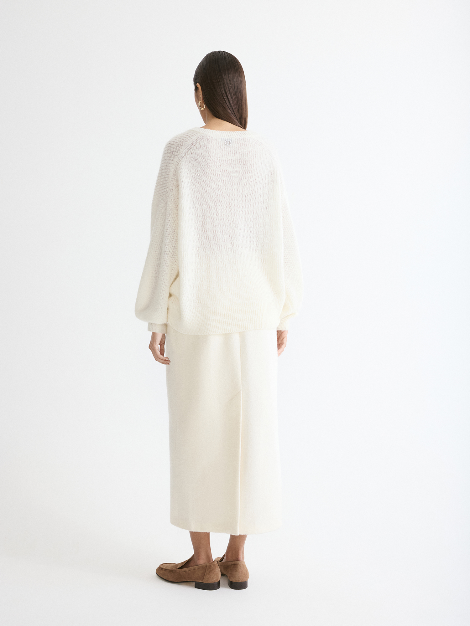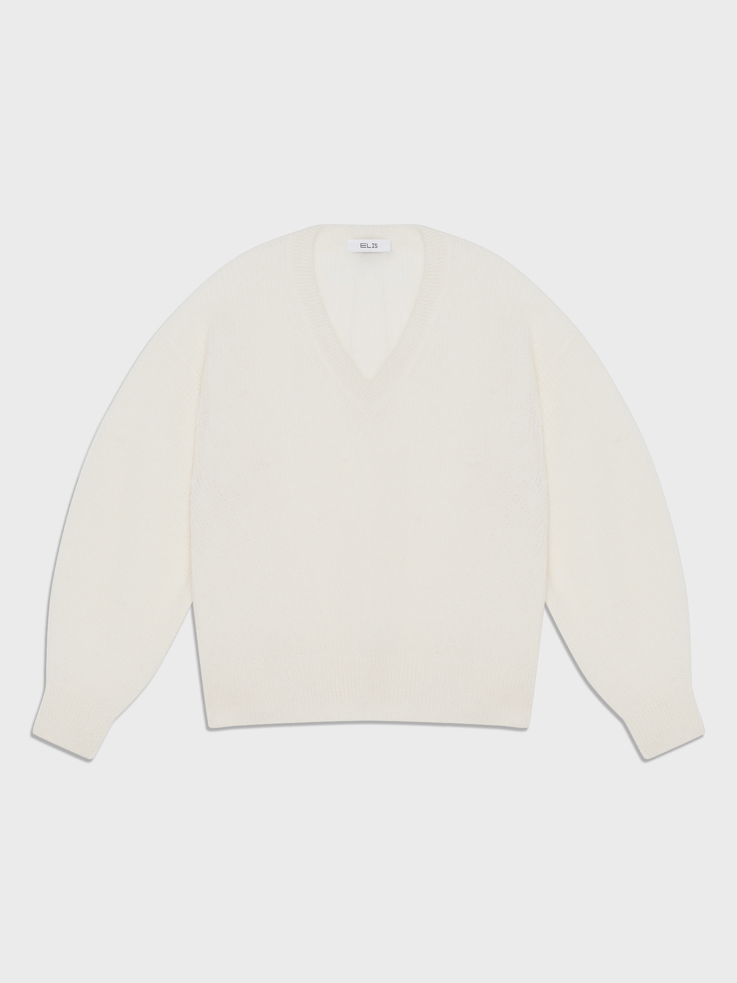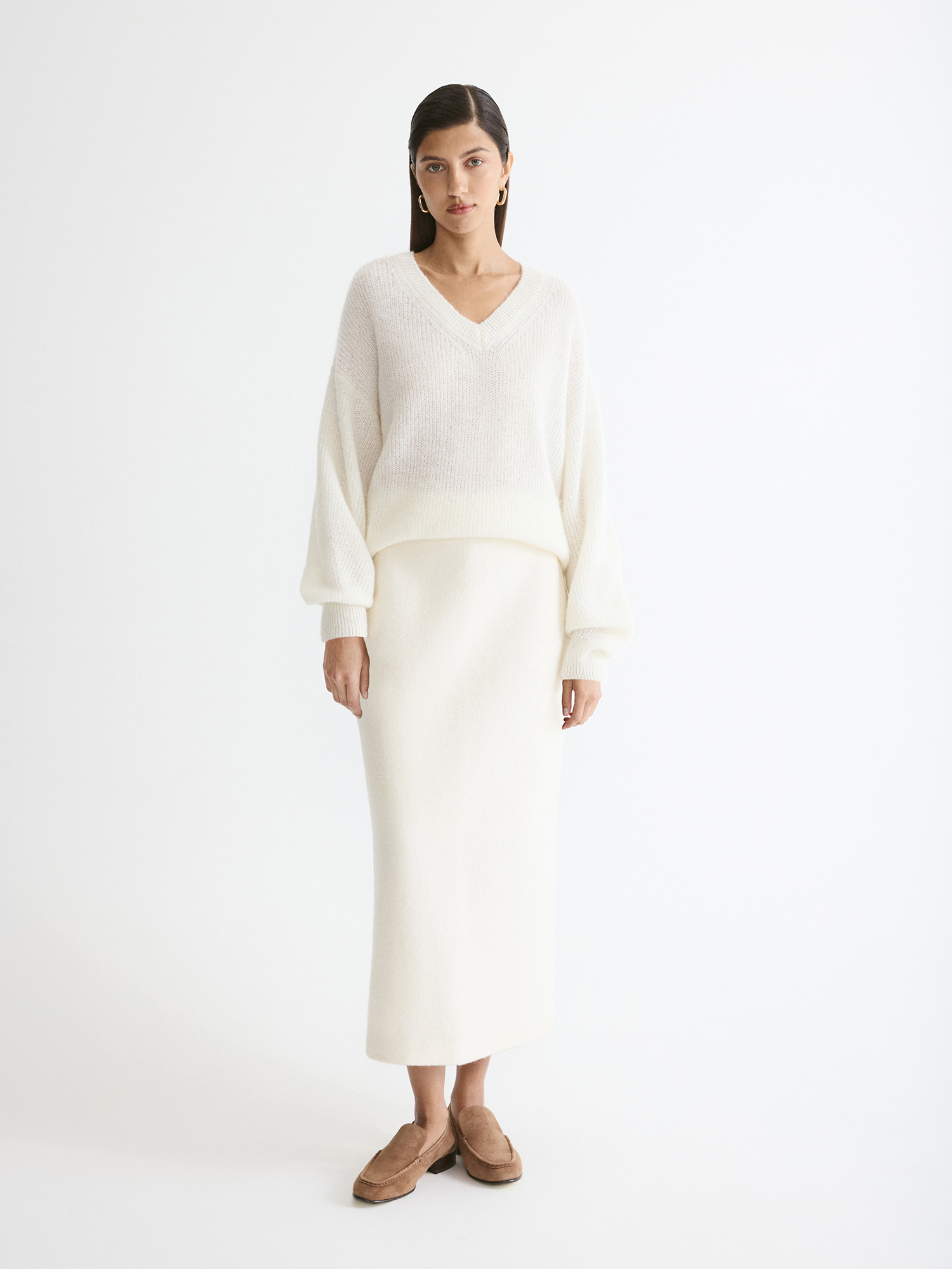 Уютный белый джемпер из мягкой итальянской пряжи - актуален для прохладных дней. Слегка увеличенный крой с V-образным вырезом и длинными наполненными рукавами непринужденен, а качественная пряжа с мохером и овечьей шерстью дарит тепло и комфорт.