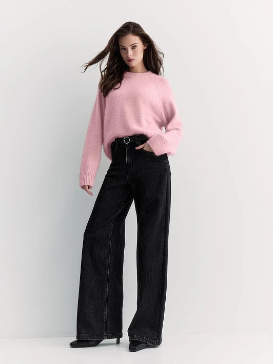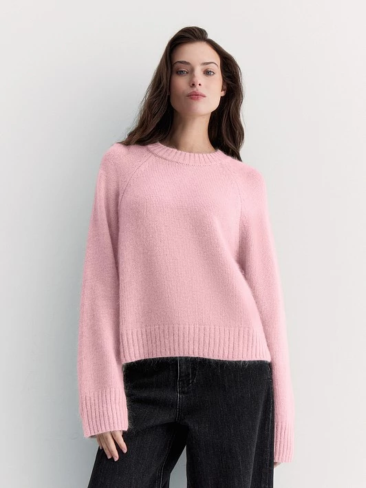 Укороченный джемпер аккуратного силуэта связан из нежной пряжи с ангорой и овечьей шерстью. Он очень мягкий, тёплый, с хорошей терморегуляцией. Выполнили модель с круглой горловиной и рукавом-реглан - удобно сидит и не сковывает движения.