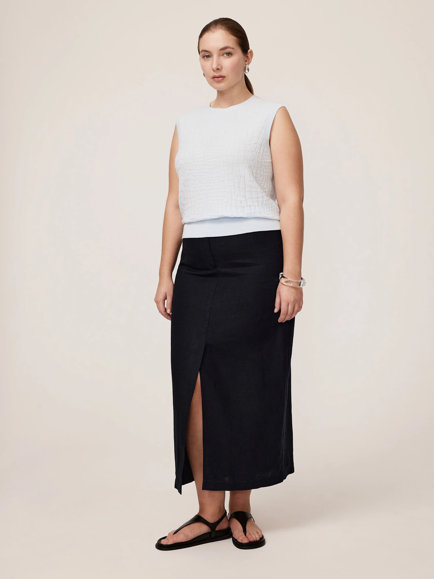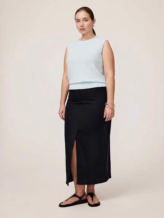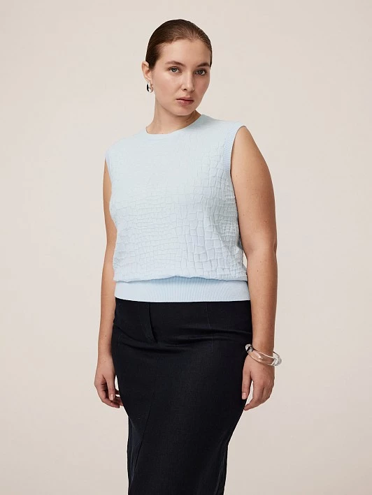 Необычное сочетание повседневного и анималистичного стилей позволило создать невероятно интересную модель. С помощью сложного жаккардового плетения создан фактурный рисунок, напоминающий рельеф крокодилловой кожи. Немалую роль в таких сложных узорах играет качество пряжи - изделие выполнено из нитей на основе воздушной вискозы, которая дарит тактильный комфорт и ощущение прохлады. Добавление полиэстера делает модель износостойкой, сохраняет насыщенность цвета и прочность. Премиальность модели подчеркиваются высоким 12-м классом вязки, который гарантирует тонкость и качество вязаного полотна, что делает изделие долговечным, устойчивым к деформации и приятным к телу. Светло-голубой оттенок, напоминающий прозрачный горный ручей, придает образу аристократизм и сдержанность. Этот универсальный цвет прекрасно сочетается с денимом, кожей или костюмной тканью, позволяя создавать разносторонние образы. Лаконичный крой с круглым вырезом и без рукавов подчеркивает женственную хрупкость и расширяет стилистические возможности модели. Организовали процесс вязки на японской плосковязальной машине Shima Seiki, известной своей безупречной точностью и возможностью создавать вязаные изделия по бесшовной технологии. Цельновязаная основа изделия со сложным переплетением нитей, образующих объемный жаккардовый узор, соединена вручную на кеттельном оборудовании с бейками проймы и горловины. Внимание к деталям позволило применить премиальную обработку, создающую соединения невероятной эластичности. Эта блуза для тех, кто ценит сложное качество и необычную текстуру привычных вещей.