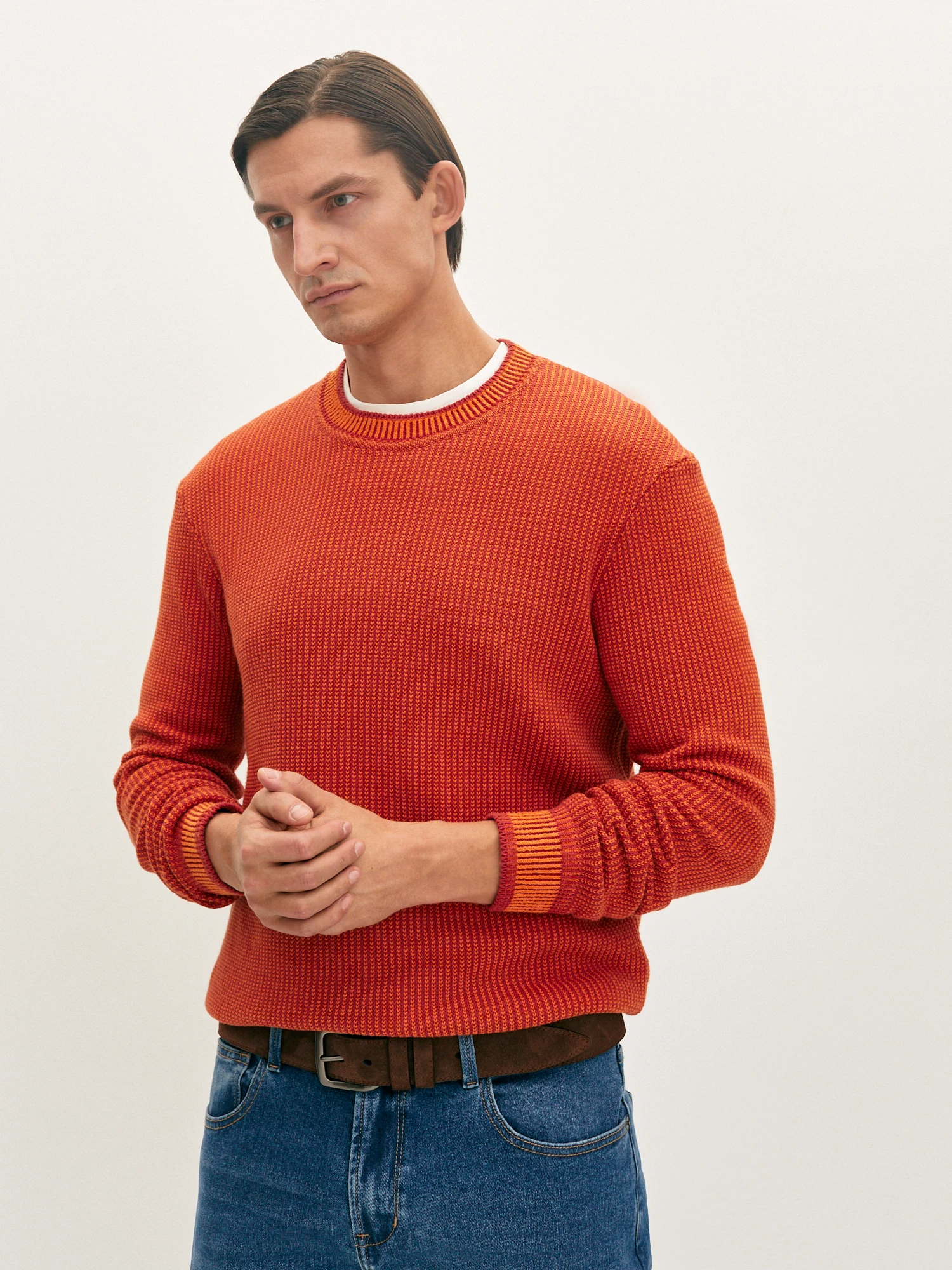 Фактурный джемпер терракотового оттенка разнообразит палитру базового гардероба. Модель прямого силуэта со спущенной линией плеча, длинным рукавом и круглым вырезом горловины. Фактурная отделка горловины и манжет достигается за счет переплетения нитей двух цветов. Вязаный джемпер - отличное решение для создания ярких многослойных весенних образов.