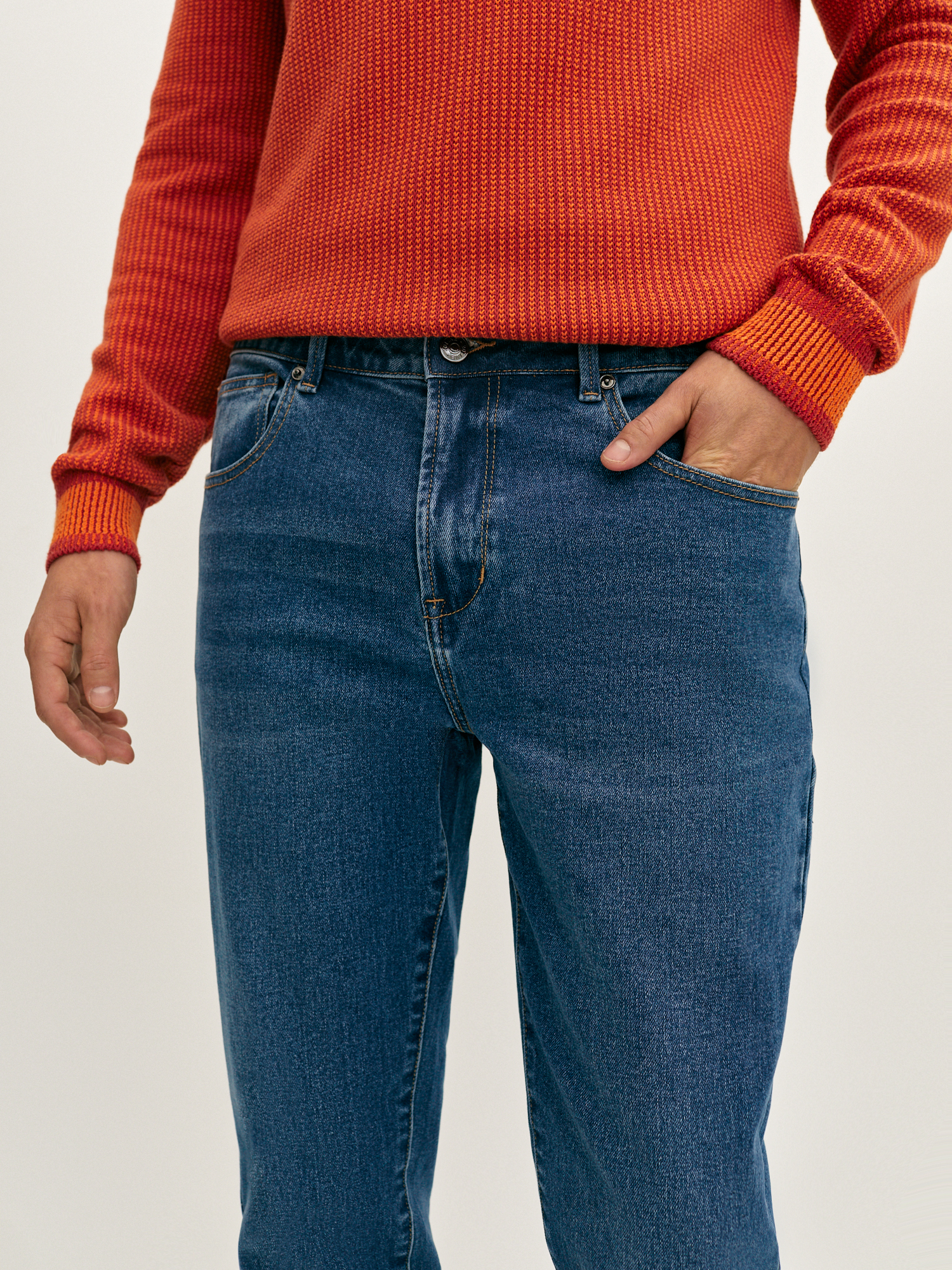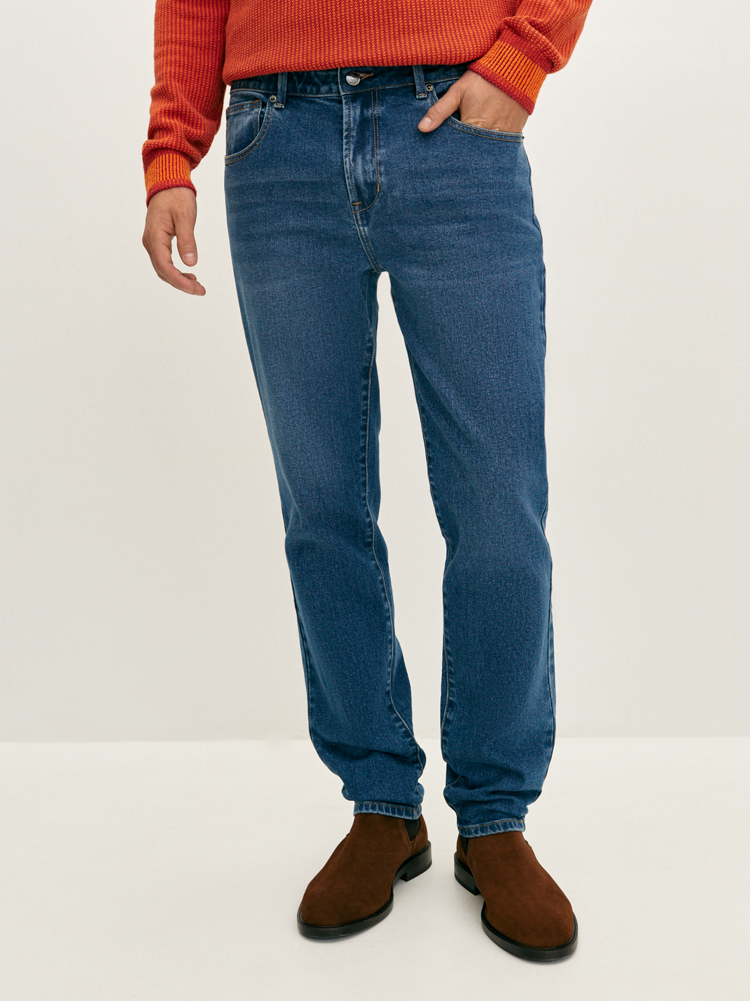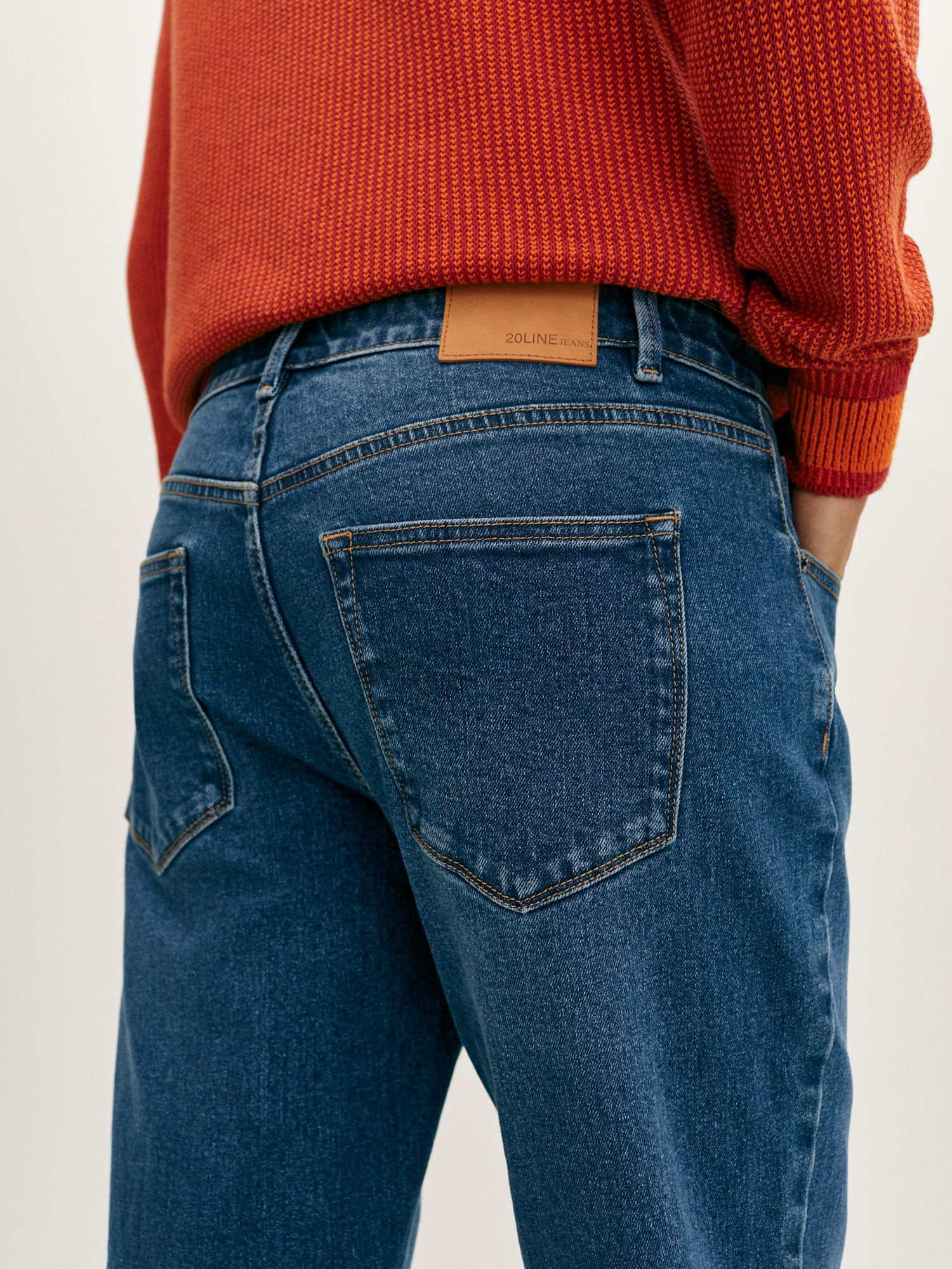 Джинсы классического синего оттенка из эластичной ткани, в которой дышащий хлопок смешан с легкой вискозой и эластаном. Мягкая, но при этом прочная ткань слегка тянется, поэтому модель комфортно садится по фигуре и не теряет со временем форму. Модель со средней посадкой полуприлегающего силуэта, дополнена пятью карманами. Сочетать такие джинсы можно с футболками, толстовками, рубашками и пиджаками.