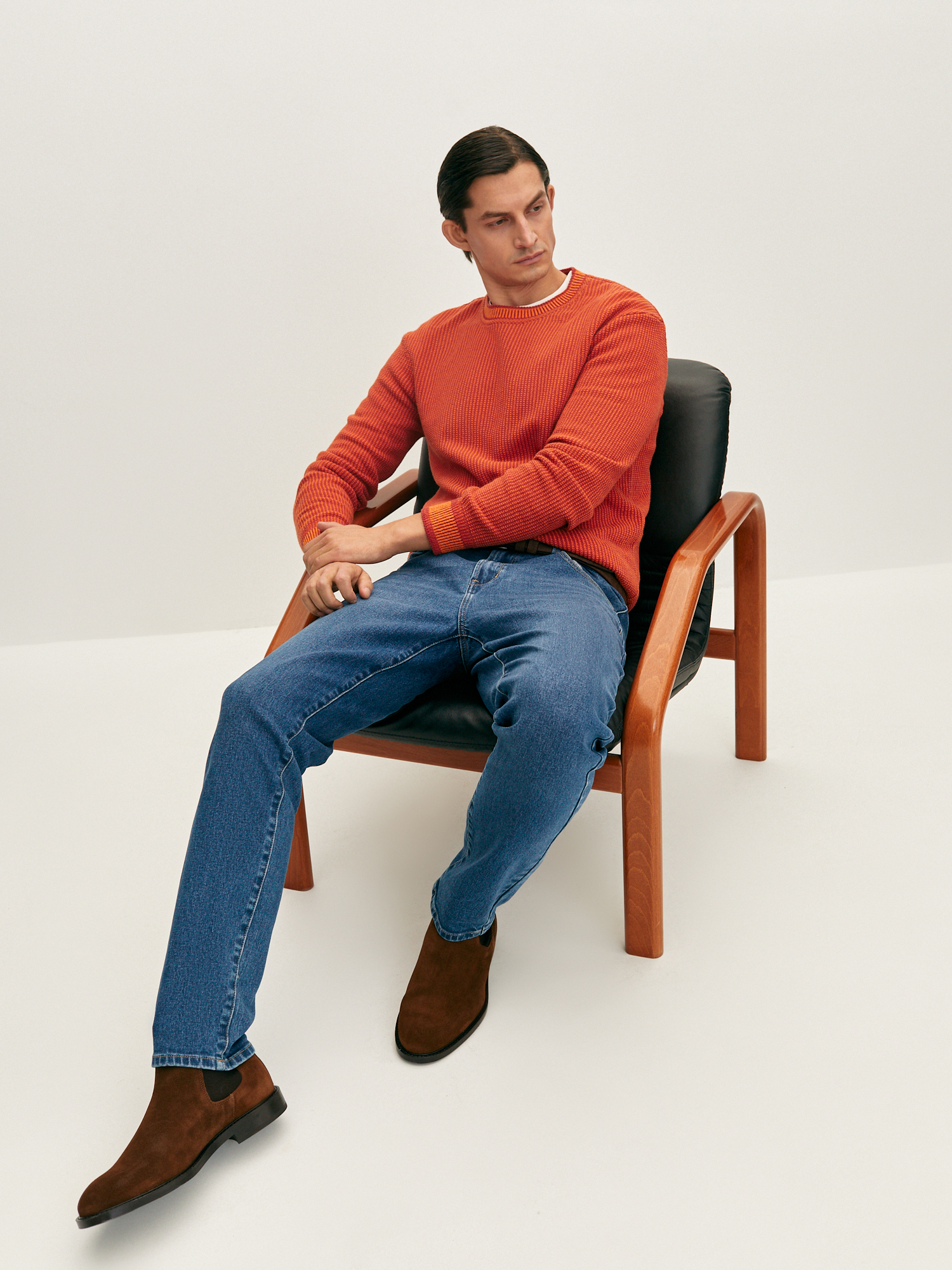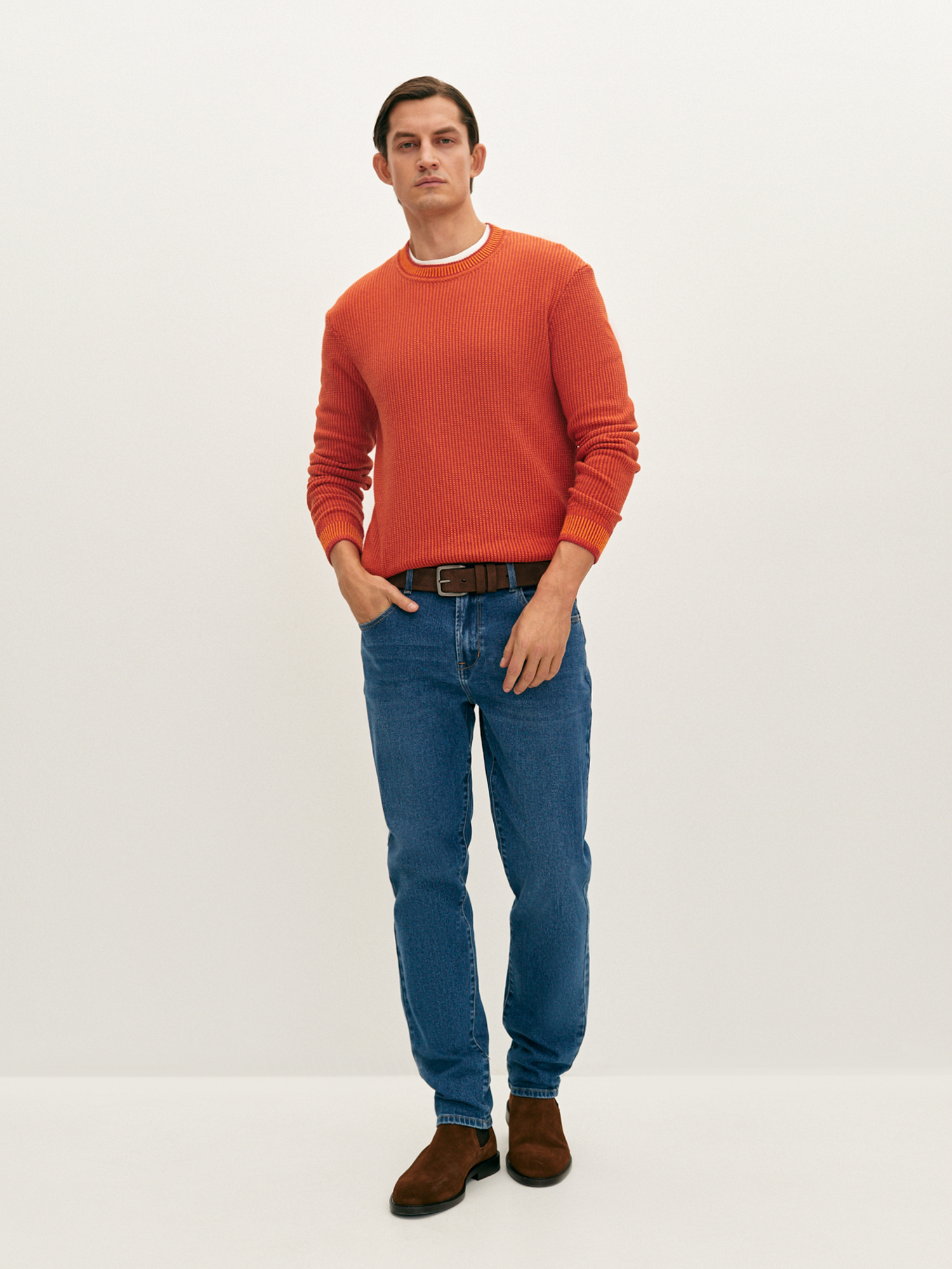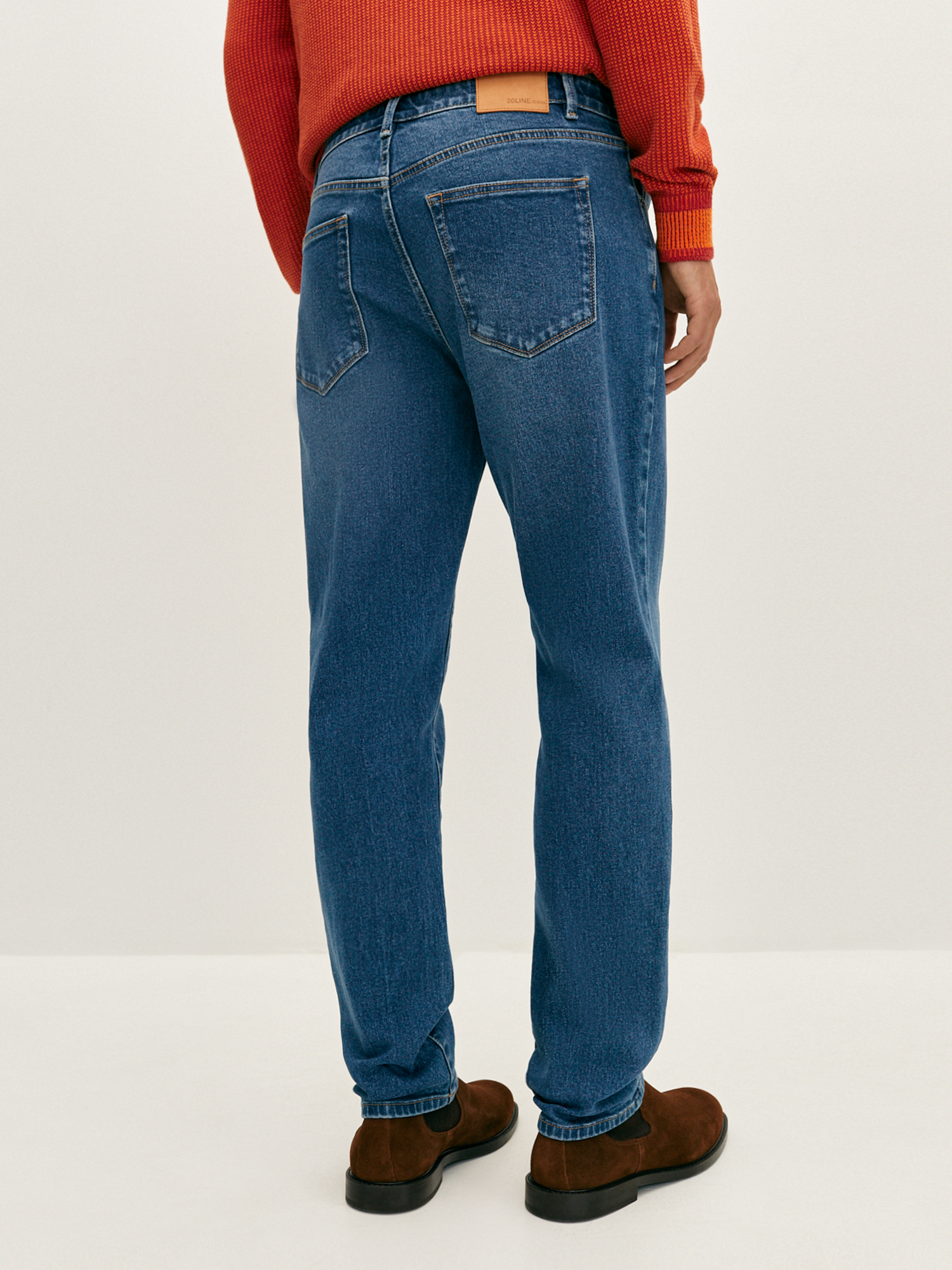 Джинсы классического синего оттенка из эластичной ткани, в которой дышащий хлопок смешан с легкой вискозой и эластаном. Мягкая, но при этом прочная ткань слегка тянется, поэтому модель комфортно садится по фигуре и не теряет со временем форму. Модель со средней посадкой полуприлегающего силуэта, дополнена пятью карманами. Сочетать такие джинсы можно с футболками, толстовками, рубашками и пиджаками.
