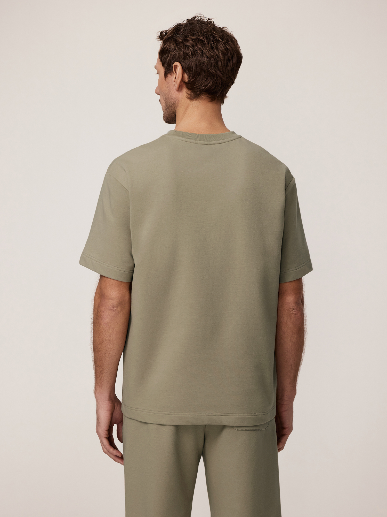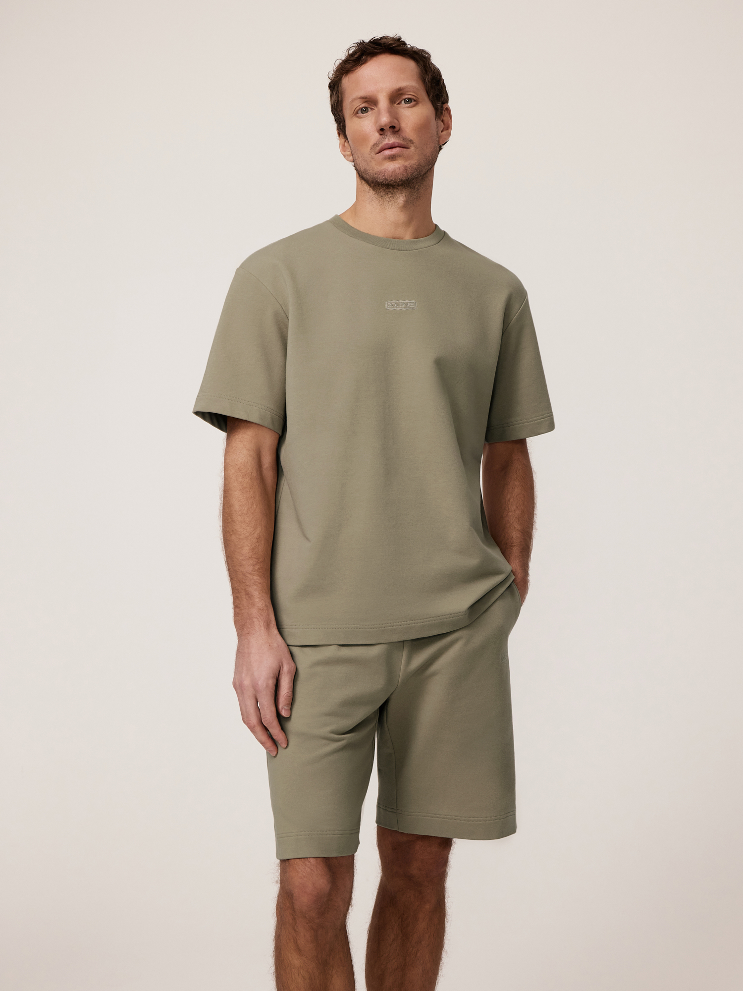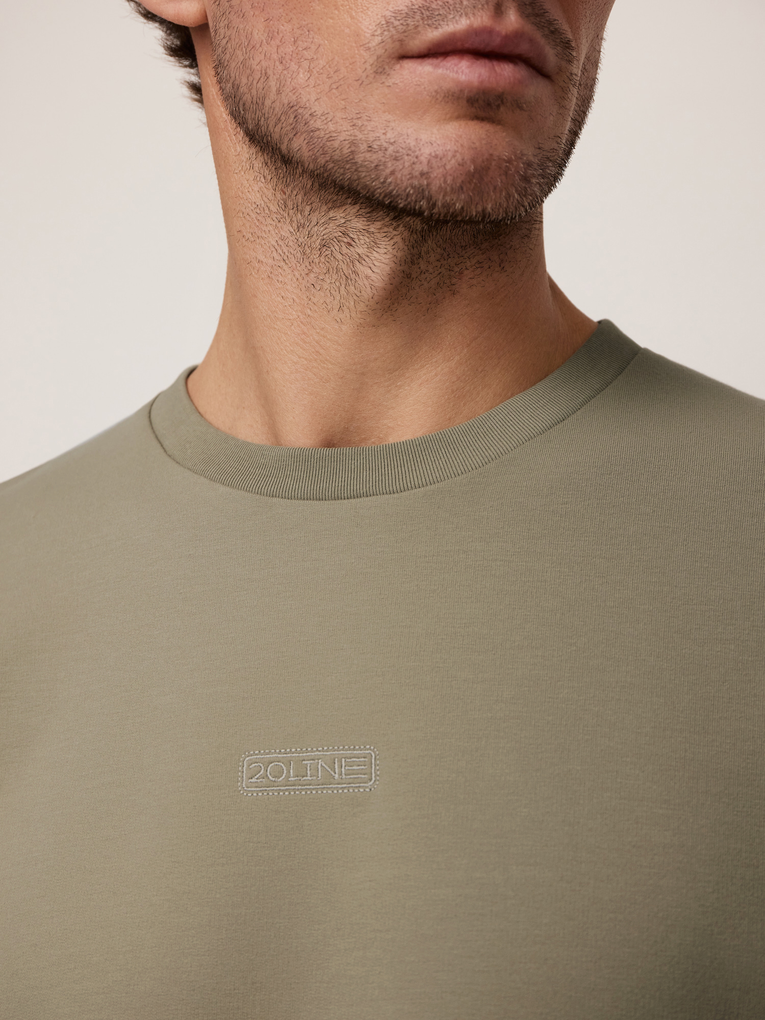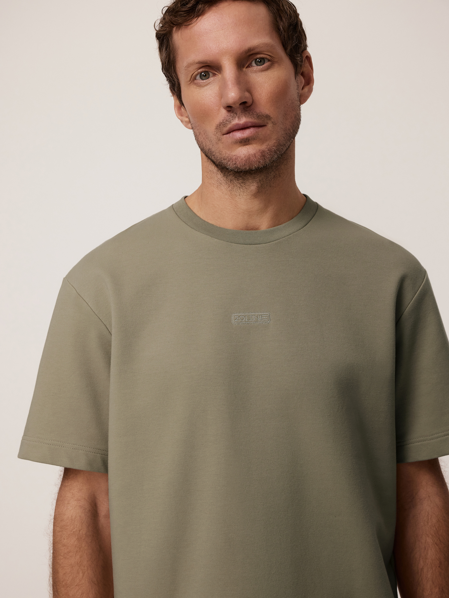 Баланс комфорта и стиля, воплощенный в футболке из футера, обусловлен мягкостью петельчатой изнанки, быстро впитывающей лишнюю влагу и испаряющей ее, а также презентабельностью лицевой стороны. Именно поэтому модели из футера, помимо прочего, хорошо подходят для занятий спортом. Выбранный для изделия оттенок хаки "сухая трава" ассоциируется с природой - высушенной травой, листьями, мхом. Несмотря на свою приглушенность, такой цвет выглядит стильно и изысканно, придавая образу естественную глубину и универсальность. Прямой силуэт с короткими втачными рукавами обеспечивает свободную, но аккуратную посадку, а эластичный футер мягко облегает фигуру, но не стесняет движения. Внимание к деталям говорит о качестве: аккуратная обтачка горловины из трикотажа рибана в тон основной ткани способствует формоустойчивости выреза, а брендовая вышивка на груди, выполненная на профессиональном оборудовании TAJIMA, добавляет модели узнаваемости. Футболка, которая станет компаньоном как для спортивных шорт из капсульной коллекции, так и для повседневных брюк или джинсов — основа базового гардероба и множества стильных образов.