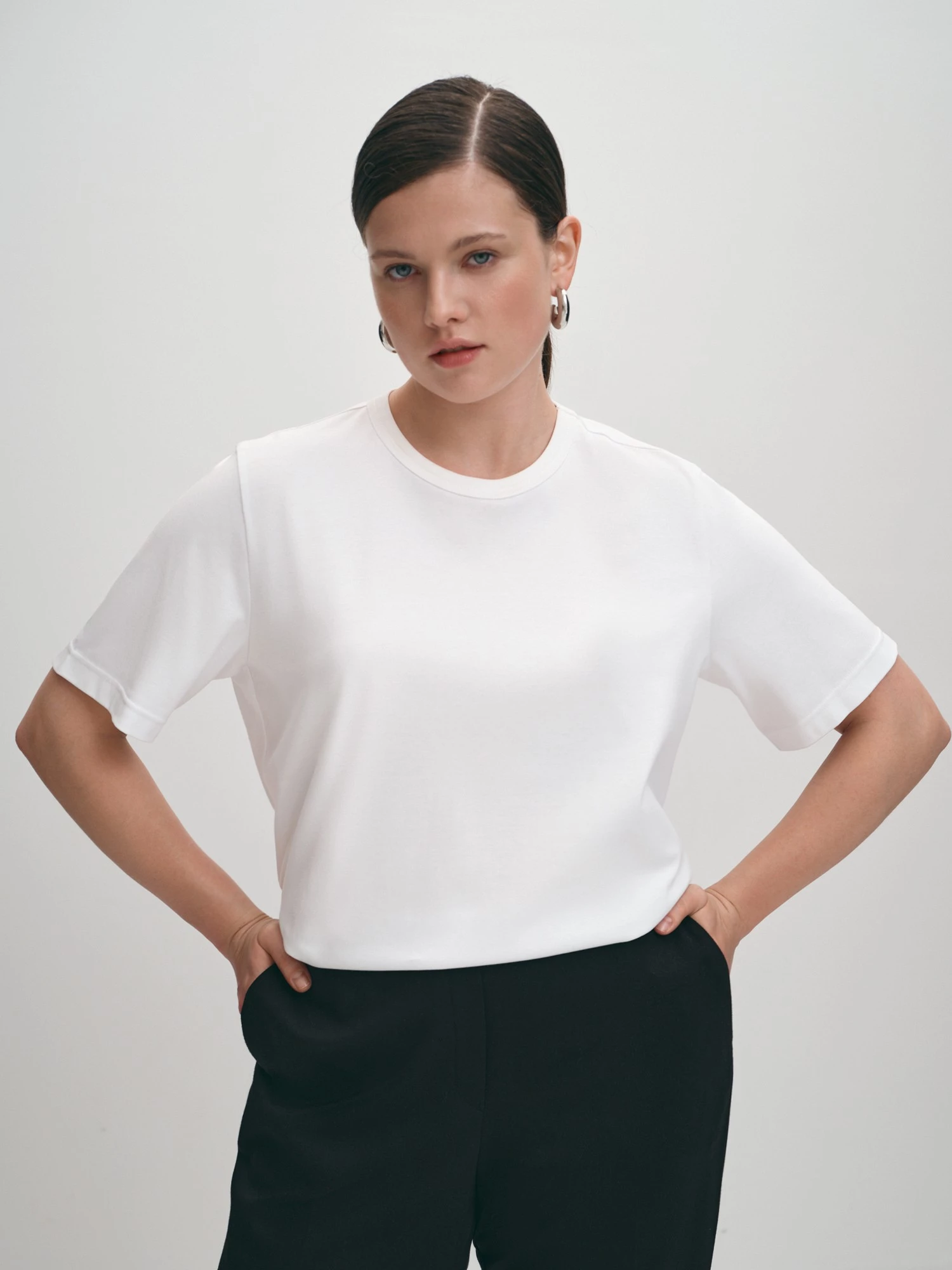 Базовая однотонная футболка из 100% хлопка. Выполнена из качественного трикотажа в оптическом белом. Силуэт прямой, втачной короткий рукав. Если подобрать размер на один-два больше обычного, можно сформировать силуэт оверсайз, он предполагает ношение вещей большого размера, это удобно и стильно. На изделии брендированная вышивка в тон, выполненная на специальном оборудовании фирмы TAJIMA. Футболка будет прекрасным дополнением к джинсам и брюкам из коллекции, а также под пиджак.
