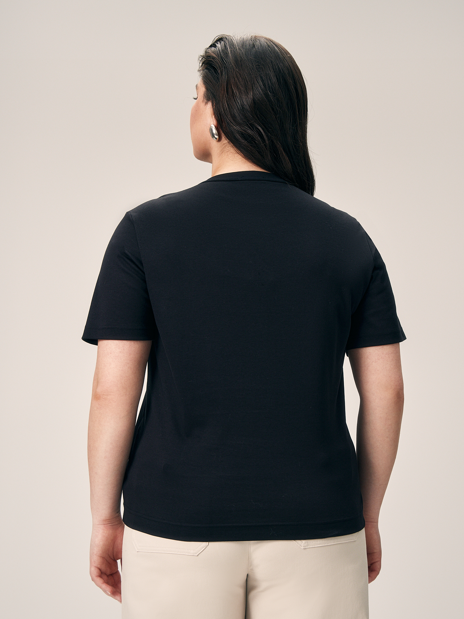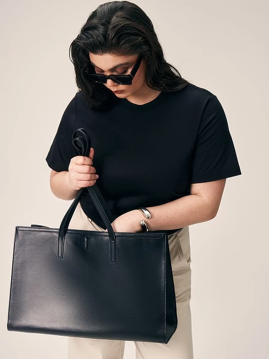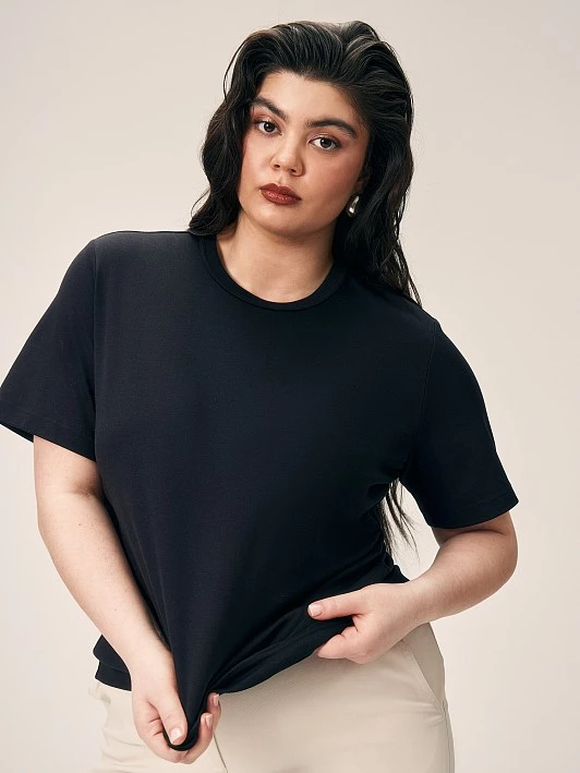 Базовая однотонная футболка из 100% хлопка. Выполнена из качественного трикотажа в классическом черном. Силуэт прямой, втачной короткий рукав. Если подобрать размер на один-два больше обычного, можно сформировать силуэт оверсайз, он предполагает ношение вещей большого размера, это удобно и стильно. На изделии брендированная вышивка в тон, выполненная на специальном оборудовании фирмы TAJIMA. Футболка будет прекрасным дополнением к джинсам и брюкам из коллекции, а также под пиджак.