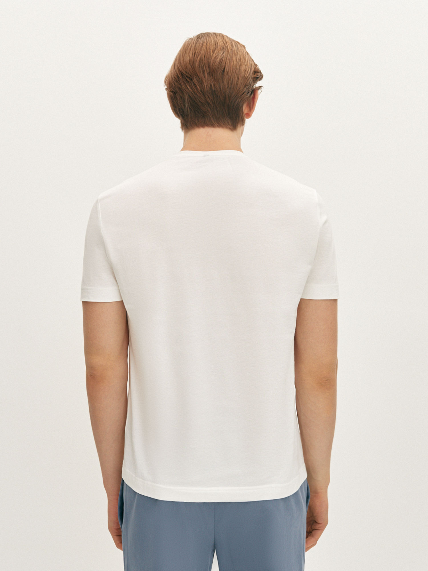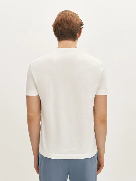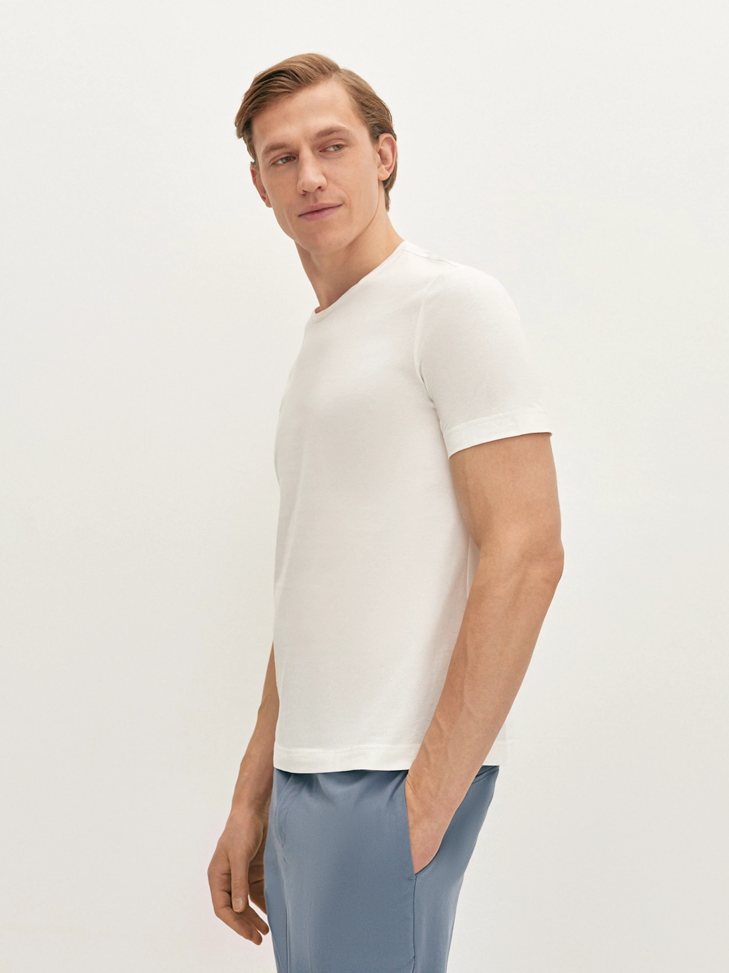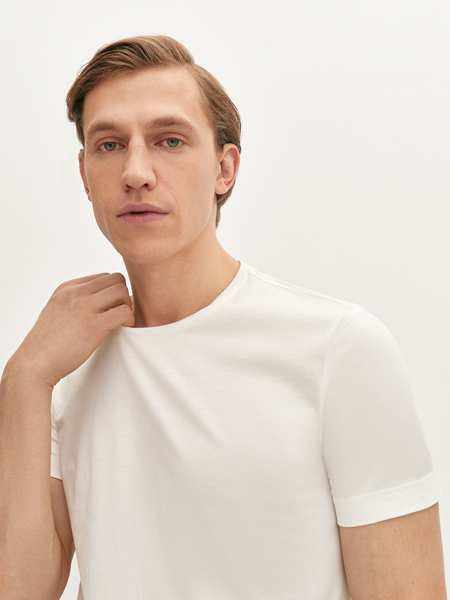 Универсальная футболка базового белого цвета из натурального хлопка. Модель полуприлегающего силуэта с коротким втачным рукавом и круглой горловиной. Эта лаконичная футболка идеально сочетается с любыми брюками или джинсами, что делает ее идеальным выбором для повседневных образов.