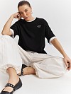 Черная футболка свободного кроя с контрастной надписью выполнена из 100% мягкого хлопка. Материал хорошо пропускает воздух и сохраняет ощущение комфорта на весь день. Модель прямого кроя со спущенной линией плеча отлично сидит по фигуре и не сковывает движений. Лаконичная футболка отлично сочетается с любыми брюками, джинсами или шортами, что делает ее идеальным выбором для создания городского образа любой сложности.