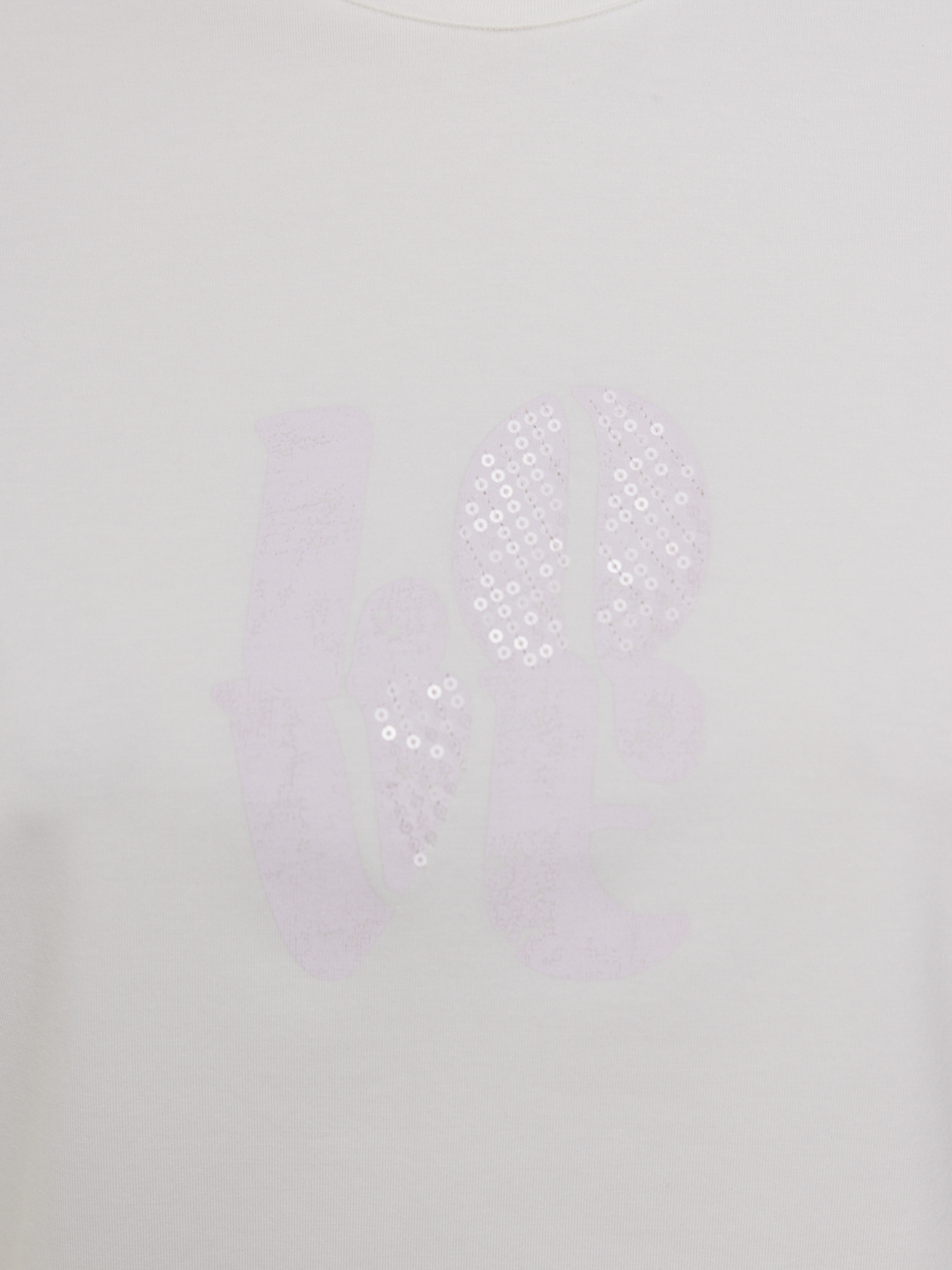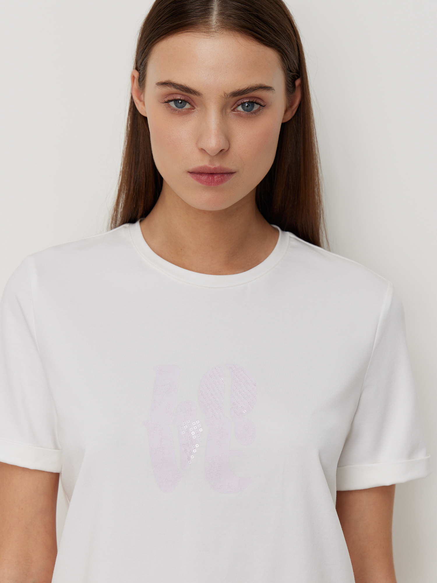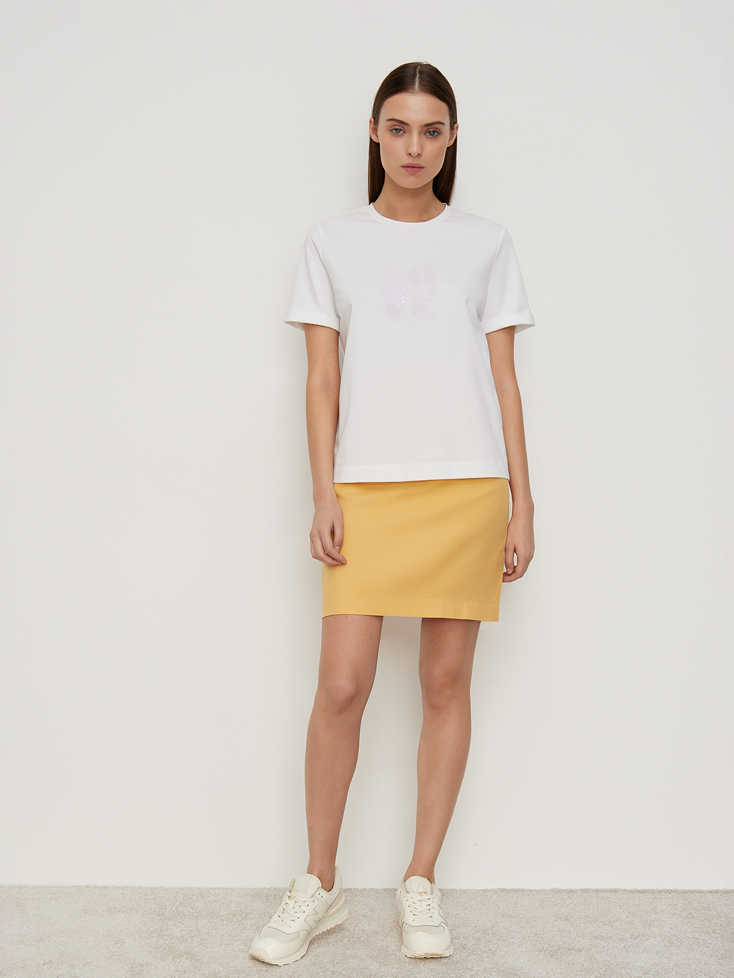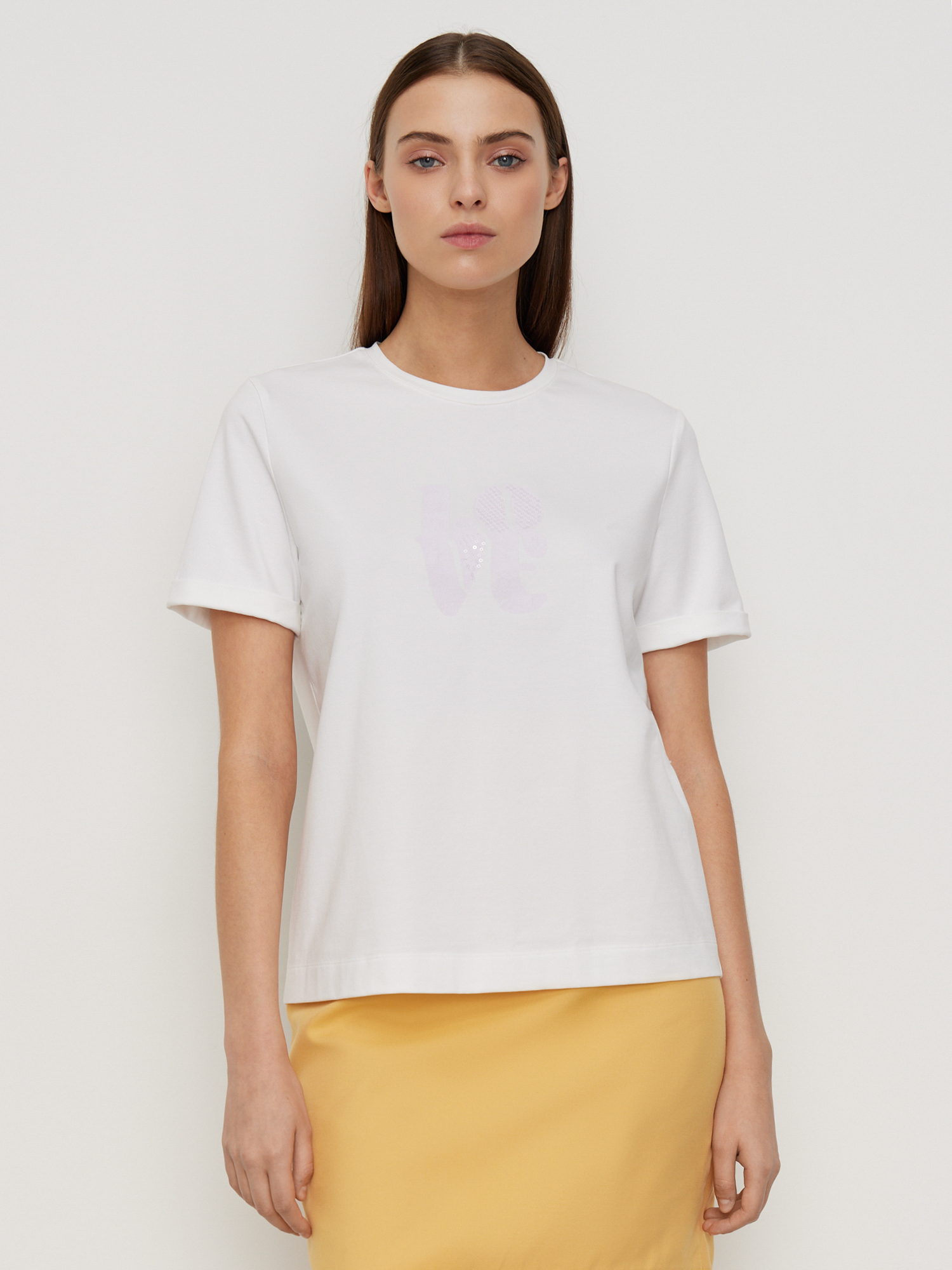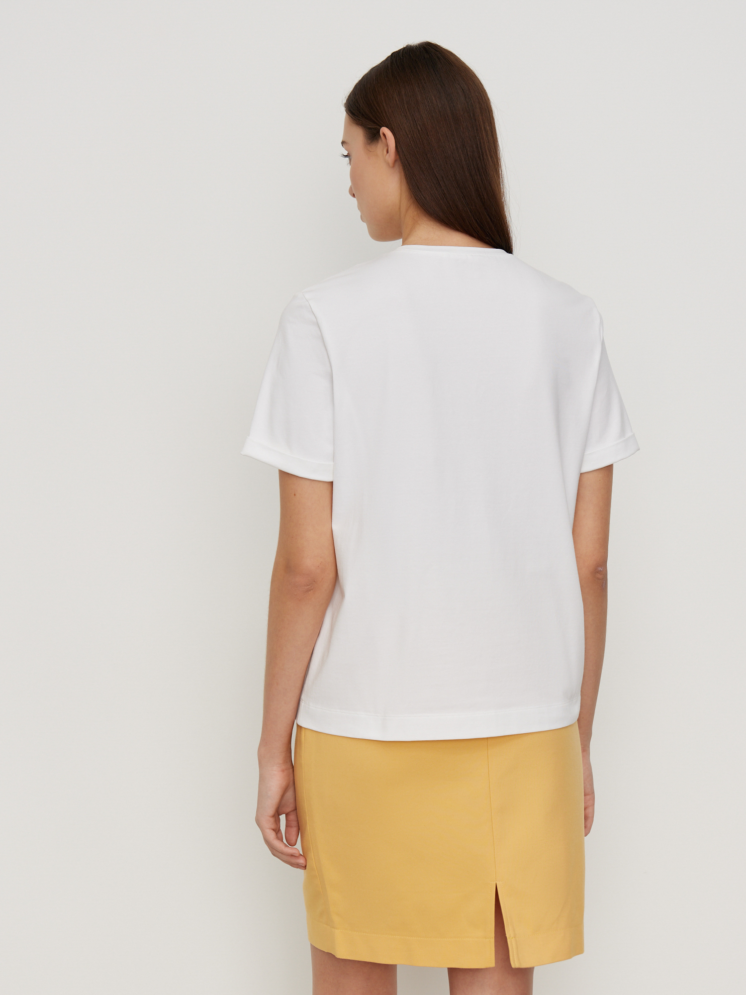 Универсальная белоснежная футболка из натурального хлопкового полотна. Мягкая и дышащая ткань станет идеальным решением для любой погоды. Модель прямого кроя с втачными рукавами и круглой горловиной, обработанной бейкой. Авторский мерцающий принт не разрушает монохромности образа. Базовая вещь легко впишется в стилистику любого лука. Можно сочетать с юбками или джинсами из той же коллекции.