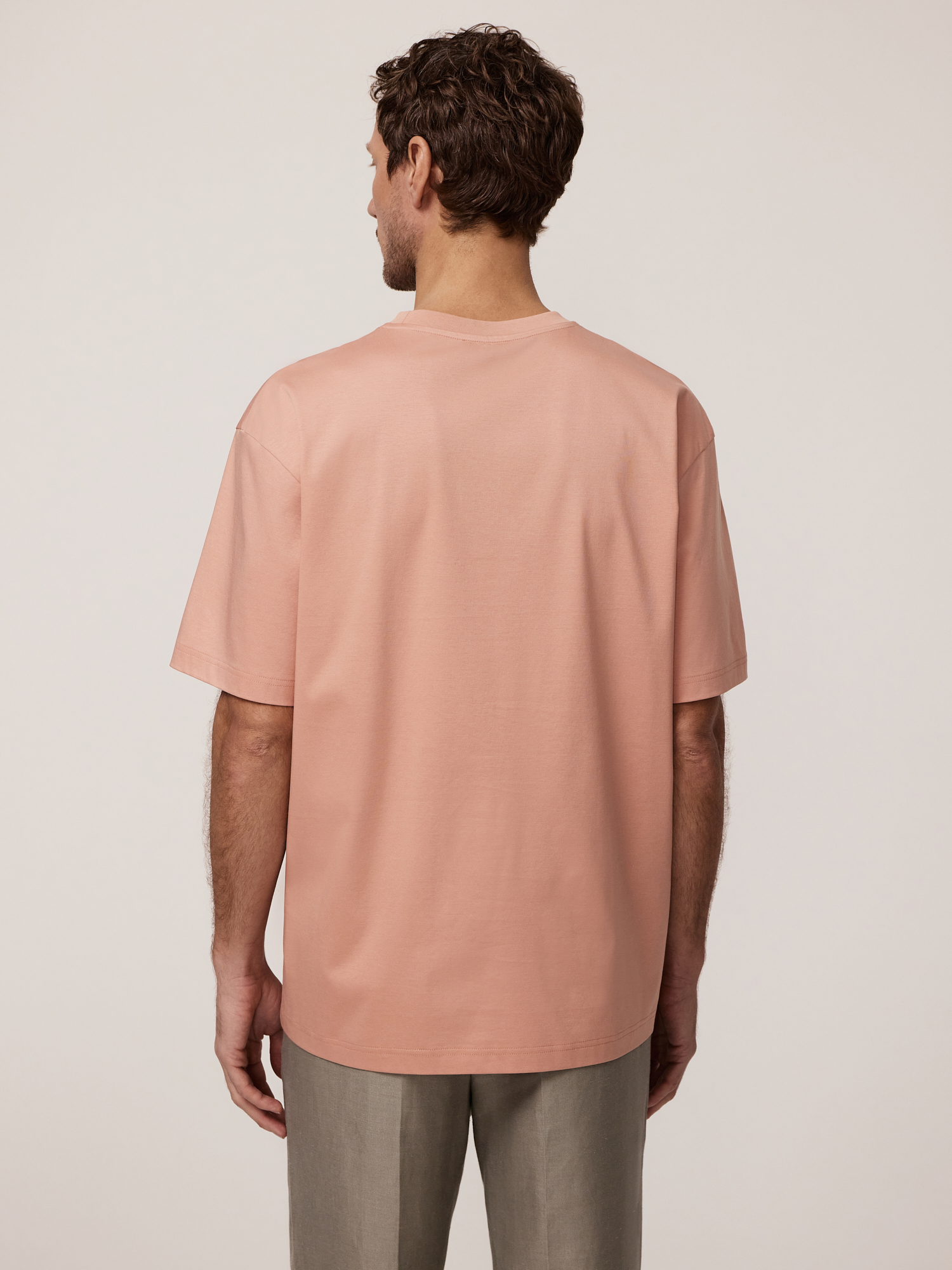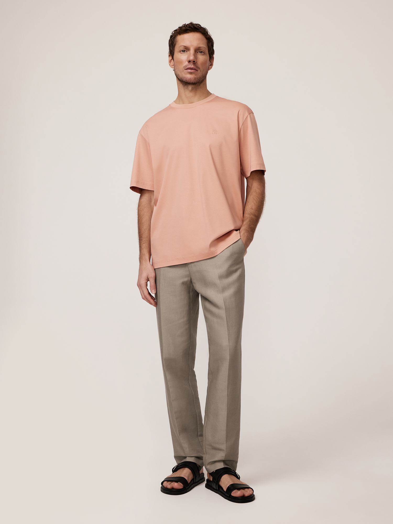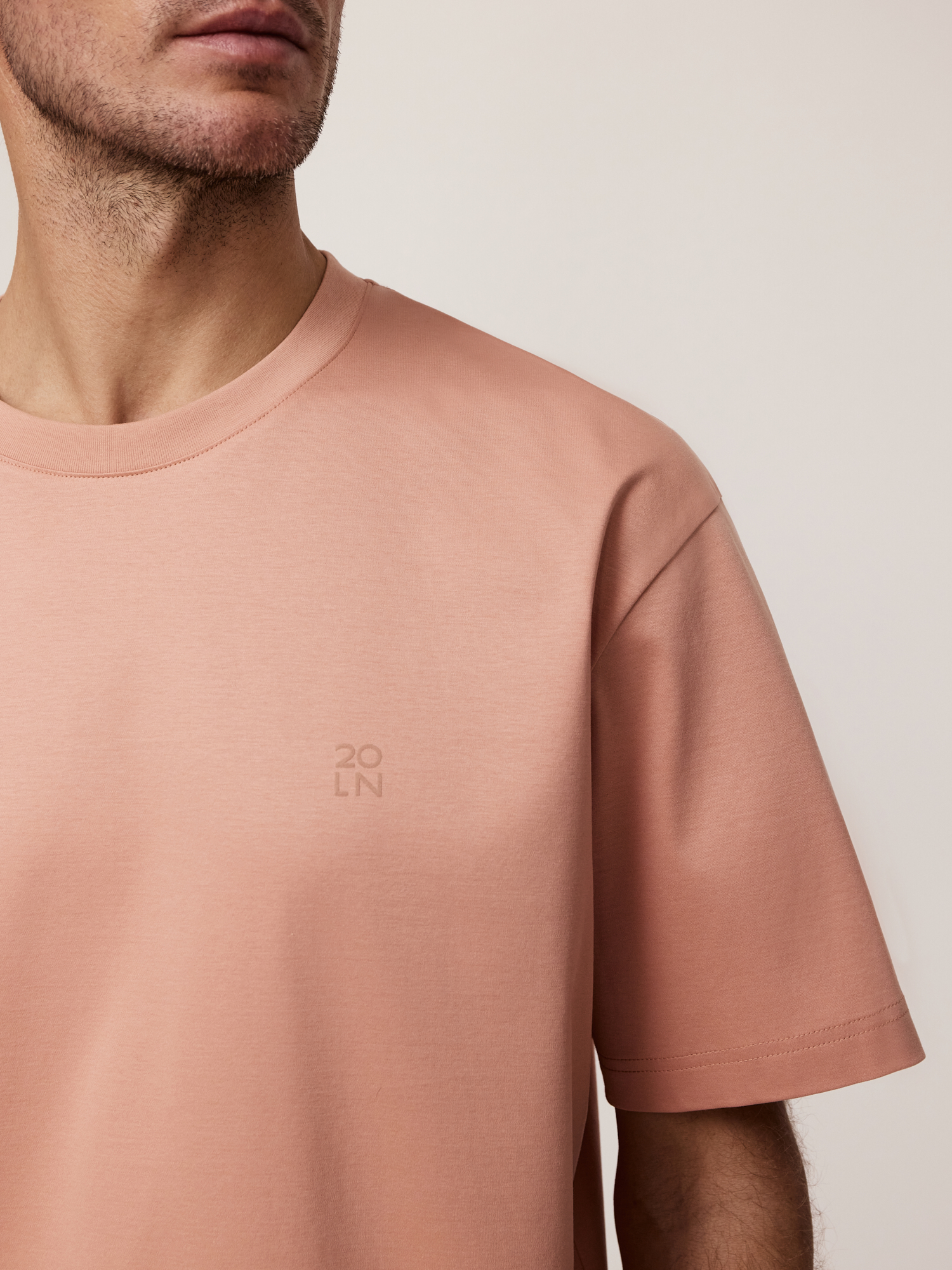 Непринужденность кэжуал эстетики и достижения современной текстильной промышленности повлияли на создание универсальной базовой модели. Выбрали для футболки смесовый персиковый трикотаж с премиальным составом, демонстрирующим высокие эксплуатационные качества. Сочетание мерсеризованного хлопка, люксового шелка и модала из буковой целлюлозы - это идеальный баланс натуральности, комфорта и практичности. Мерсеризованный хлопок – это хлопок премиум-класса, прошедший специальную обработку. Он приобретает особый глянцевый блеск, становится прочнее и устойчивее к износу, сохраняя при этом все достоинства натурального хлопка: безупречную воздухопроницаемость и гипоаллергенность. Такая ткань необыкновенно приятна на ощупь – мягкая, гладкая и удивительно нежная к коже. Шёлк – эталон роскоши среди тканей. Он придаёт материалу струящуюся лёгкость, изысканный благородный блеск и способность красиво драпироваться. Шёлк обладает природной терморегуляцией – в жару дарит прохладу, а в прохладную погоду сохраняет тепло. Кроме того, он гипоаллергенен и невероятно прочен, несмотря на кажущуюся хрупкость. Модал – современное высокотехнологичное волокно, получаемое из натуральной целлюлозы. Оно сочетает в себе лучшие свойства натуральных тканей: мягче хлопка, впитывает на 50% больше влаги, чем хлопок, обладает антибактериальными свойствами и при этом совершенно не мнётся. Модал придаёт ткани дополнительную эластичность, делает её приятно прохладной на ощупь и обеспечивает идеальную посадку по фигуре. Крой regular обеспечивает комфортную посадку, подходящую для каждой фигуры. Круглый вырез с отделкой из хлопкового трикотажа «рибана» лаконичен и подходит для многослойных образов. Короткие рукава обеспечивают комфорт и идеальны для теплой погоды. Особое внимание привлекает брендированный принт, нанесенный на собственном производстве с помощью высокоточного оборудования для печати по ткани — такая деталь добавляет образу индивидуальности, без ущерба общей гармонии образа. Модель для мужчин, которые ценят комфортную и универсальную одежду, созданную с вниманием к деталям.