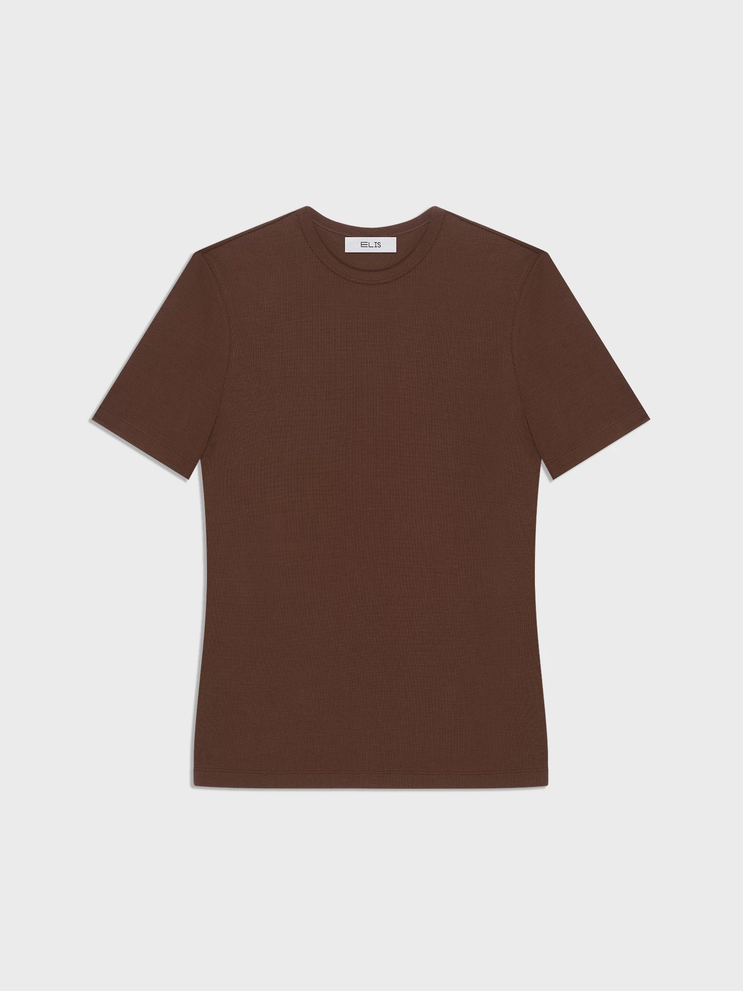 Облегающая футболка с круглым вырезом и отделкой горловины бейкой - актуальный участник базового гардероба в благородном коричневом оттенке.